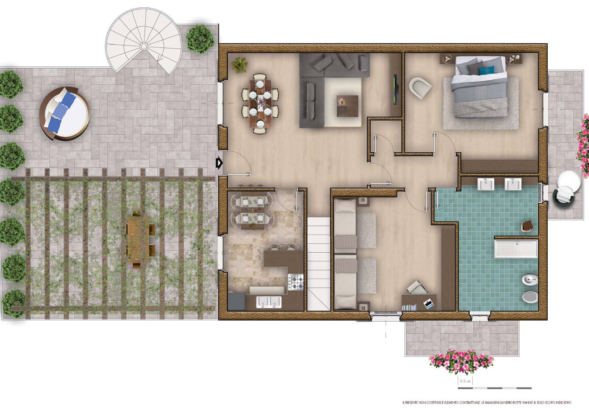 Posto in piccolo contesto condominiale, composto da ingresso indipendente su giardino con porticato, ampio soggiorno, cucina separata con accesso sul giardino, disimpegno notte, due camere da letto, ripostiglio e bagno. Al piano inferiore troviamo graziosa taverna con locale lavanderia, secondo bagno e collegamento diretto all'autorimessa doppia.