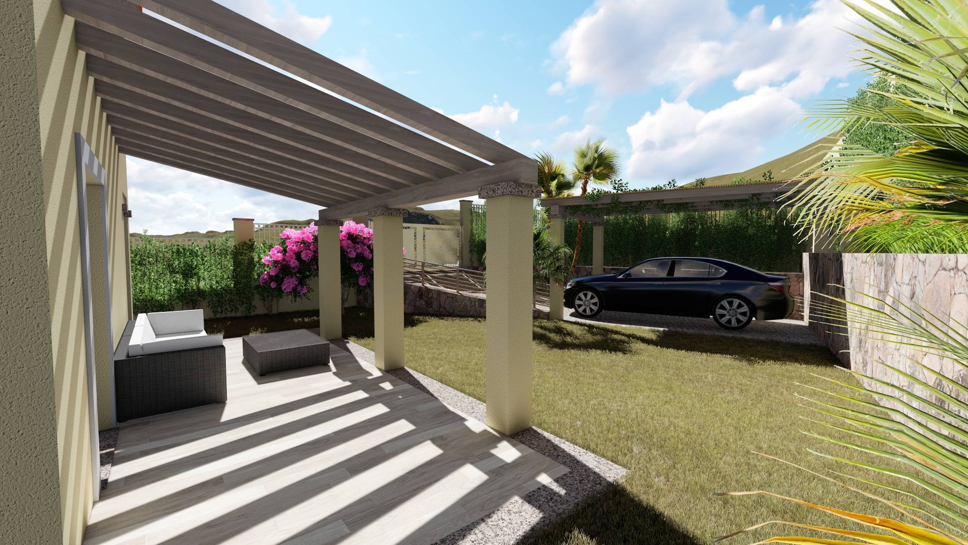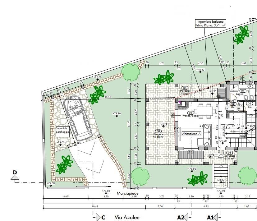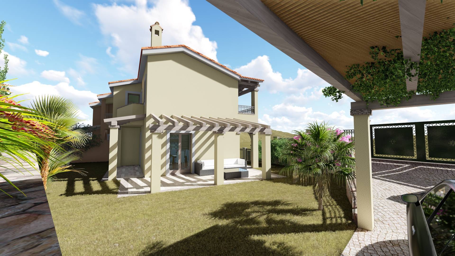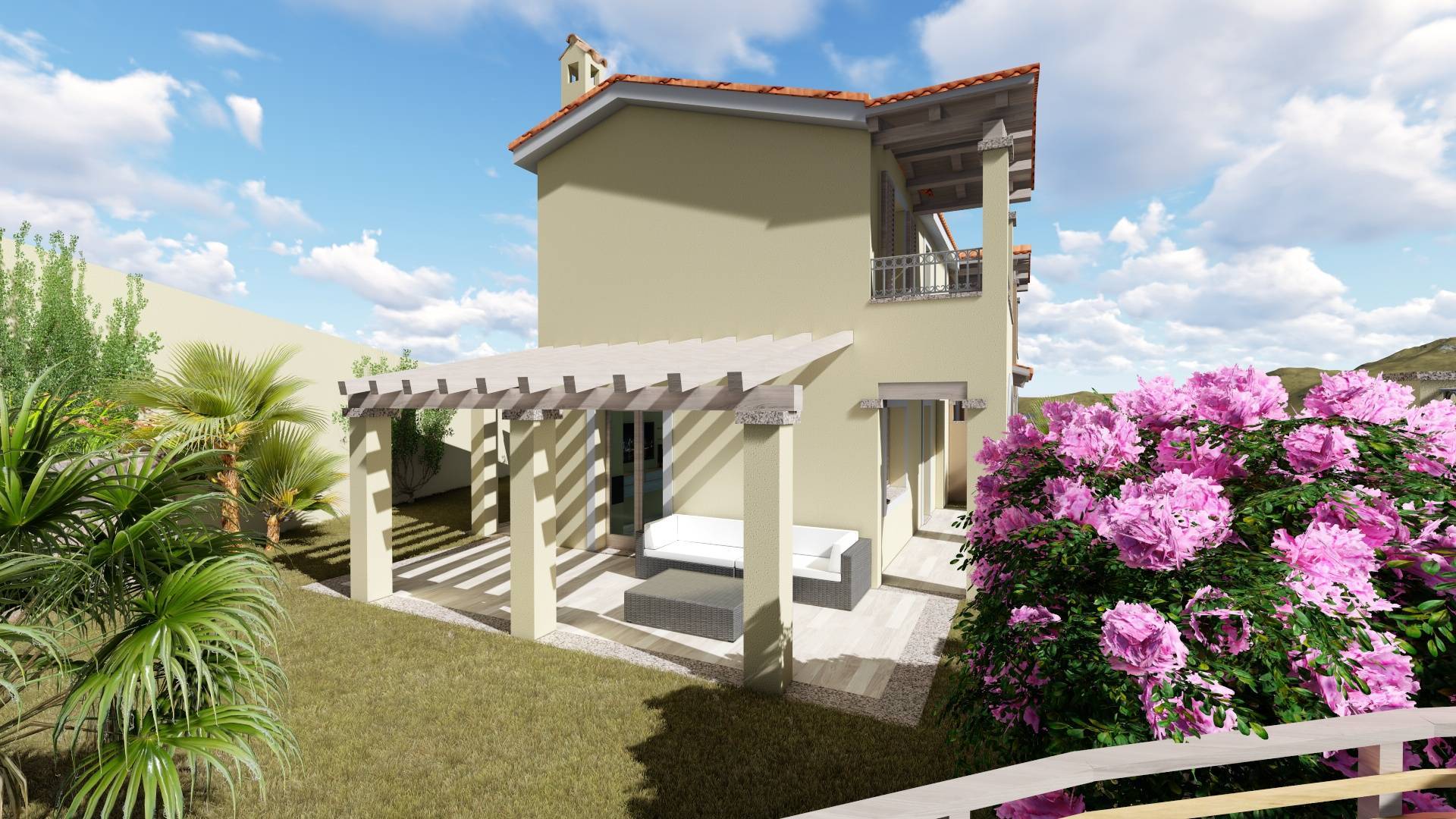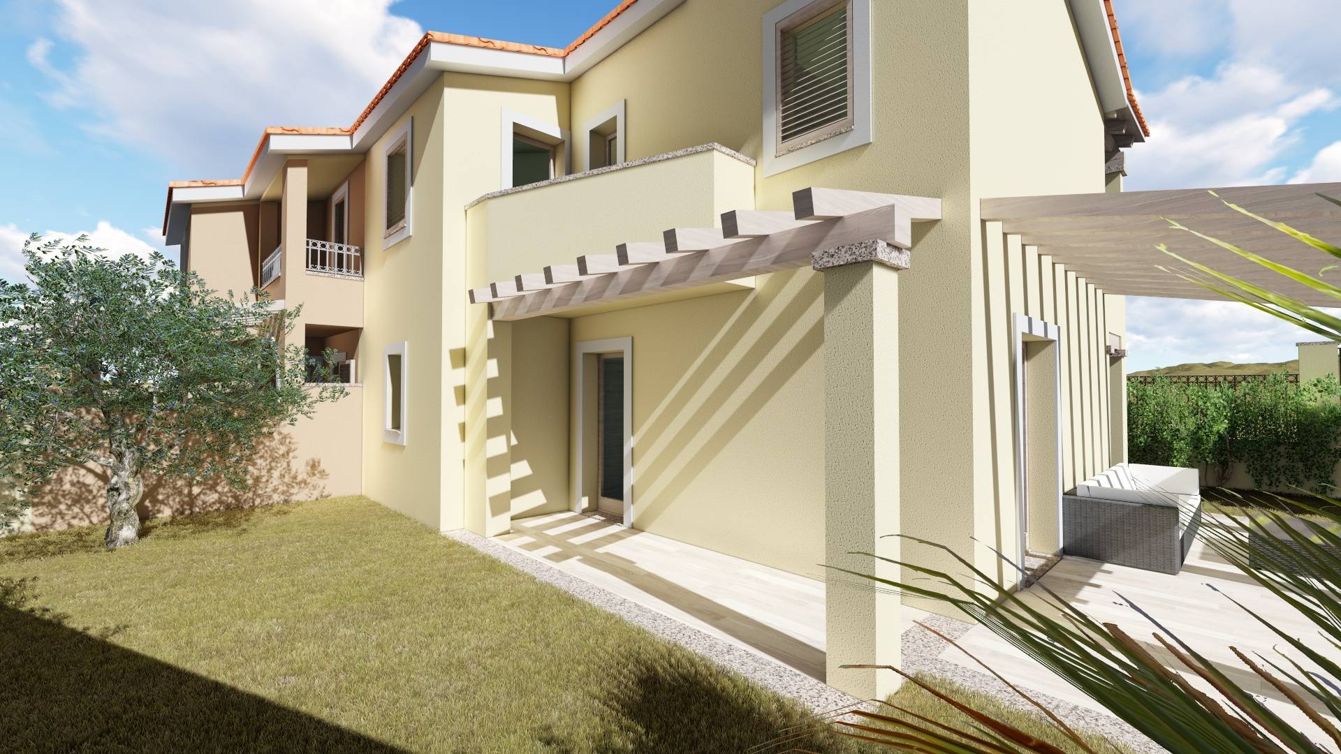 La villetta è circondata su tre lati da un giardino di 215 mq dove sarà presente un posto auto coperto.
