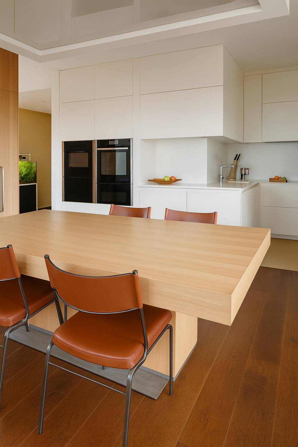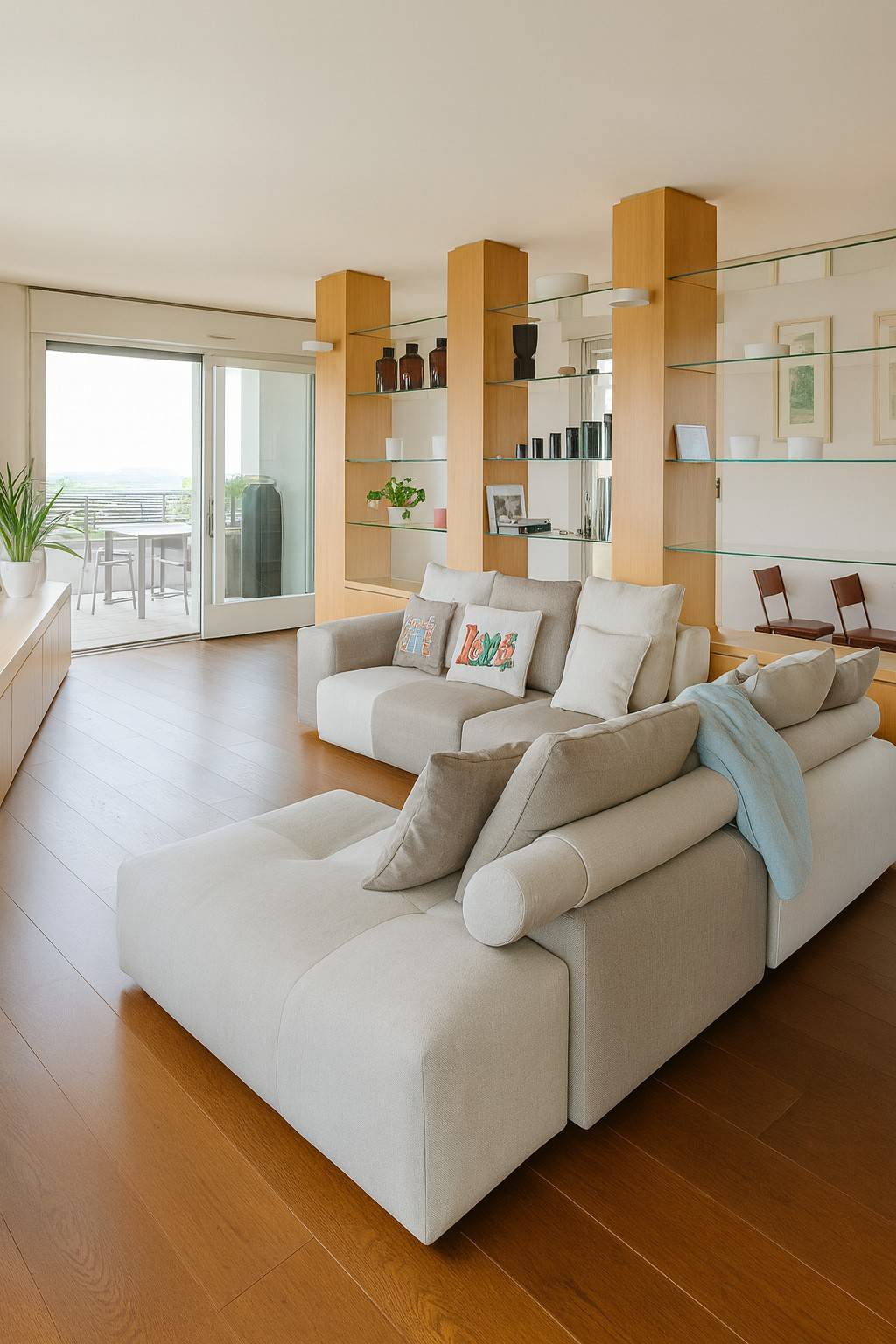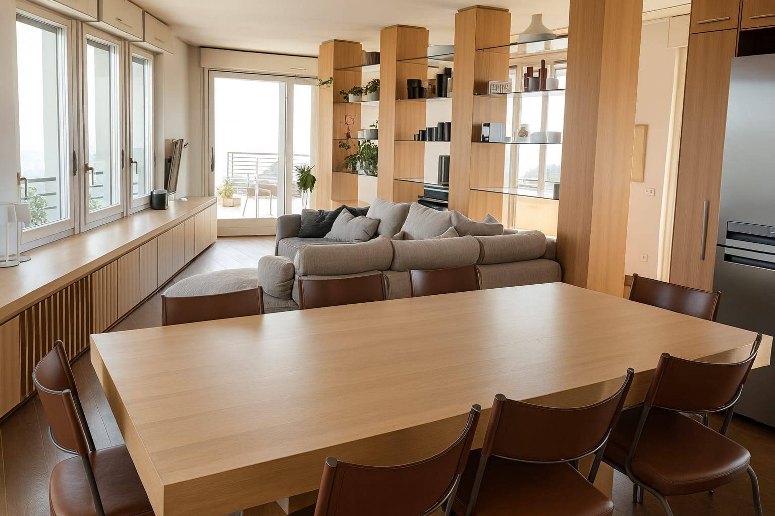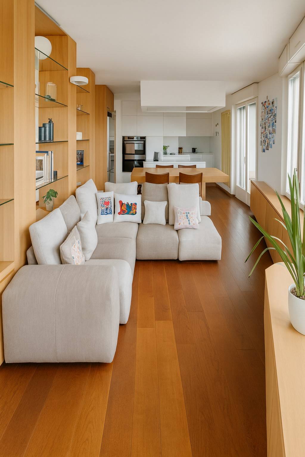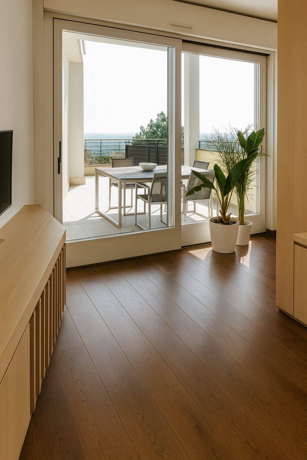 La zona giorno è spaziosa, con cucina a vista e accesso diretto alla terrazza principale.