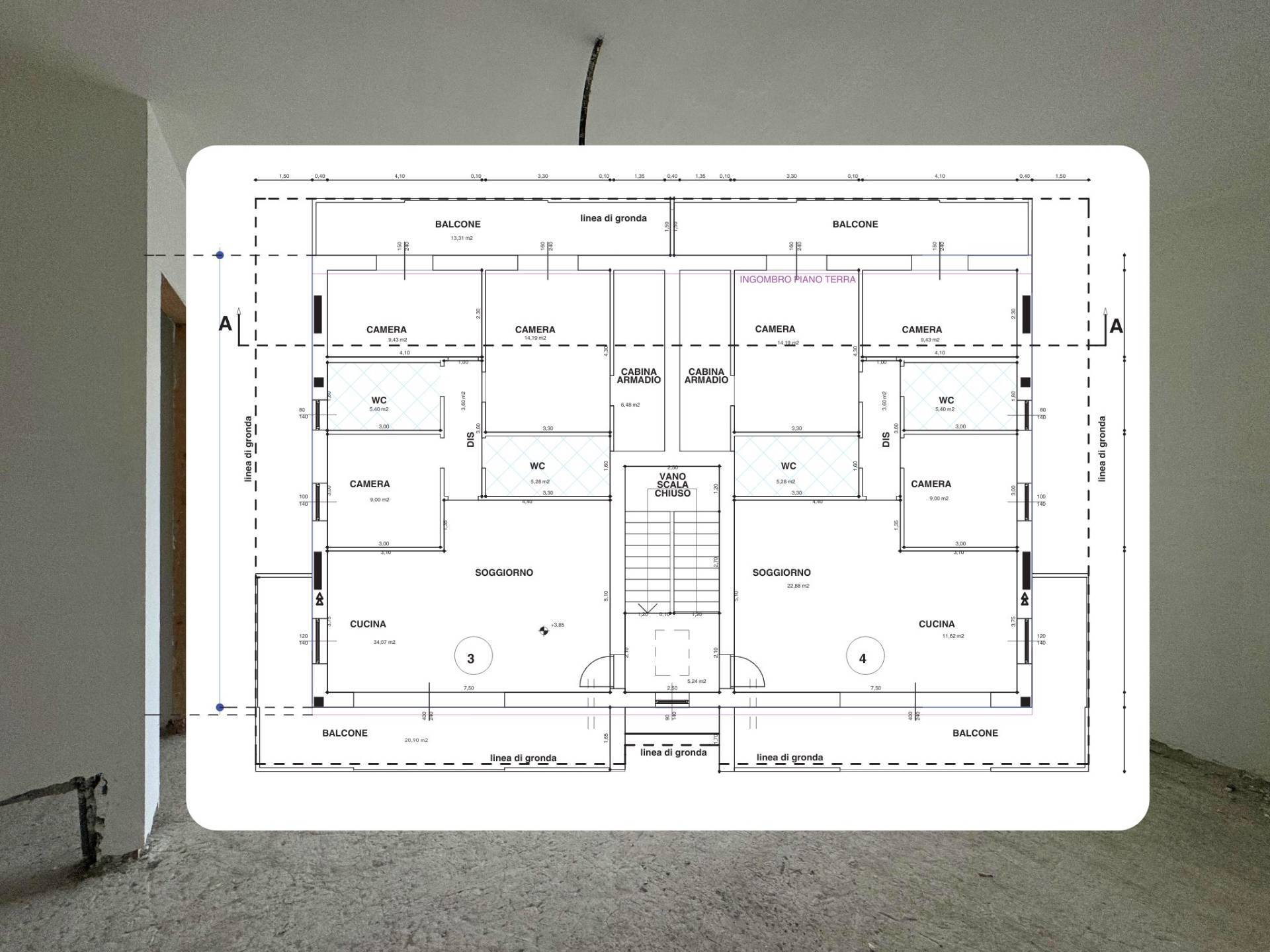 L'appartamento è composto dalla zona giorno Open-Space con affaccio sul giardino privato, la zona notte è composta dalla camera da letto matrimoniale con cabina armadio, seconda camera da letto, terza camera da letto e bagno.