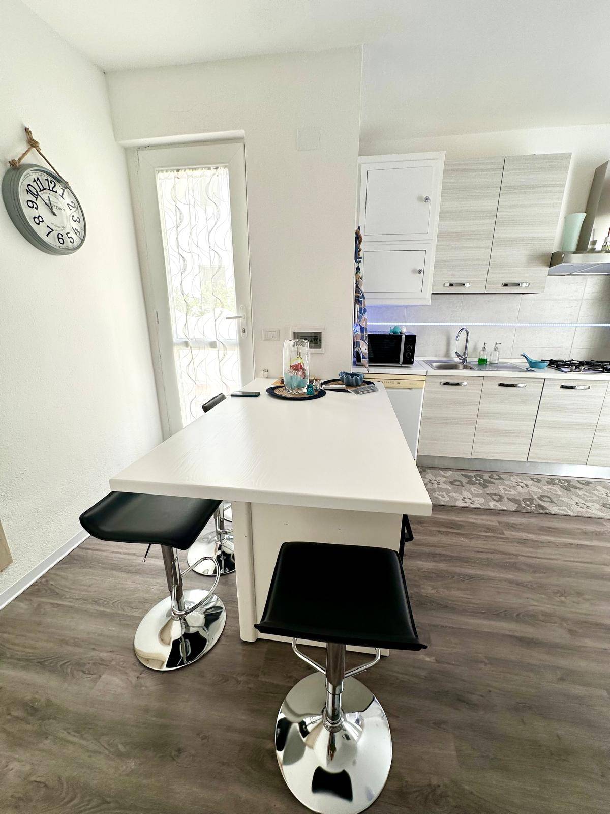 La cucina è completamente arredata con mobili moderni e funzionali. L'appartamento è composto da quattro locali, di cui due camere da letto spaziose e luminose, perfette per ospitare una famiglia o per creare uno spazio privato per gli ospiti.