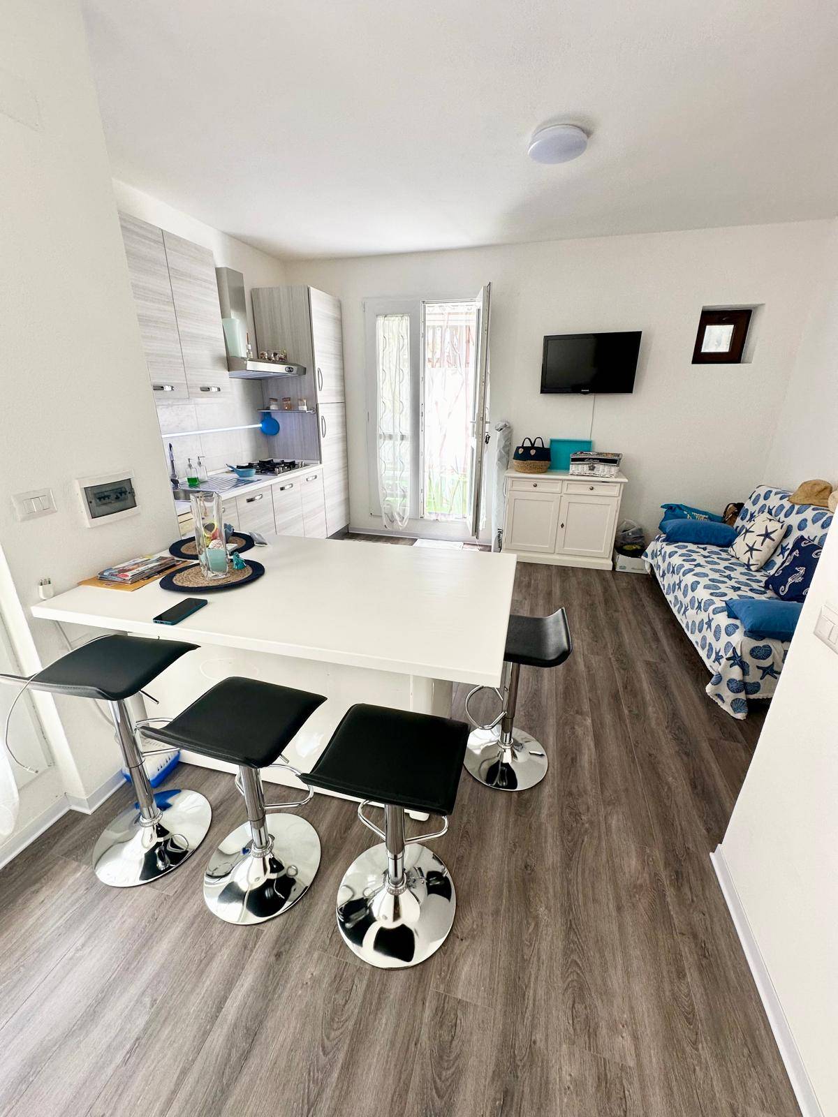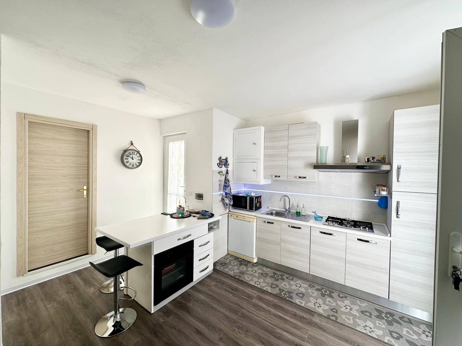 La zona giorno è composta da un soggiorno luminoso con cucina a vista, ideale per trascorrere piacevoli momenti in compagnia.