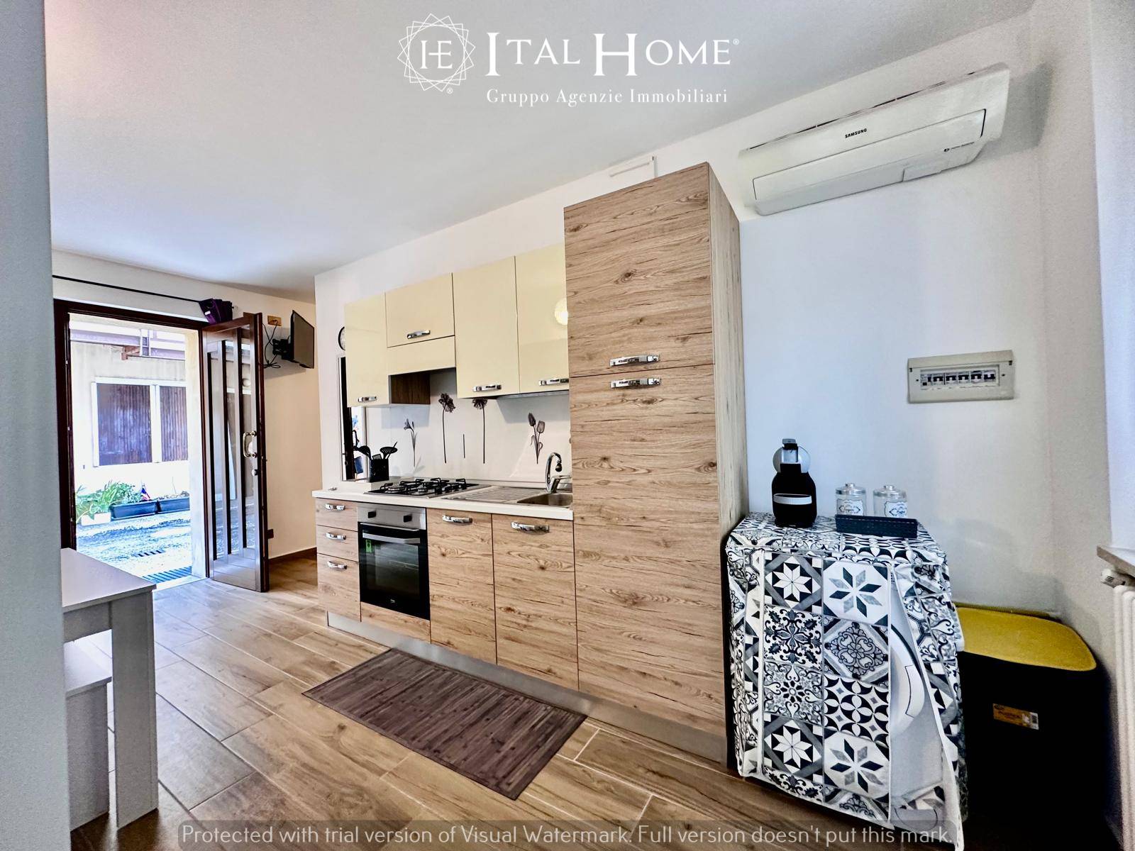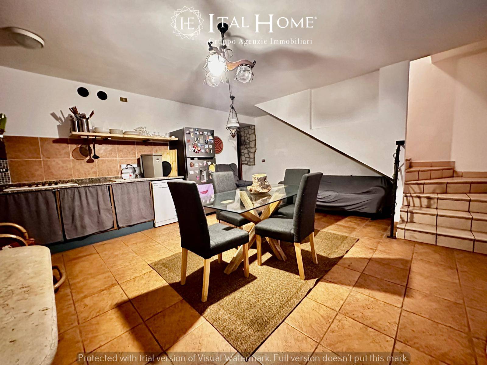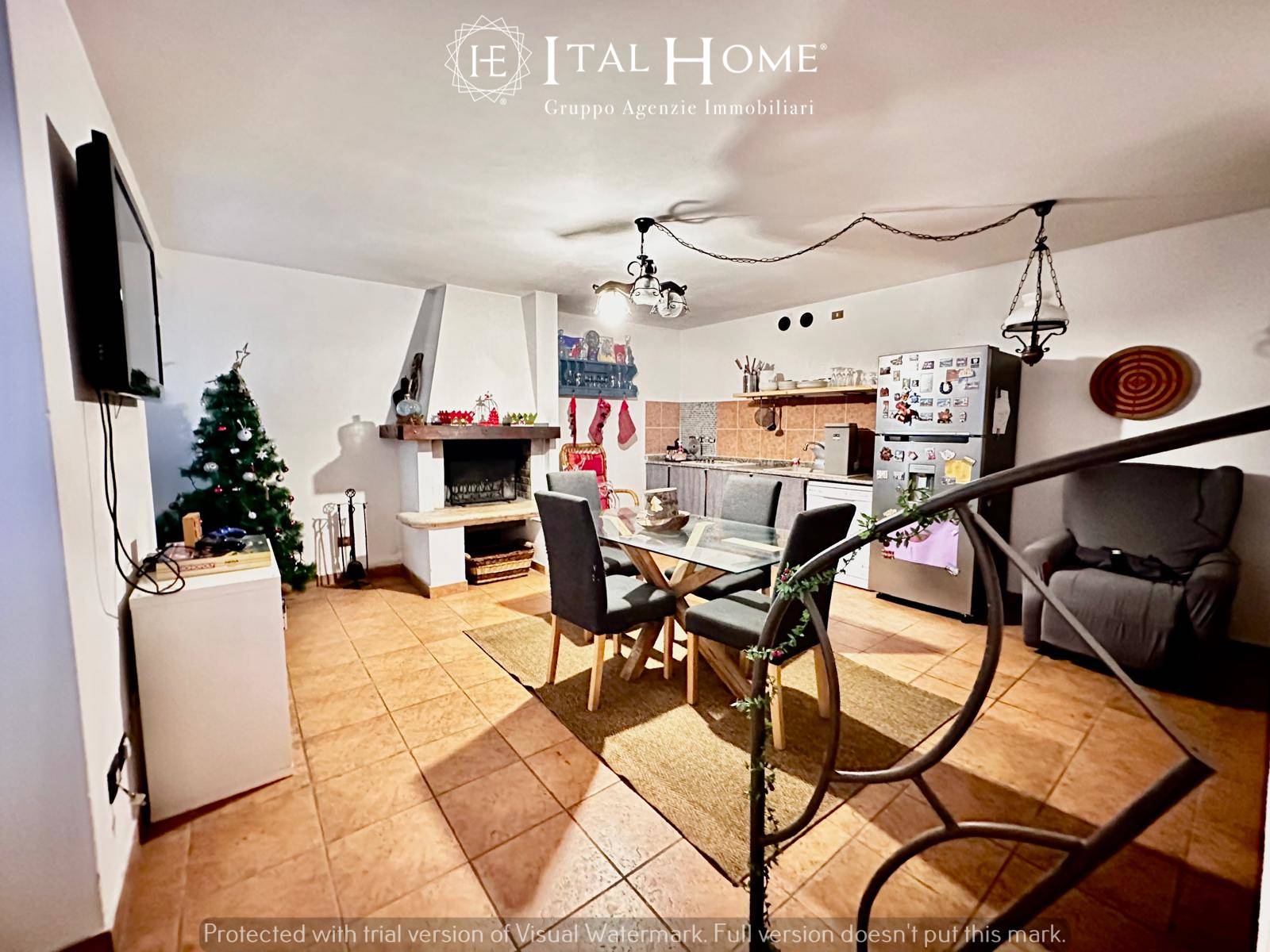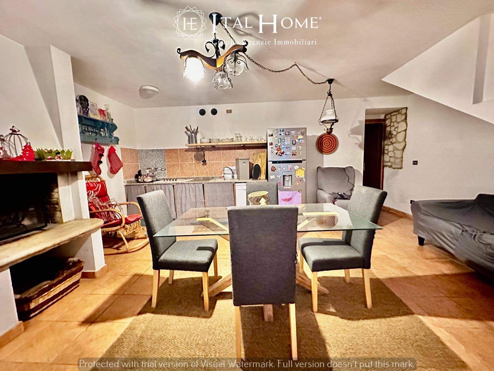 • piano terra: ampia zona living con termocamino, cucina a vista, accesso al bilocale adiacente, scala interna che collega interrato ed il 1° piano, antibagno, bagno finestrato ed accesso al giardino di proprietà.