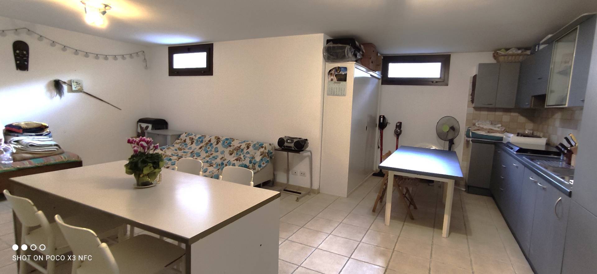 Nel piano seminterrato, vivibile e luminoso grazie a due finestre, si trovano un'ampia sala con angolo cottura, una camera da letto aggiuntiva e un ulteriore bagno con doccia, offrendo così spazi versatili per ospiti o per creare un ambiente indipendente.