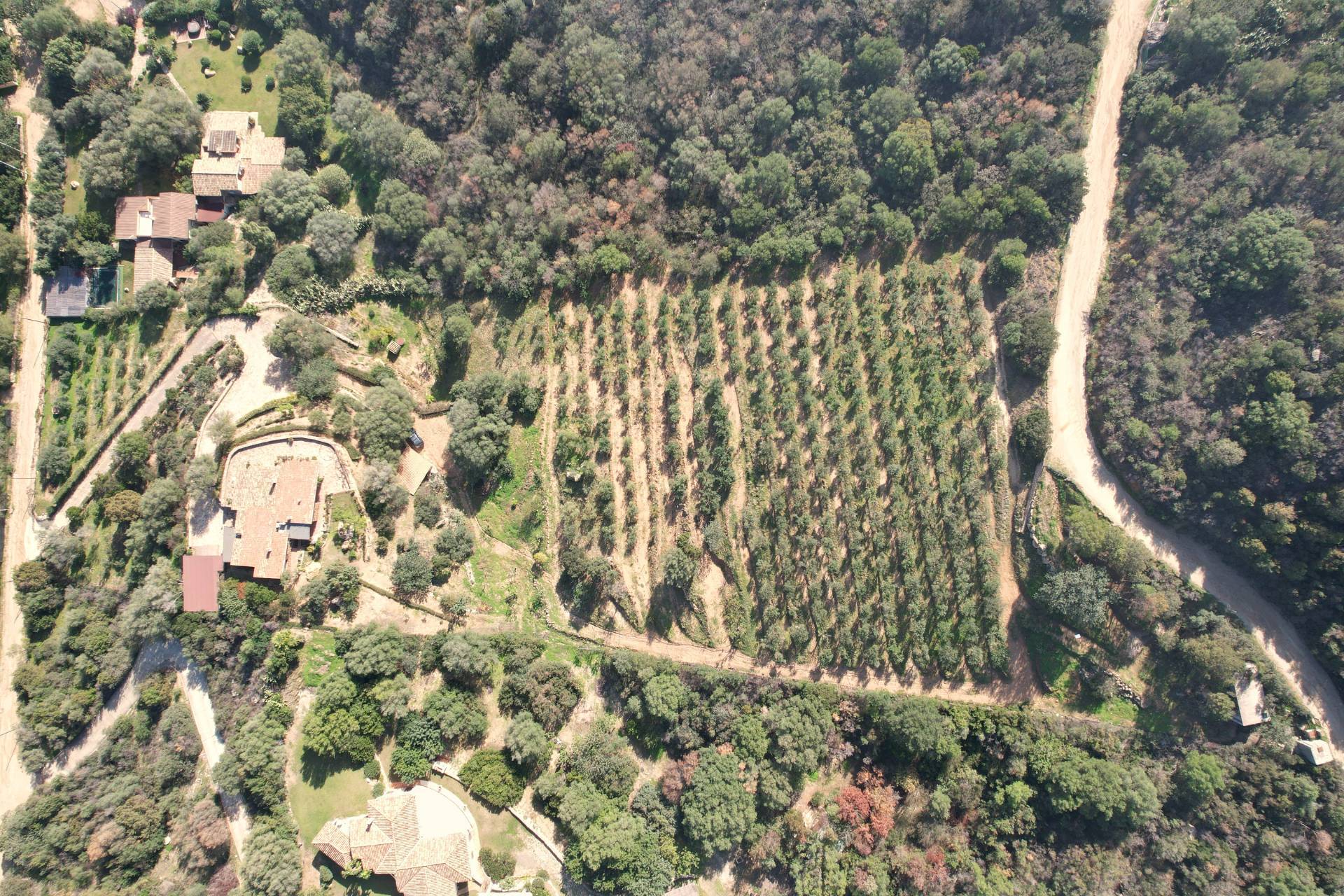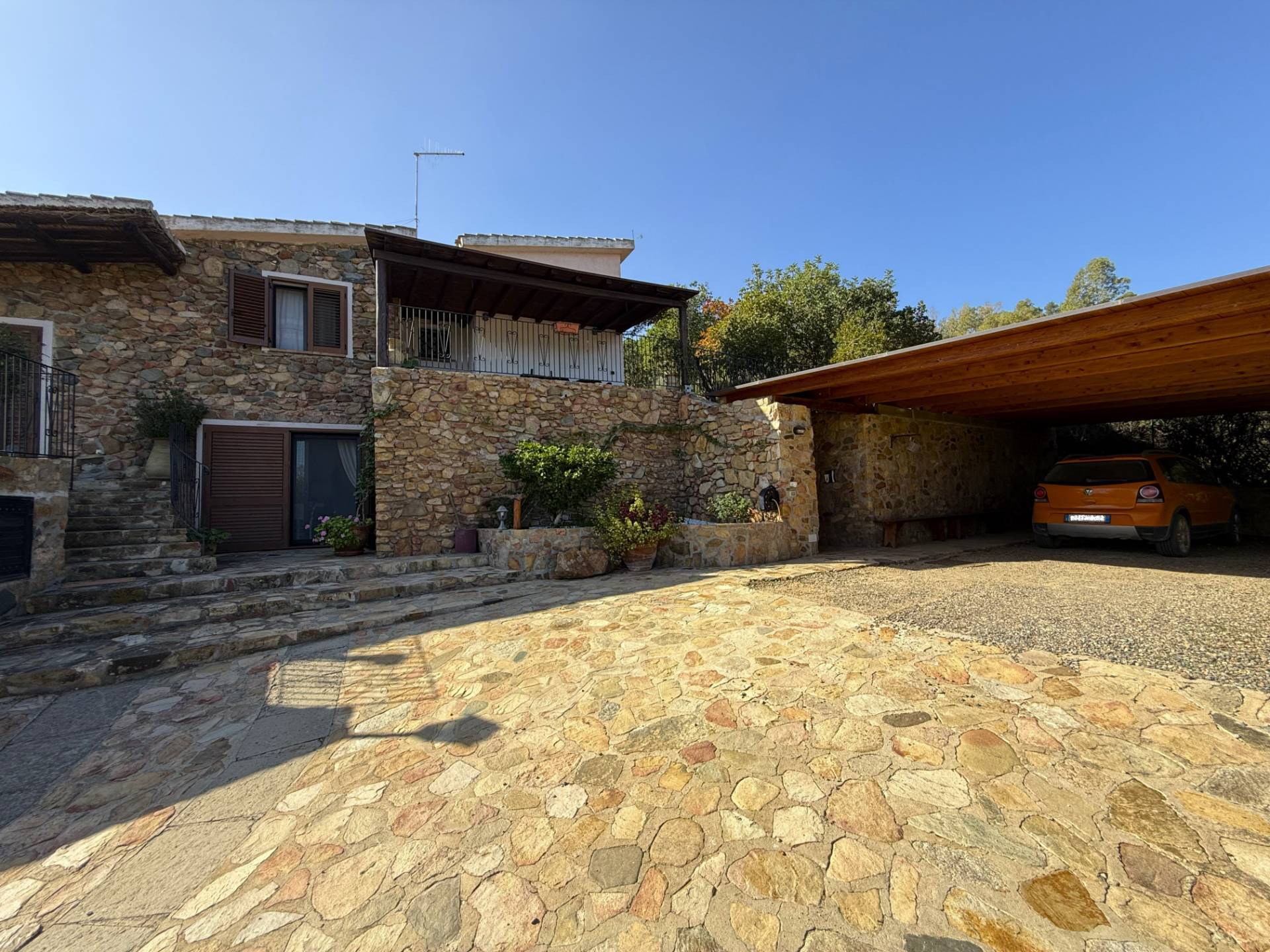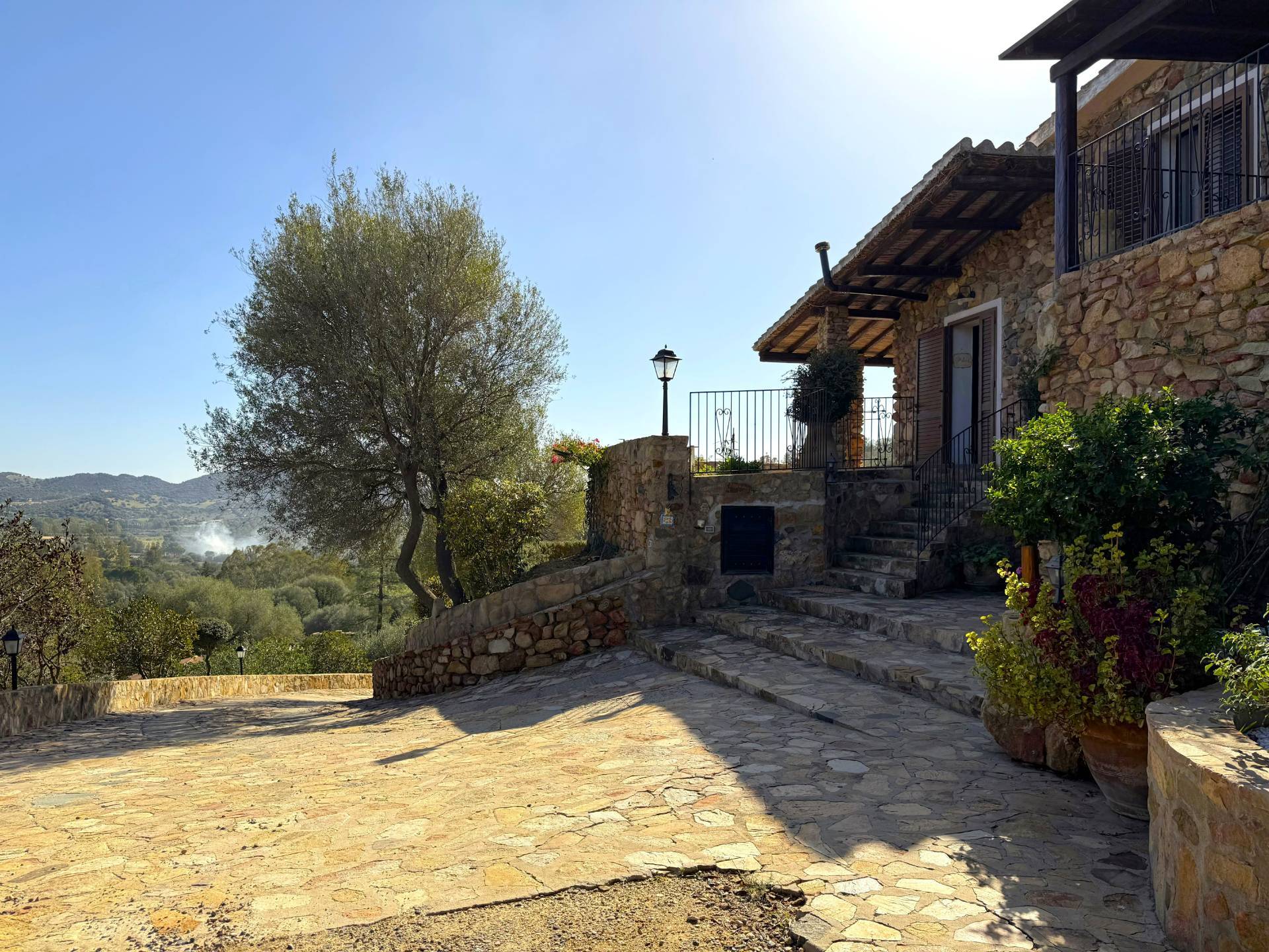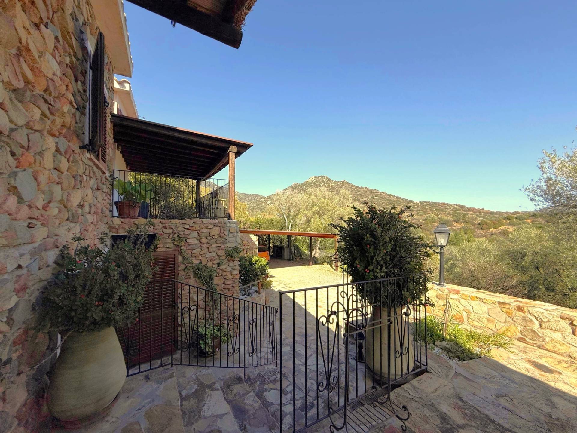 Tramite una strada realizzata interamente con pietra sarda e costeggiata da siepi di corbezzolo e rosmarino si arriva all'ingresso della proprietà.
