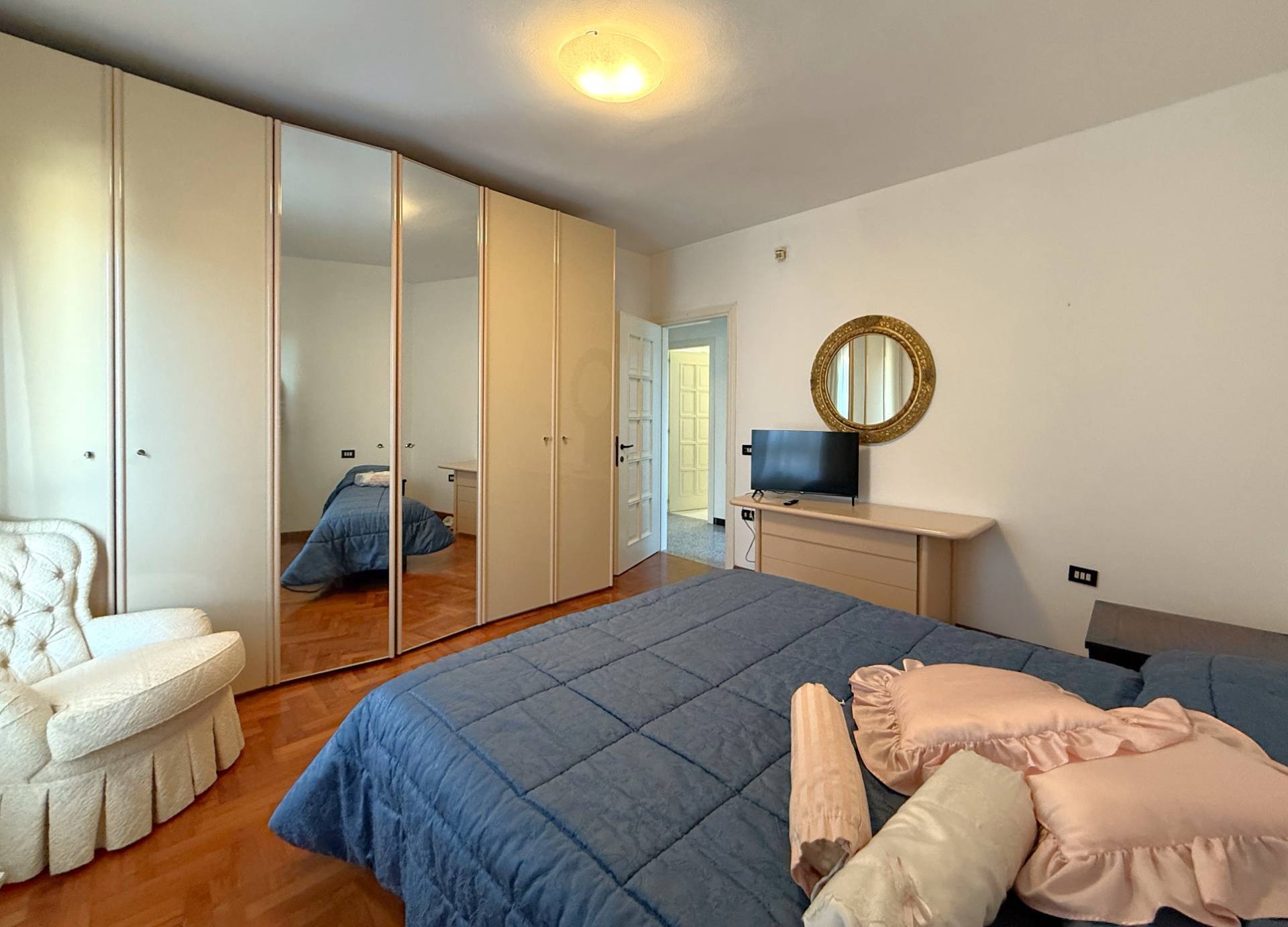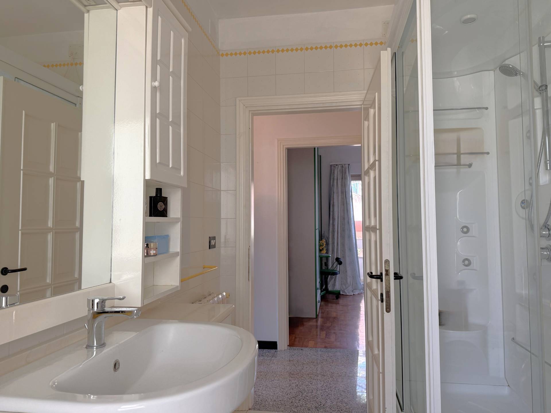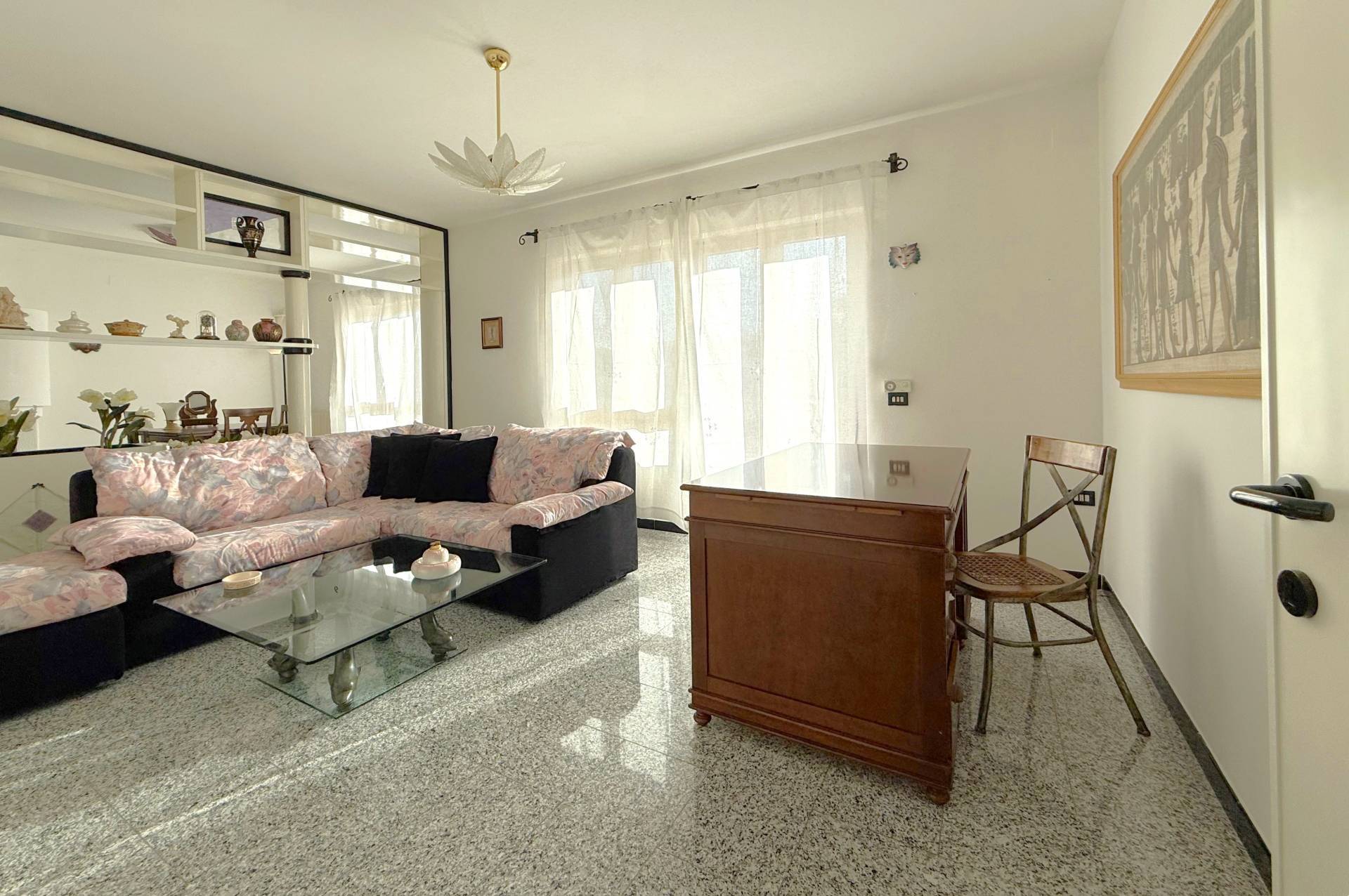 sala pranzo soggiorno con affaccio sul balcone, uno studio/camera, disimpegno, un wc con antibagno, un bagno, un ripostiglio e tre camere da letto.