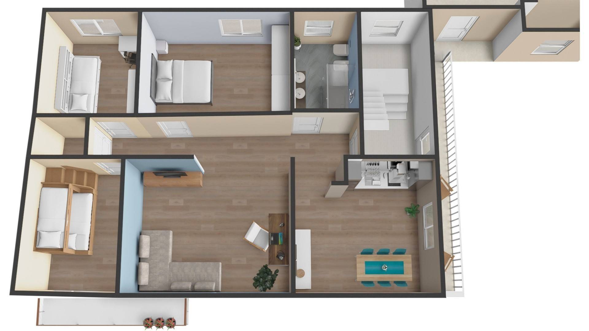 La zona notte è composta da tre camere da letto e un ampio ripostiglio.