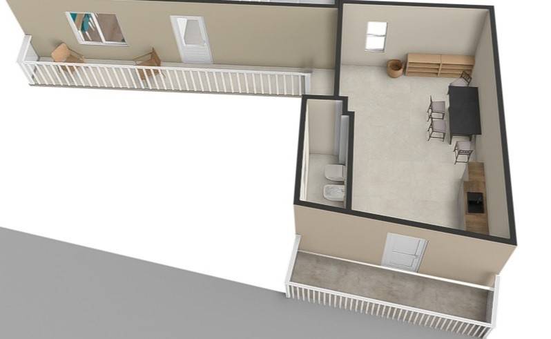 La zona giorno ospita un soggiorno con cucina abitabile separata, e un bagno recentemente ristrutturato in stile moderno.
