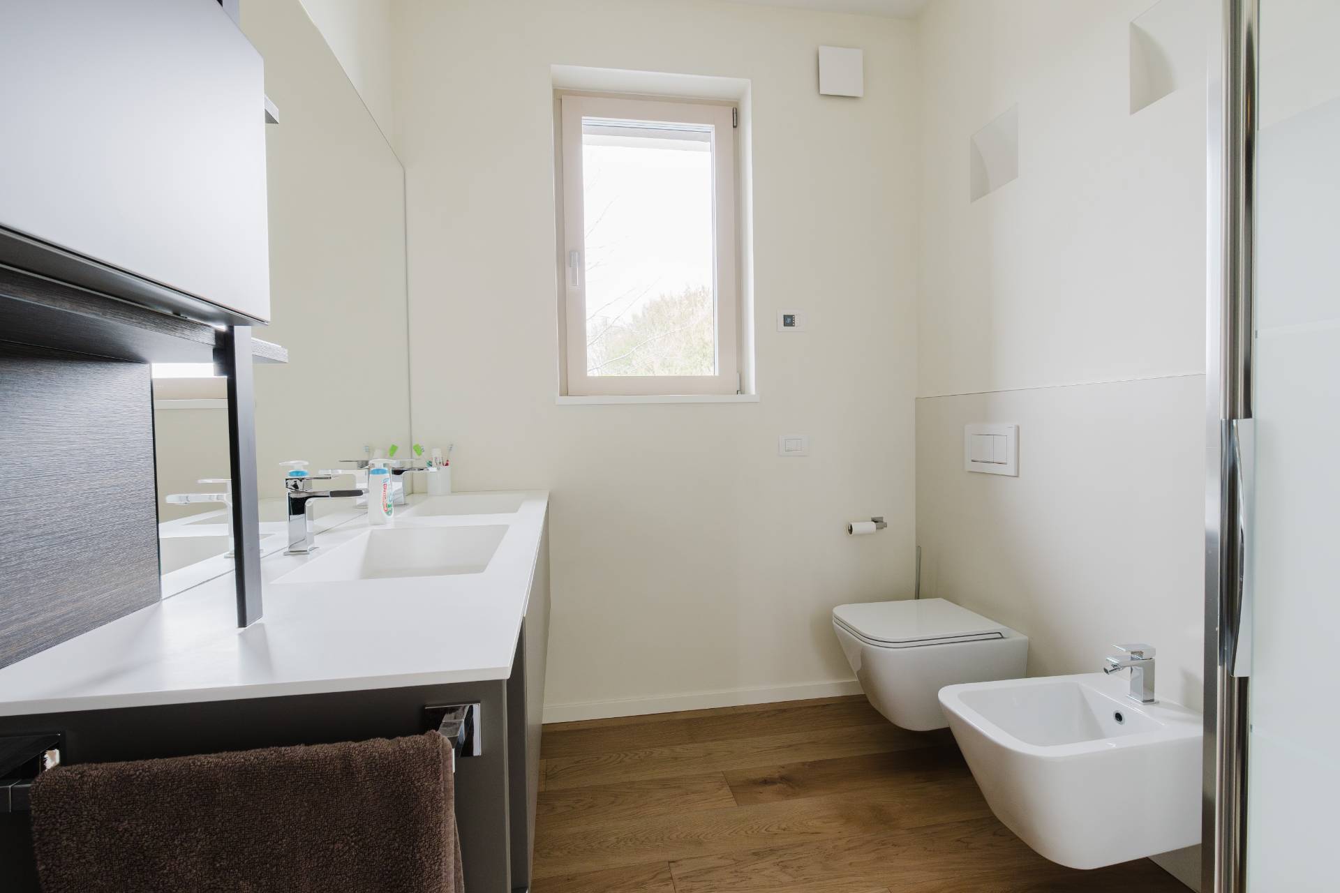 Al piano superiore della villa troviamo il secondo bagno e due camere da letto di notevoli dimensioni, entrambe con cabina armadio.