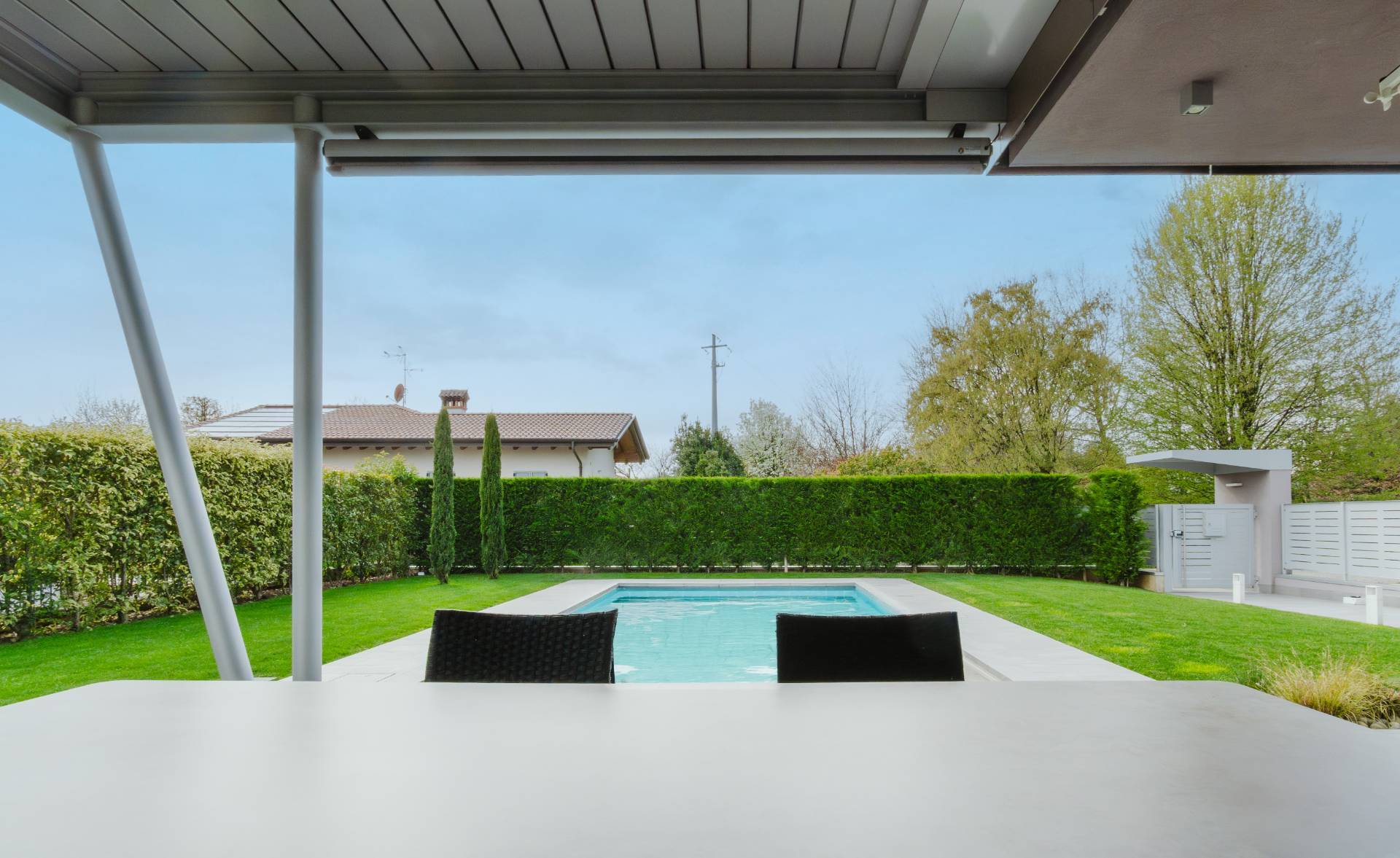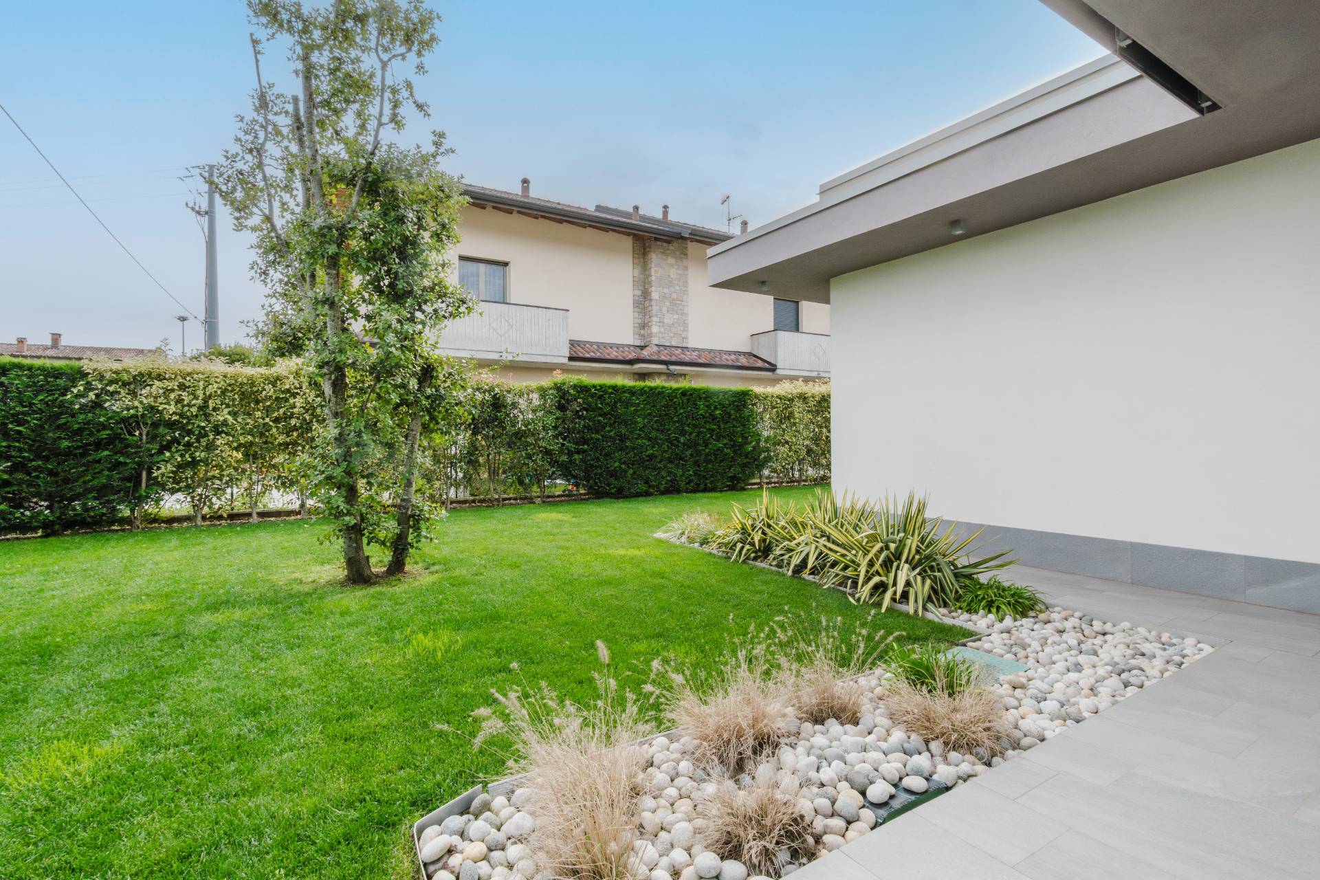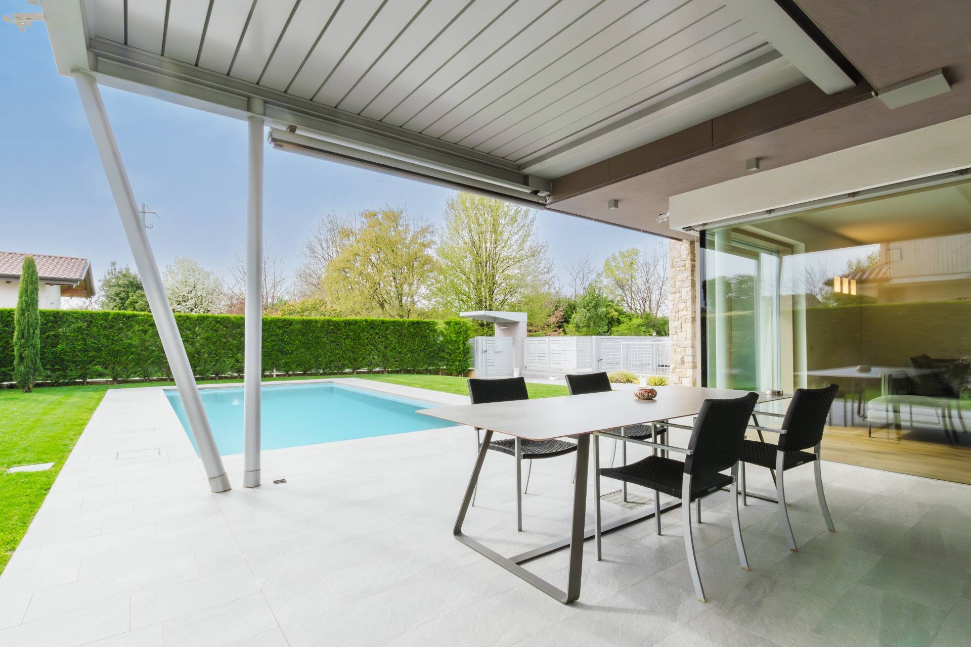 Esternamente la villa si circonda di oltre 500mq di giardino privato del quale si può godere anche stando placidamente sdraiati sotto ad uno stupendo portico, riparati da tende da sole elettriche.