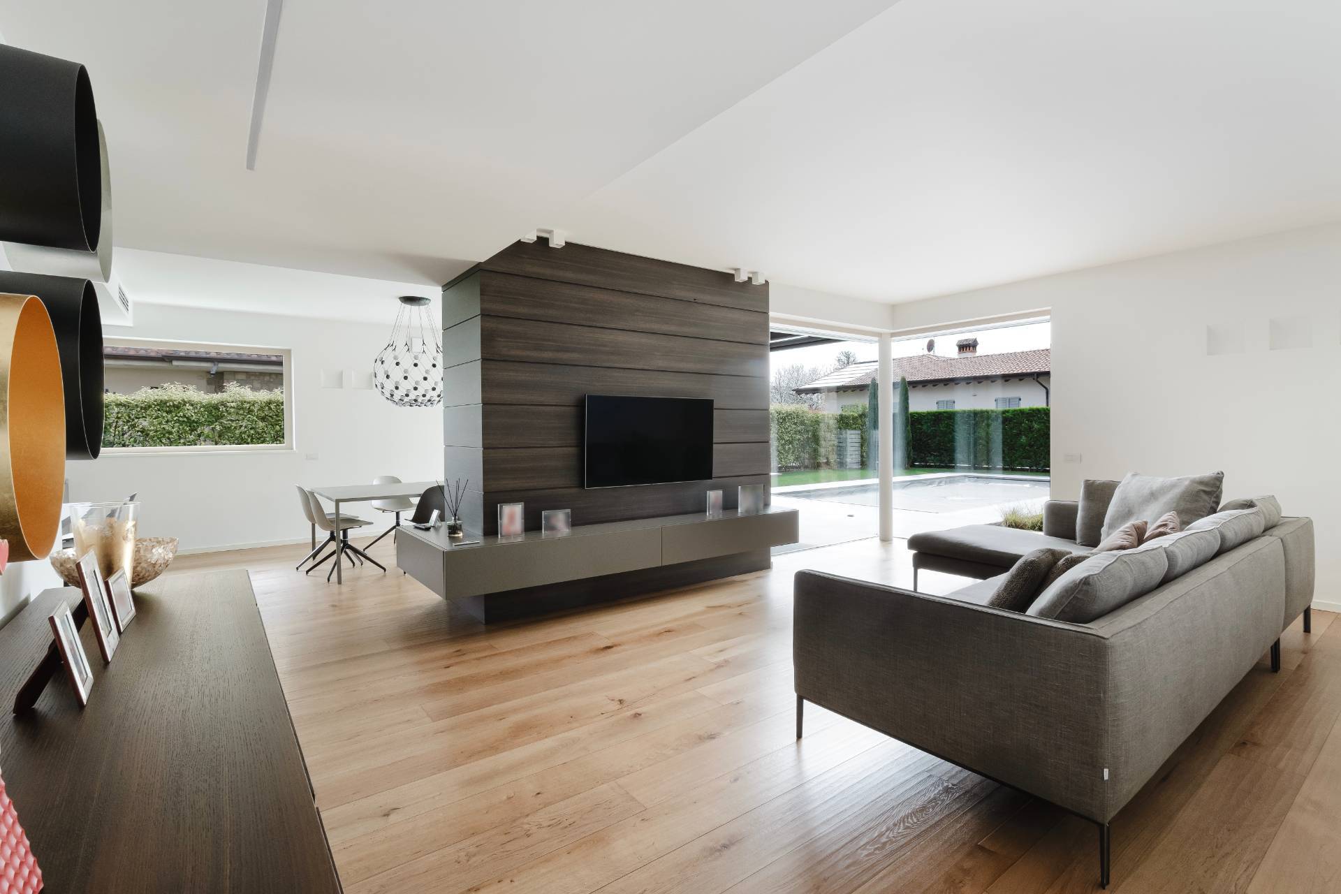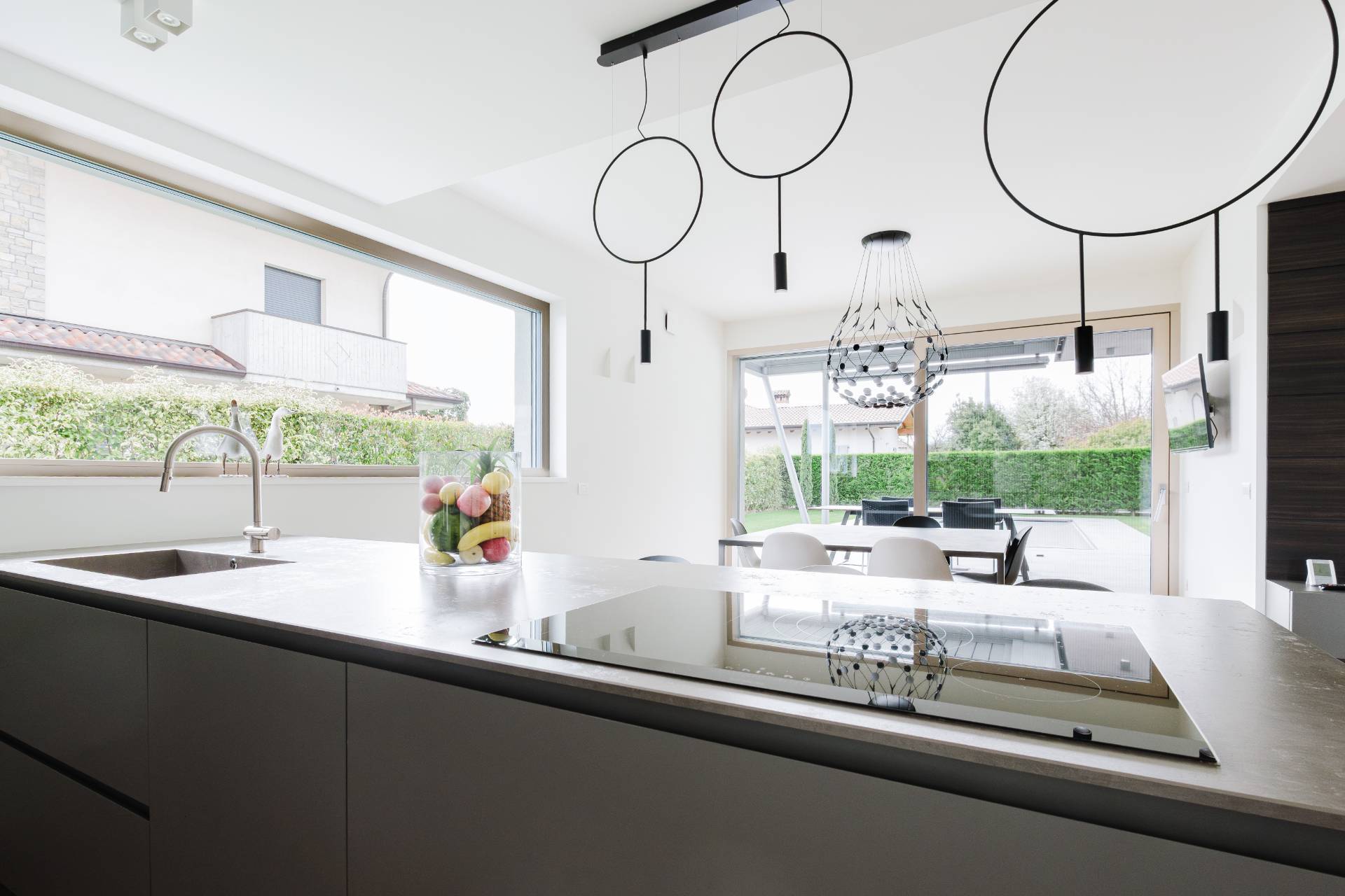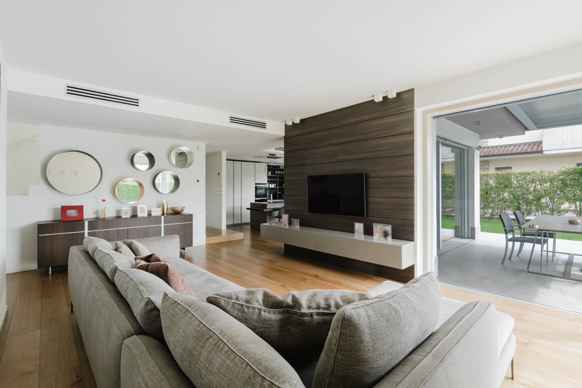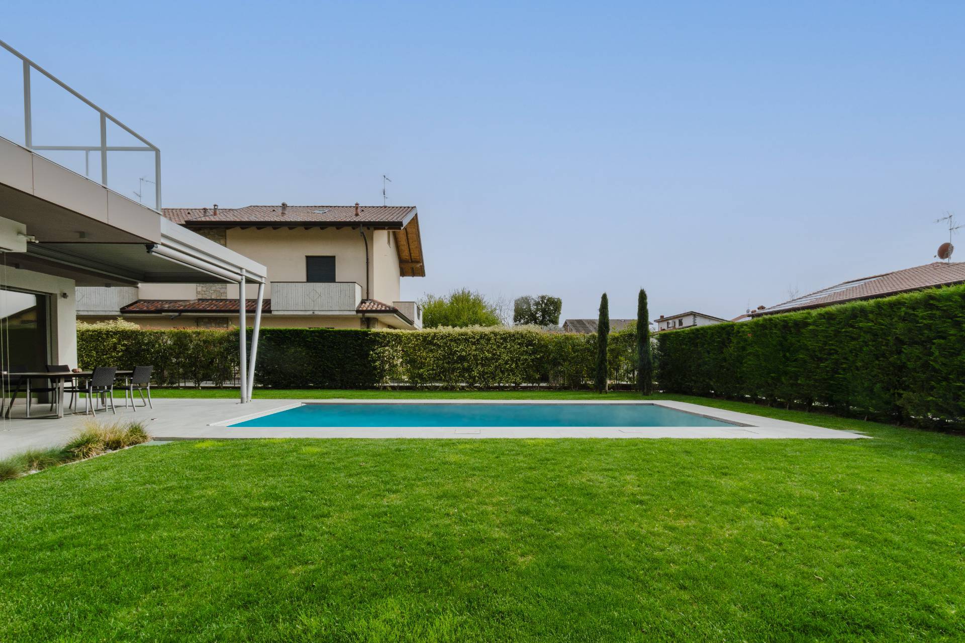 Esternamente la villa si circonda di oltre 500mq di giardino privato del quale si può godere anche stando placidamente sdraiati sotto ad uno stupendo portico, riparati da tende da sole elettriche.
