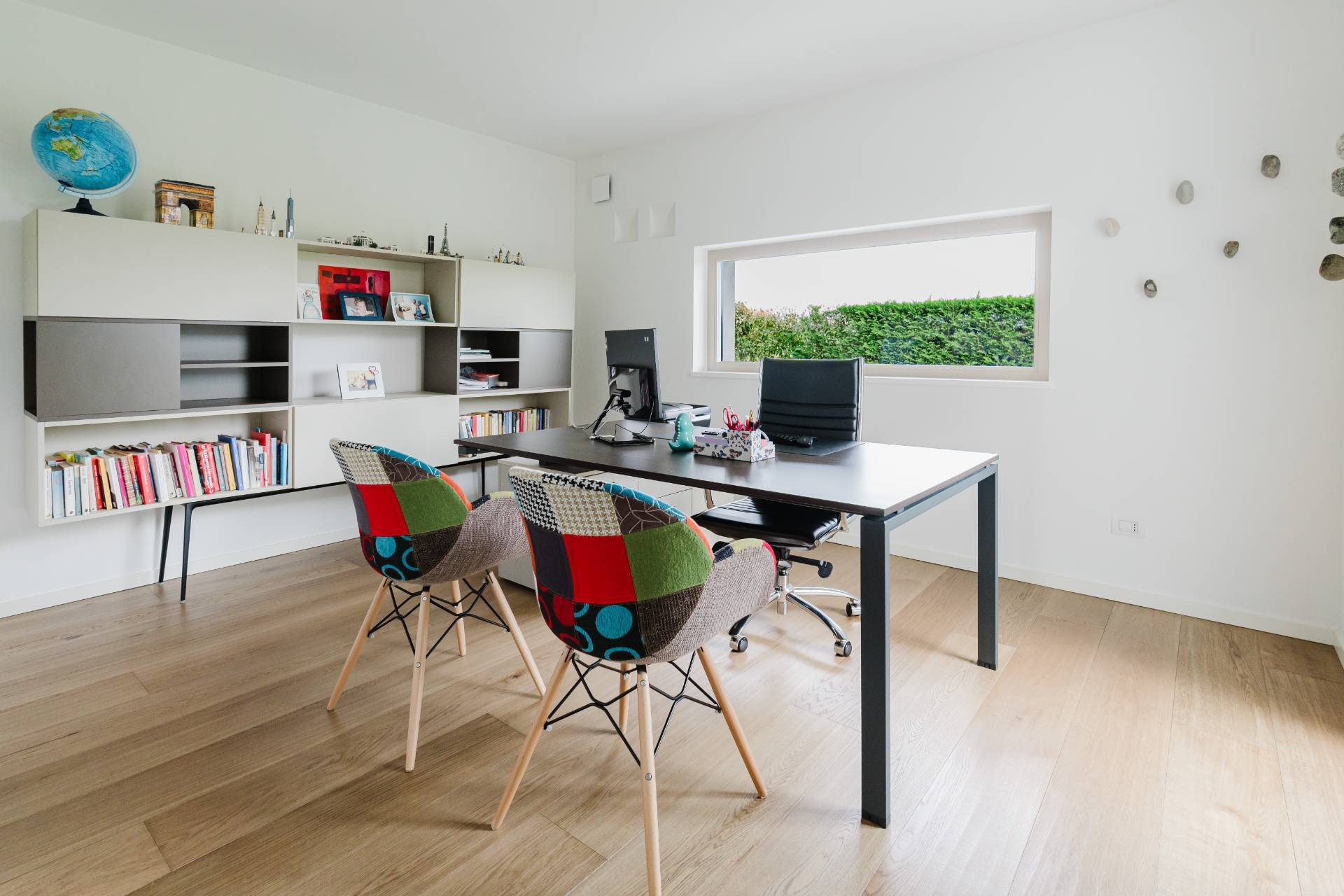 L'ingresso alla casa si apre su di un ampio soggiorno con cucina a vista, ambienti entrambi caratterizzati da grandi finestre che illuminano tutta la zona giorno. A seguire troviamo il disimpegno, il primo bagno e la camera da letto matrimoniale, attualmente utilizzata come studio.