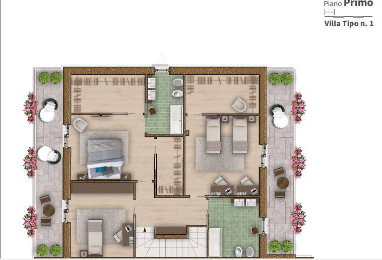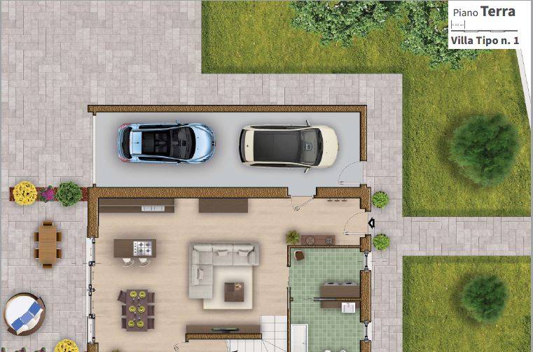 Ingresso pedonale e carrrale indipendenti, con ampio giardino disposto su due lati per 120 mq. Accesso all'immobile da porta blindata su ampio soggiorno con cucina open space, doppia esposizione e libera su due lati. Il soggiorno ha ampia vetrata che da accesso ad un piacevole portico esterno, per cene o pranzi all'aperto; sempre al piano terra antibagno e bagno ospiti con doccia. Dal piano terra si accede al piano primo; da disimpegno si aprono due camere da letto singole con cabina armadio e un bagno con vasca; una terza camera matrimoniale con cabina armadio e un bagno esclusivo con doccia. Dalle camere si ha accesso a due ampi balconi di circa 13 mq l'uno. Finiture di pregio e alto contenimento energetico a capitolato portano ad una class energetica A 4 garantendo confort in tutte le stagioni dell'anno. Parti in domotica e predisposizioni utili per rendere l'appartamento autonomo come tapparelle in alluminio coibentato motorizzate, serramenti di ampio spessore con doppio vetro ad alto contenimento termo/acustico, porta sezionata motorizzata sulla autorimessa; impianto fotovoltaico per 3,00 kw ampliabile, tv con antenna anche satellitare, impianto di riscaldamento autonomo a pompa di calore. All'attuale le disposizioni interne possono essere riviste su misura.