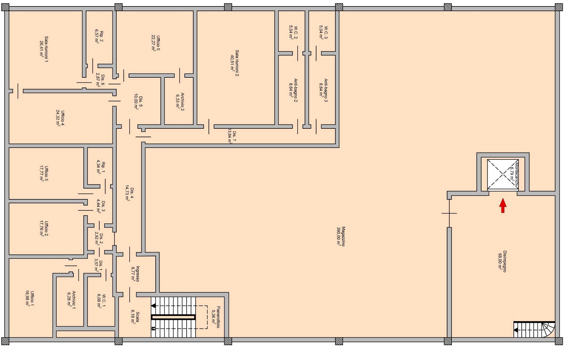 L'immobile è situato al primo piano di un fabbricato industriale sviluppato su due livelli, con accesso dal piano terra tramite scale interne e montacarichi, oltre a spazi riservati al carico e scarico merci.