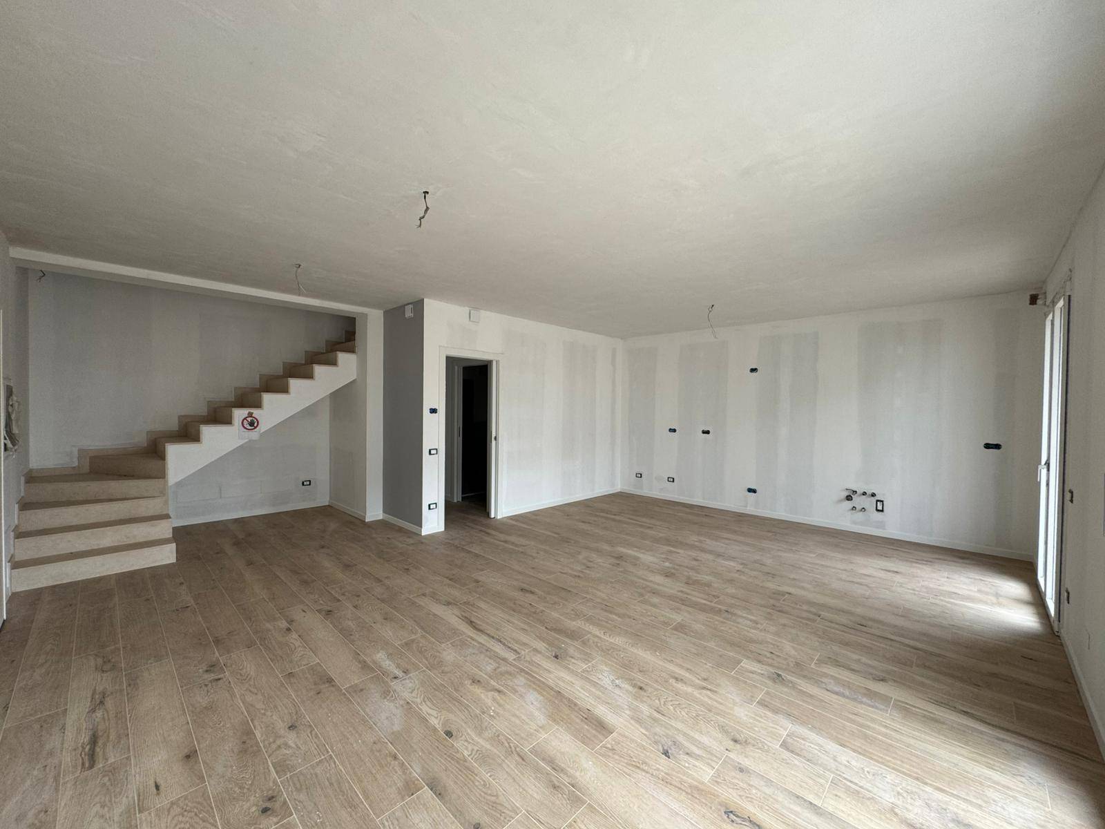 Il piano terra è composto dall'ampia zona giorno con accesso tramite vetrata al giardino privato, sempre al piano terra troviamo il bagno e le comode scale che conducono al primo piano.