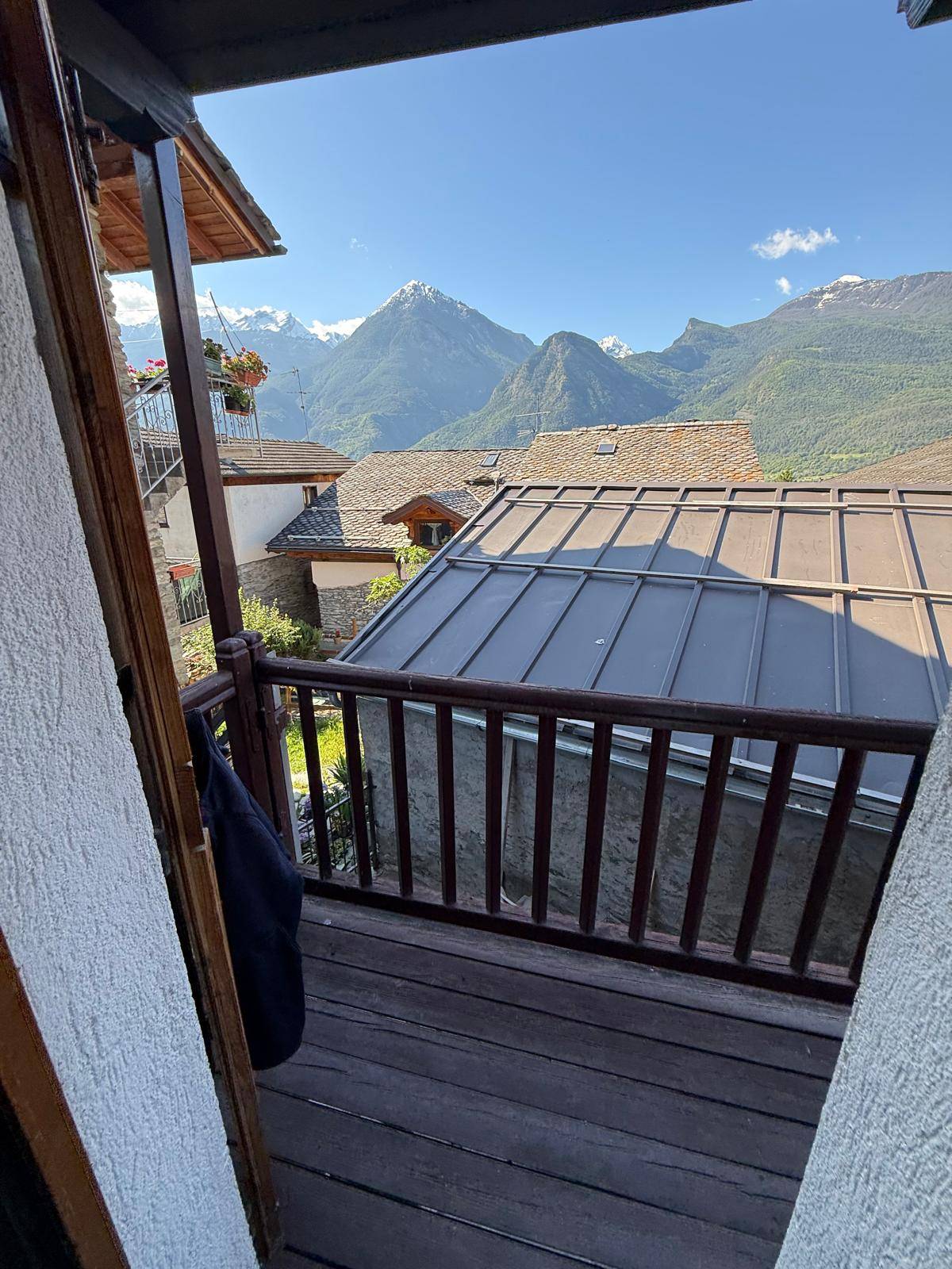 A Nus, in piccolo borgo storico, casa indipendente su tre livelli; al piano terra vi è l'ingresso con un terrazzo, un bagno e un angolo cottura; al primo piano il salone con un balcone adiacente e al secondo piano una camera da letto, anch'essa con un balcone con vista panoramica.