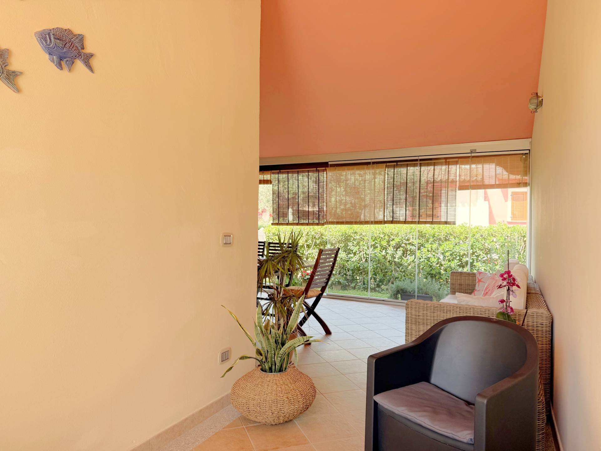 Superato il fresco giardino ci accoglie una luminosa veranda con vetrata composta da vari pannelli in vetro pieghevoli posizionati lungo un binario che permette di aprirsi completamente; questa soluzione innovativa permette di vivere lo spazio in ogni stagione, ammirando la vista sul giardino anche nei mesi più freddi.