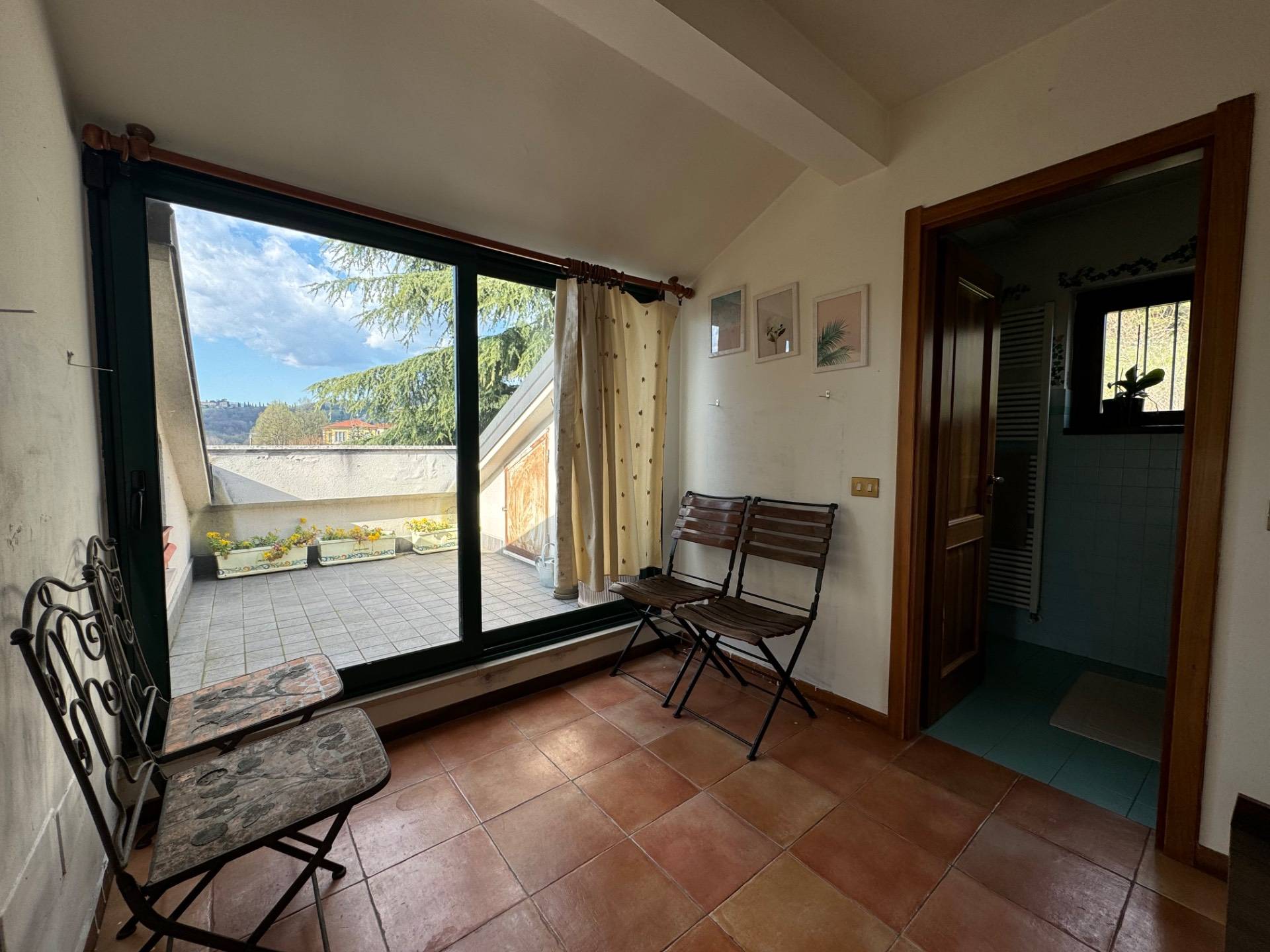 Al piano superiore troviamo la zona notte mansardata composta da 3 camere da letto, un bagno ed un tranquillo e riservato terrazzo con affaccio sui colli.