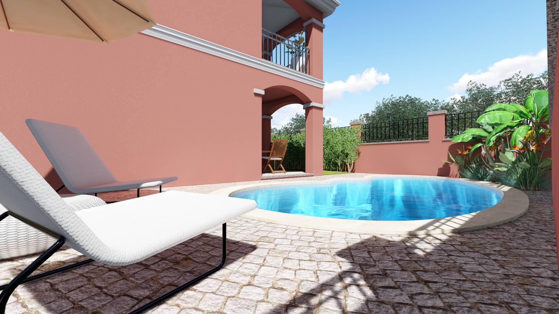 Il cortile di 130 mq includerà anche una piscina di circa 20 mq e un'area parcheggio all'ingresso, perfetta per accogliere amici o familiari.