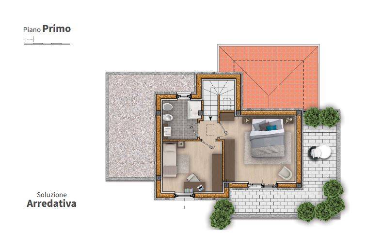 Studiata per garantire privacy ed eleganza con spazi adeguati per la famiglia, composte da ingresso pedonale indipendente su giardino privato ; da porta blindata si ha primo accesso su zona giorno composta da soggiorno-cucina, disimpegno con una camera da letto e un primo bagno con ripostiglio sottoscala; accesso diretto all'autorimessa. La Camera da letto puo' essere destinata alla creazione di una cucina separata o per aprire ulteriormente gli spazi sul soggiorno. Porticato esterno per godere il verde esclusivo del giardino che si sviluppa su tre lati.