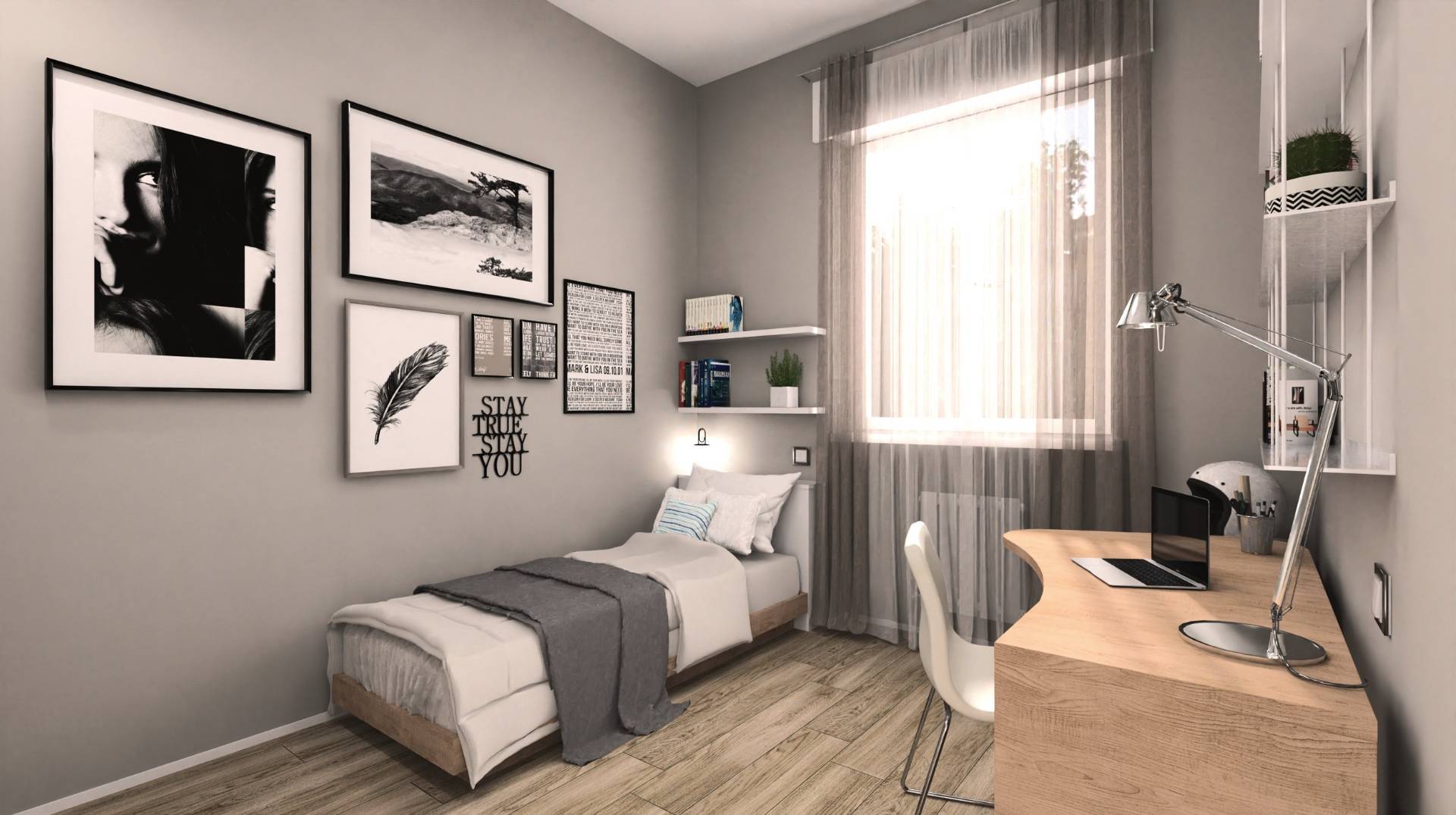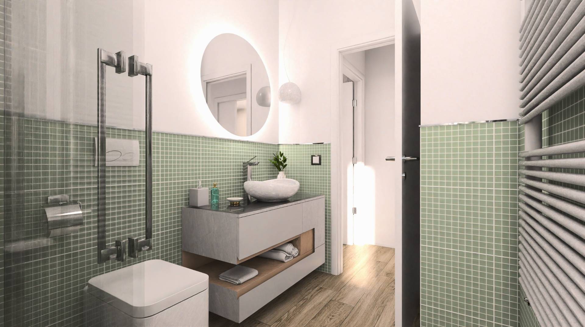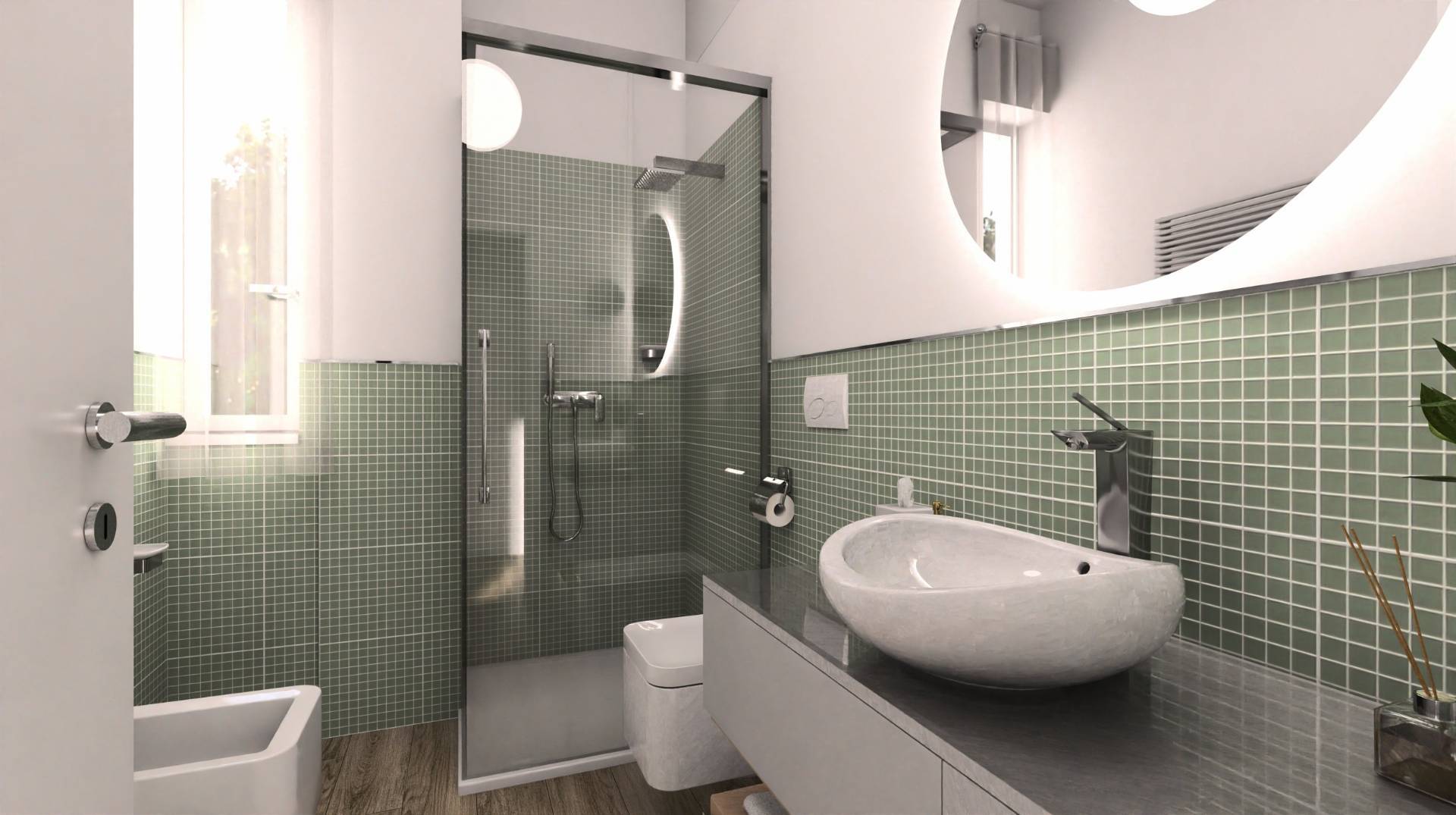 Un elegante disimpegno conduce alla zona notte, composta da una spaziosa camera singola, un bagno moderno e una splendida camera da letto matrimoniale con bagno padronale en-suite. Qui si trova una doccia scenografica in stile hotel di lusso, visibile direttamente dalla camera attraverso una raffinata parete in vetro: un dettaglio di classe che dona ulteriore carattere all'ambiente.