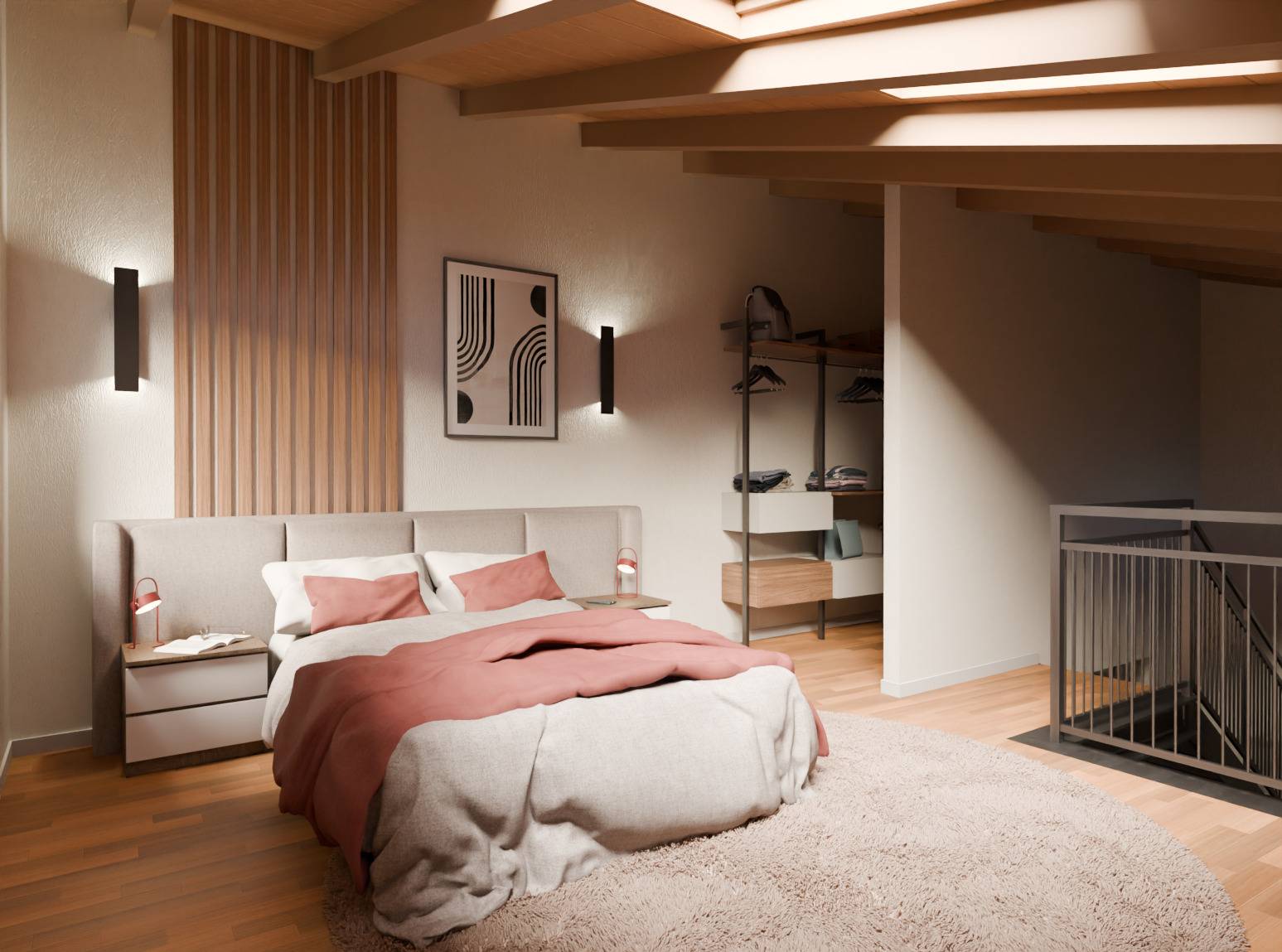 Al piano superiore si sviluppa la camera matrimoniale illuminata naturalmente dal lucernario e ed una moderna cabina armadio, pensata con grande attenzione al comfort e allo stile.