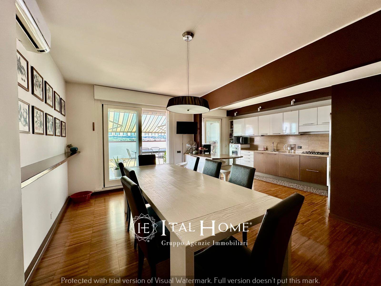 -piano 6°: ampia zona living di circa 70 mq con accesso al primo terrazzo di 20 mq, un balcone, un bagno finestrato, 2 ripostigli, un ascensore privato che collega la zona notte al piano inferiore ed una cucina con sala pranzo di 40 mq e con accesso ad un mega terrazzo di oltre 30 mq con camino/barbecue per pranzi/cene in compagnia.