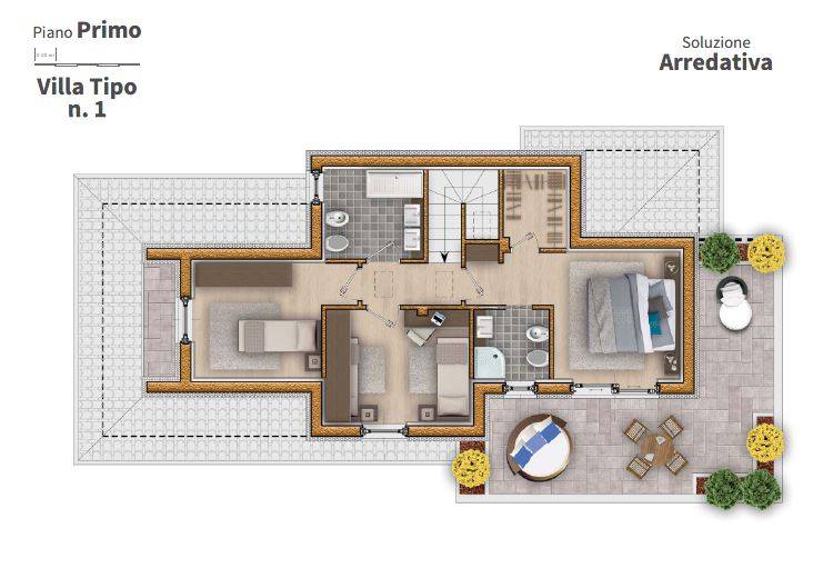 L'interno, offre una zona giorno luminosa composta da un soggiorno, una spaziosa cucina abitabile, un comodo ripostiglio e un bagno al piano terra. Al piano superiore, la zona notte offre una grande camera matrimoniale con bagno padronale e cabina armadio, che si affaccia su un grande terrazzo, due camerette e un altro bagno completano l'offerta.