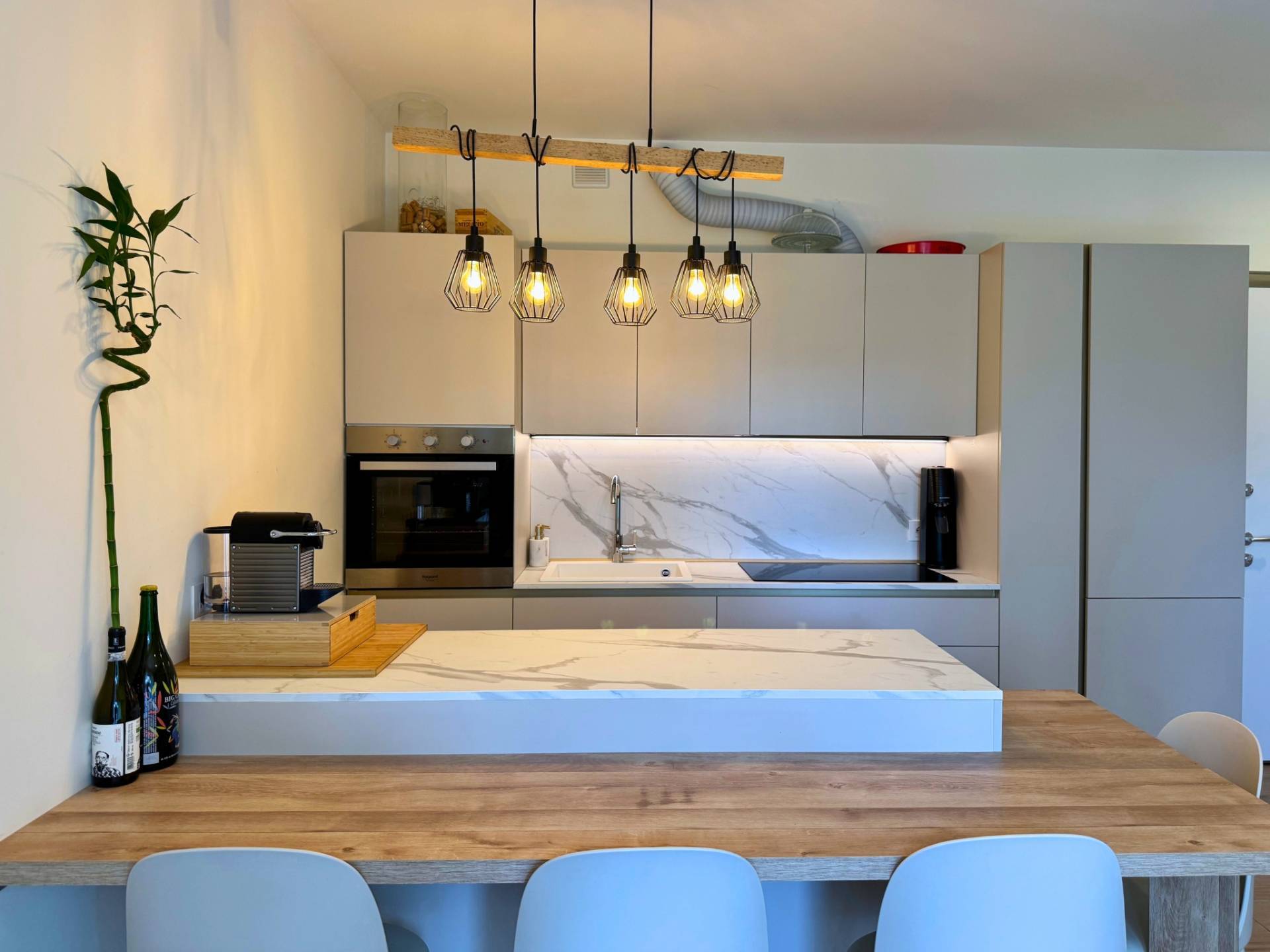 La casa viene venduta arredata ad eccezione di qualche mobilio, rimane la stupenda cucina con penisola, dotata di seduta per 4 sedie, top in effetto marmo e led incorporati.