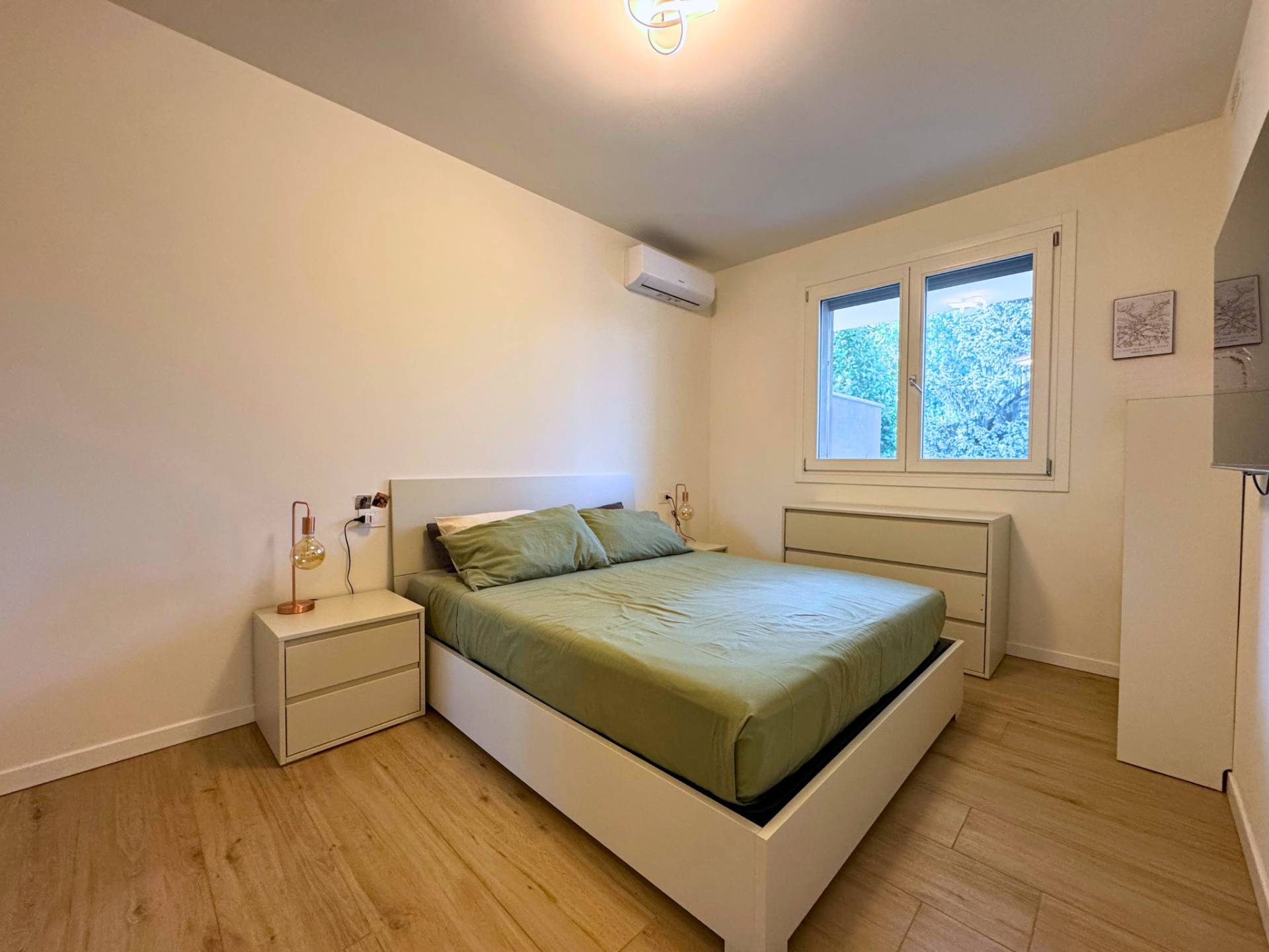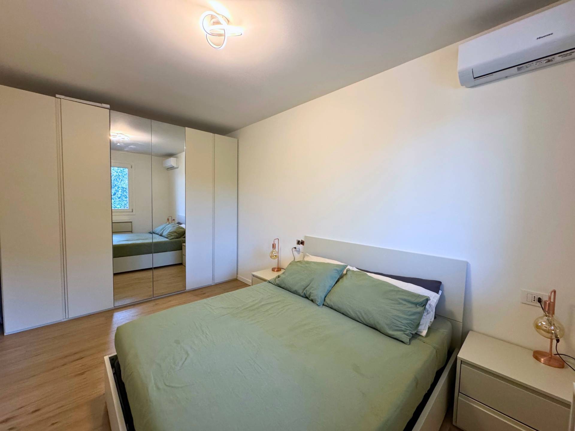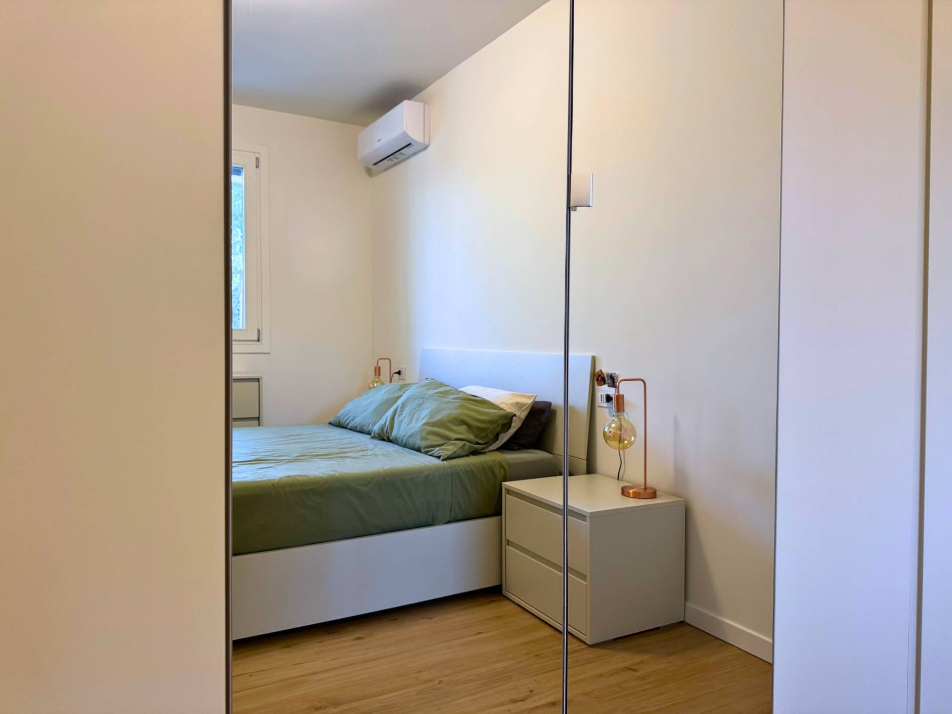 Attraverso un comodo disimpegno con armadio che nasconde lavatrice ed asciugatrice si accede alla zona notte, composta da una spaziosa camera da letto matrimoniale e da un bagno moderno con doccial walk-in e sanitari sospesi.