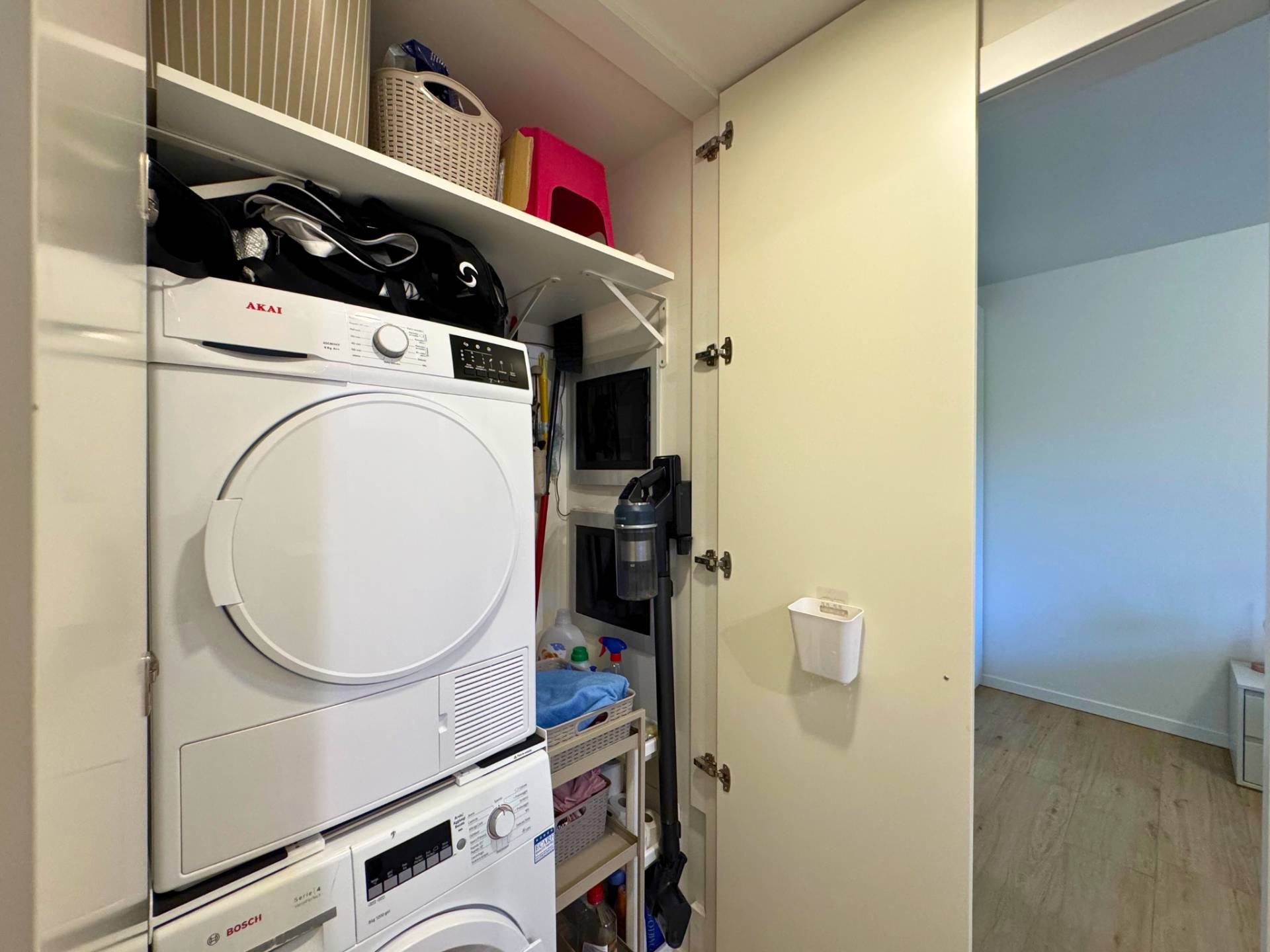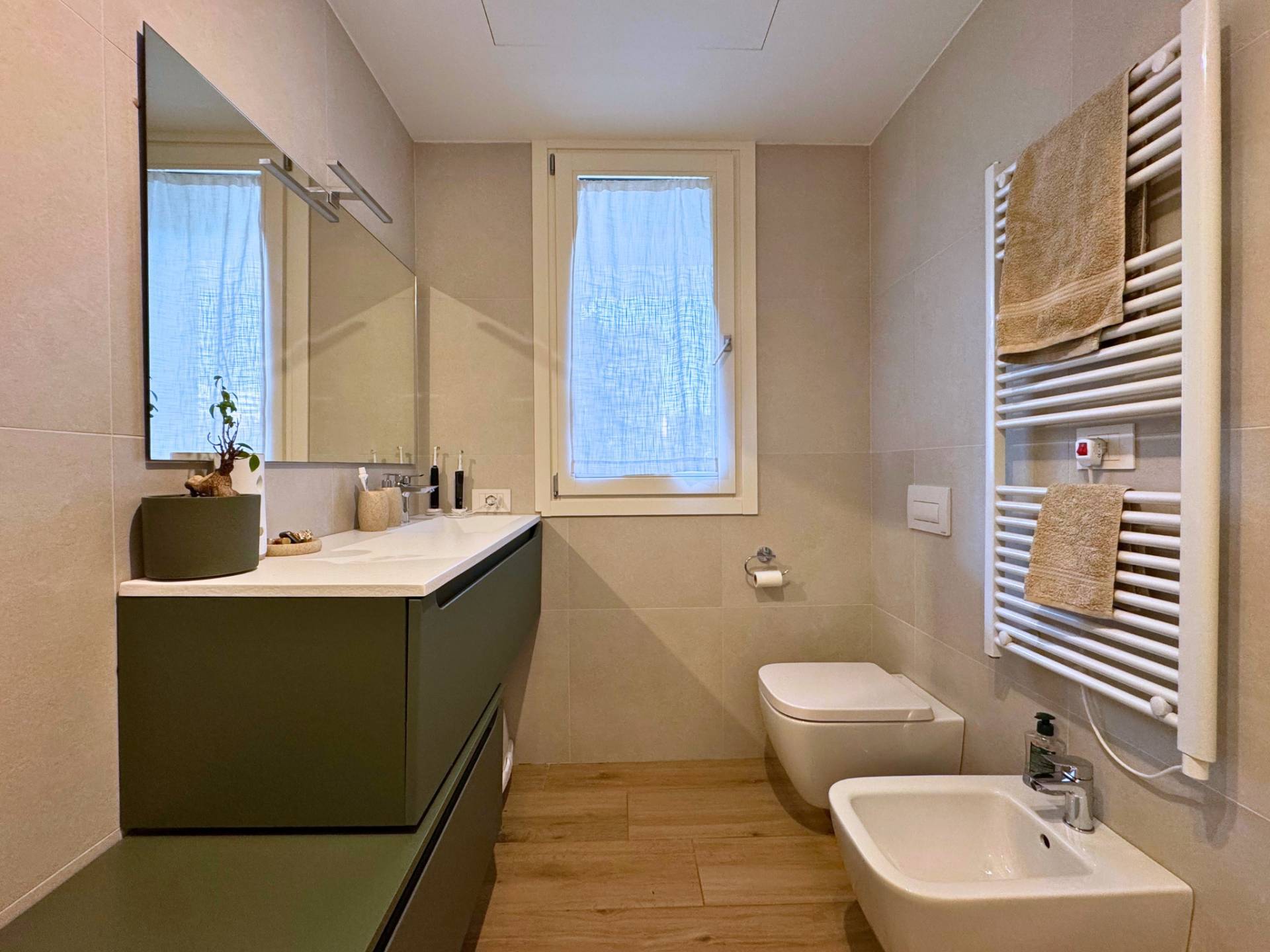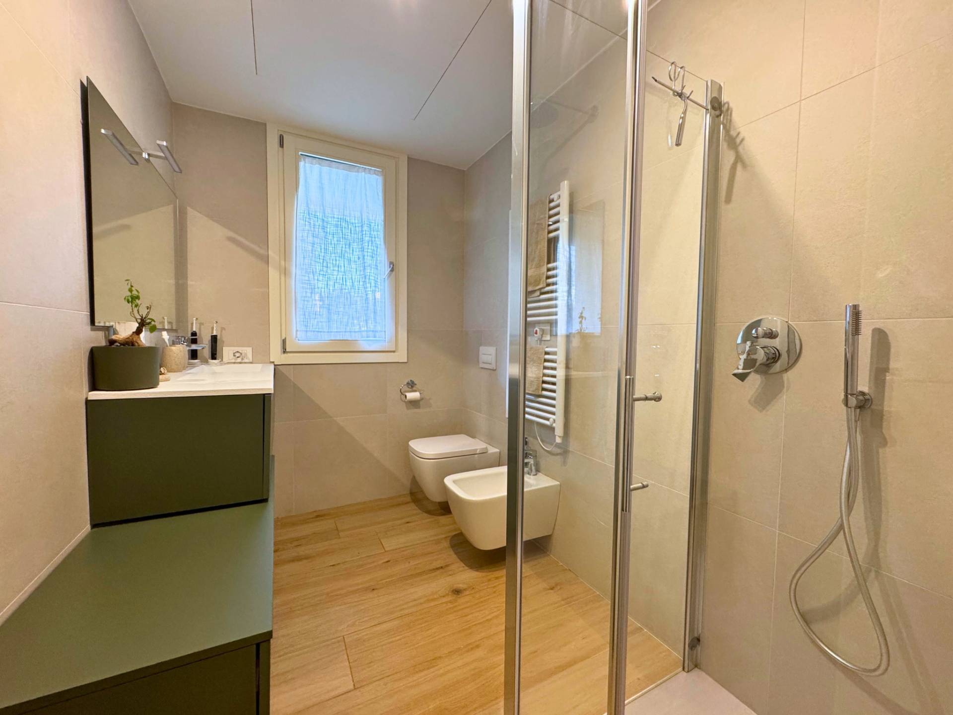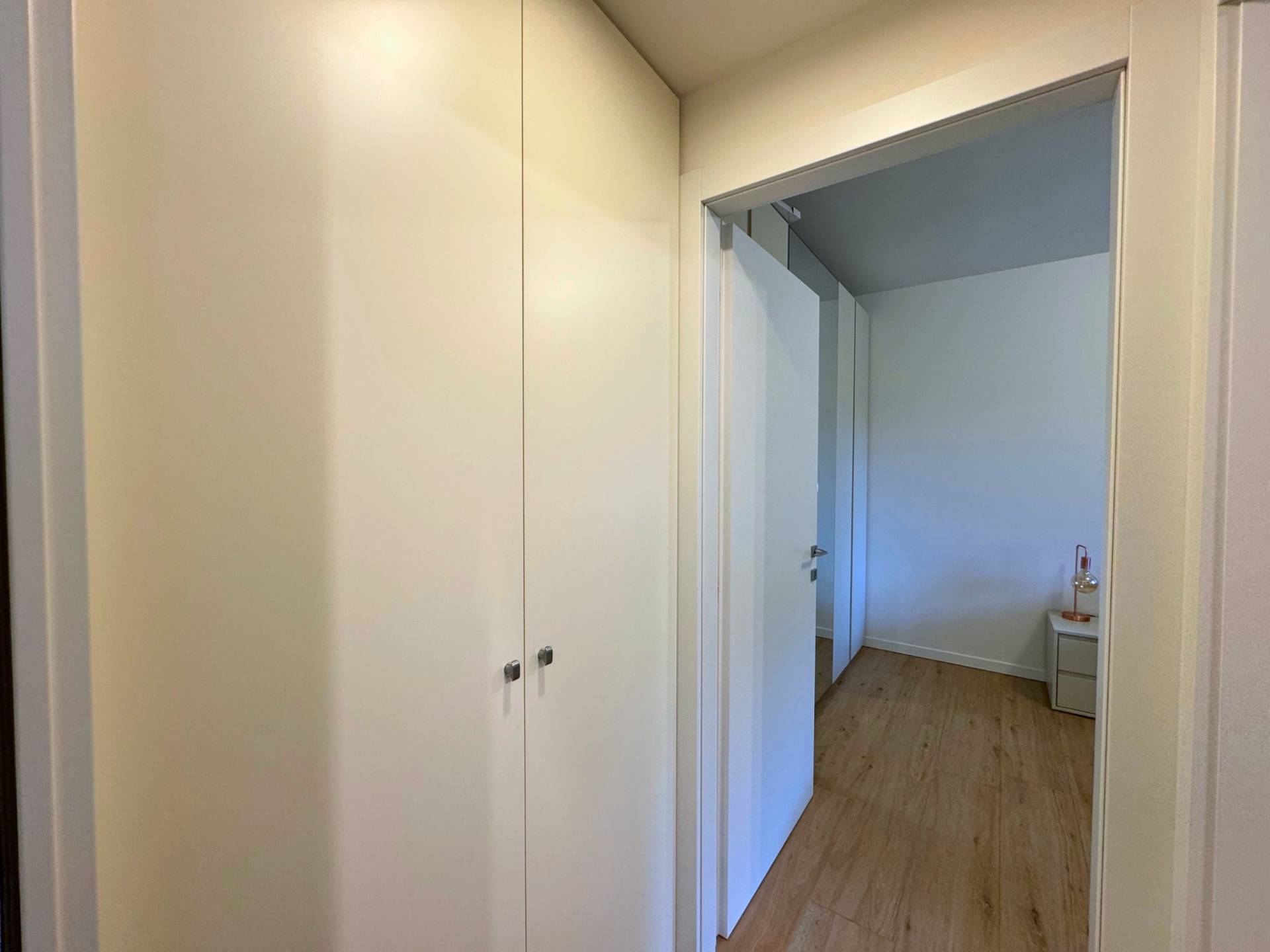 Attraverso un comodo disimpegno con armadio che nasconde lavatrice ed asciugatrice si accede alla zona notte, composta da una spaziosa camera da letto matrimoniale e da un bagno moderno con doccial walk-in e sanitari sospesi.