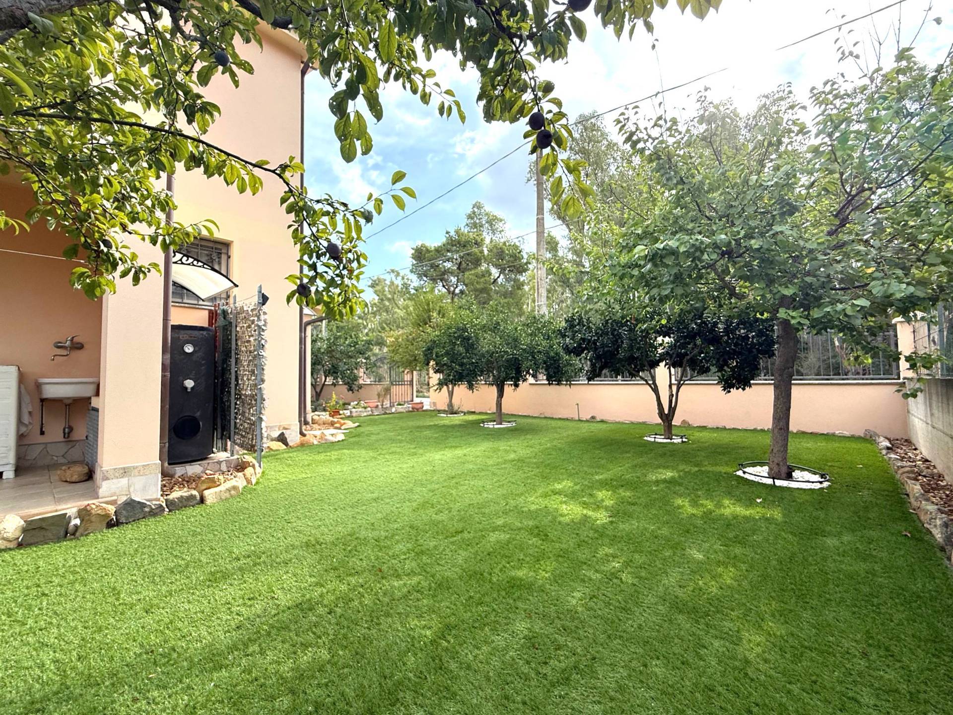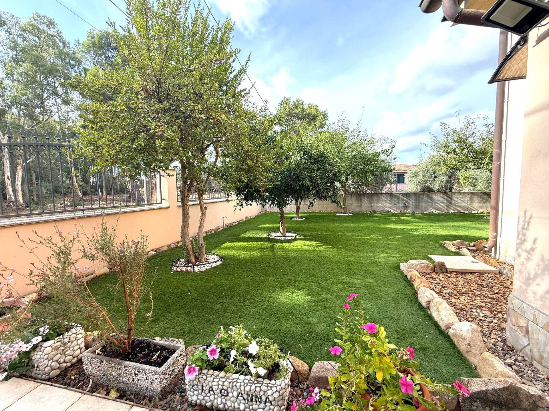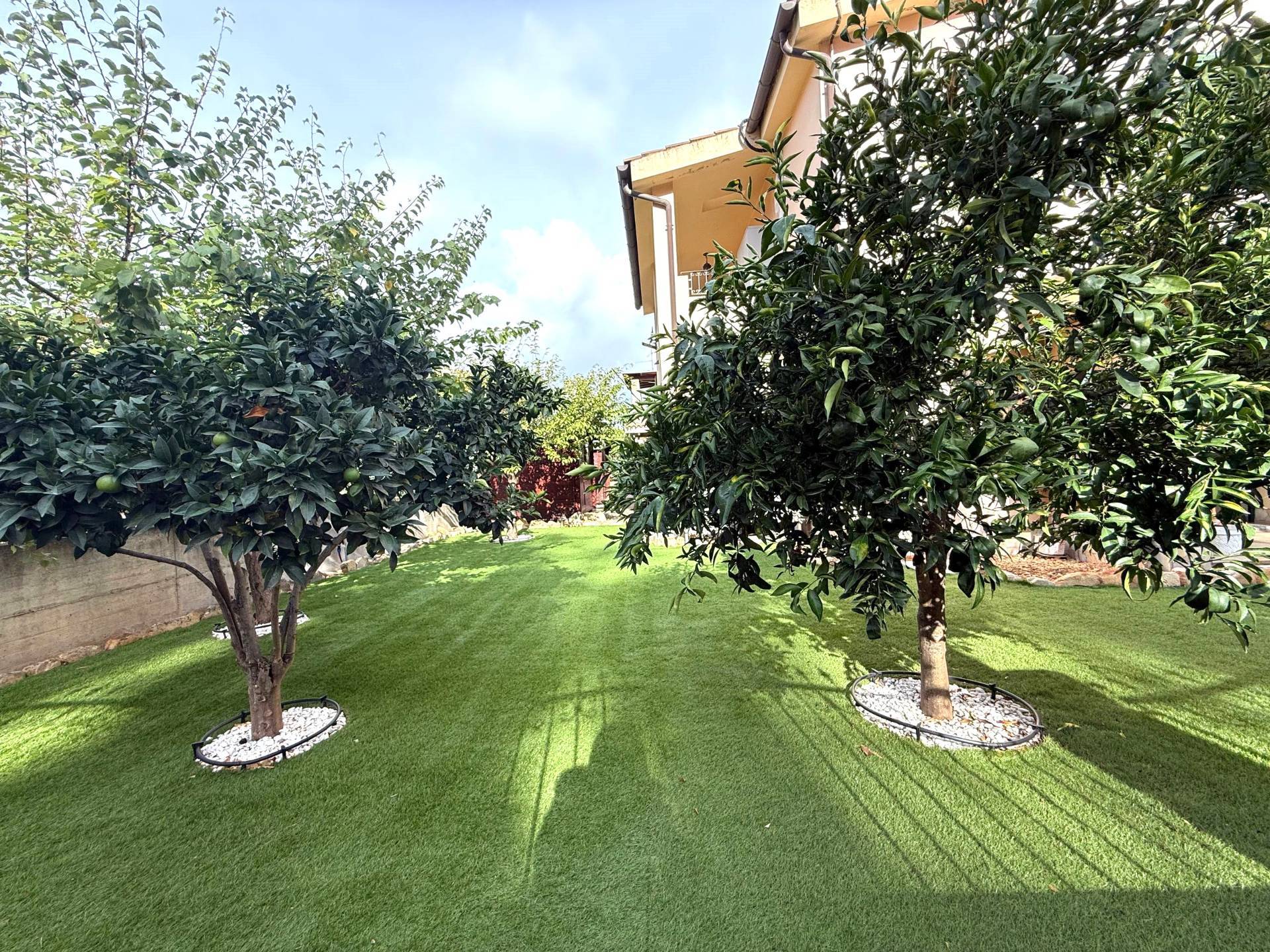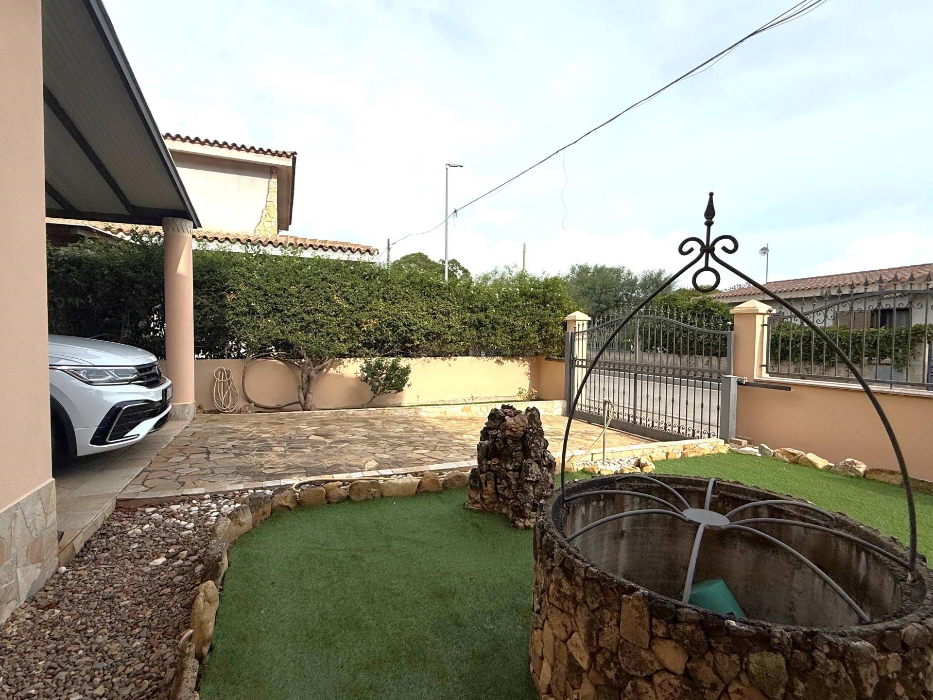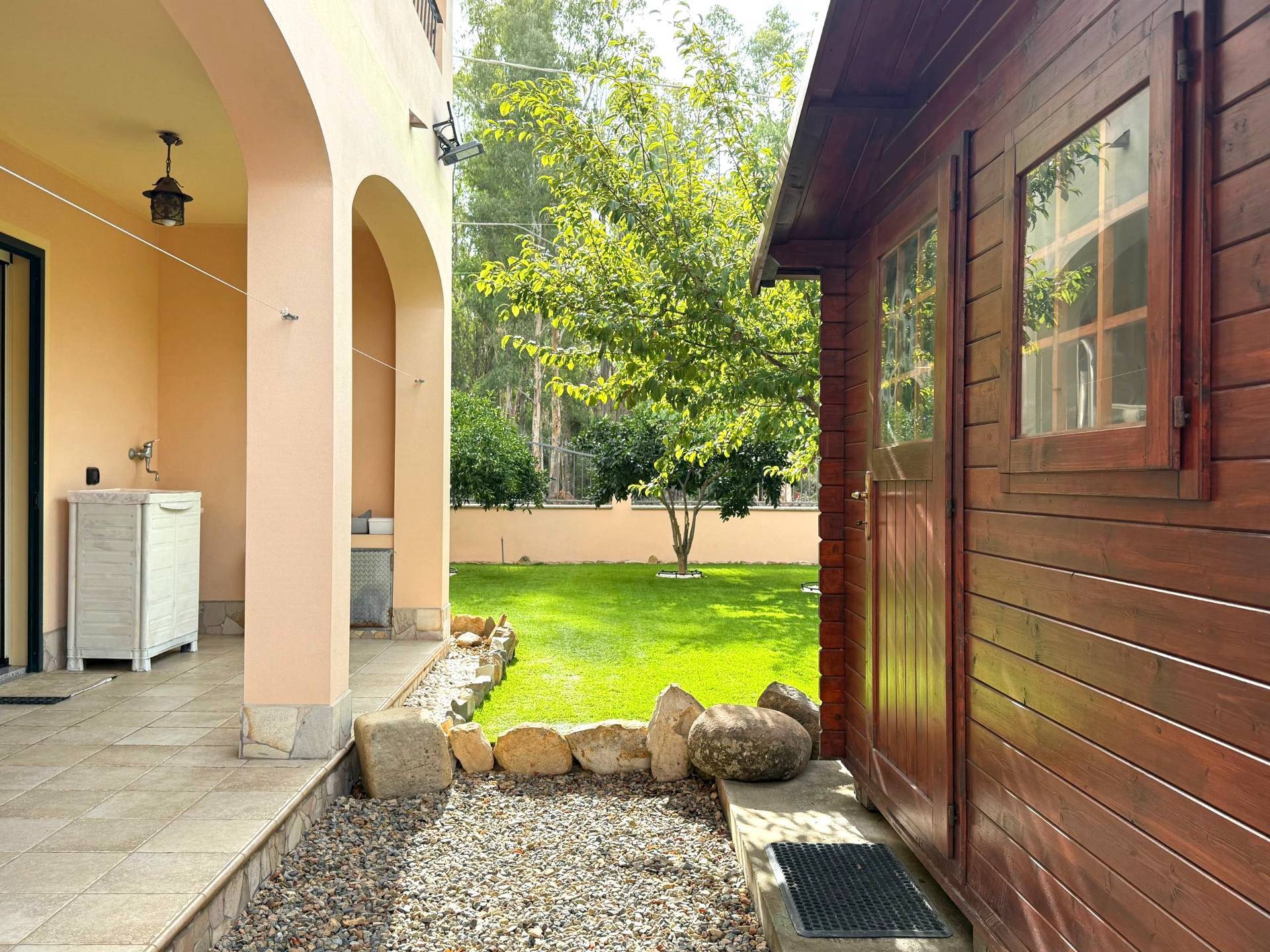 La proprietà è completamente recintata con muro perimetrale e ringhiera in ferro battuto, dotata di due ingressi pedonali e un accesso carrabile con cancello scorrevole. Il giardino, impreziosito da piante autoctone e alberi da frutto, offre una serie di comfort ideali per la vita all'aperto: