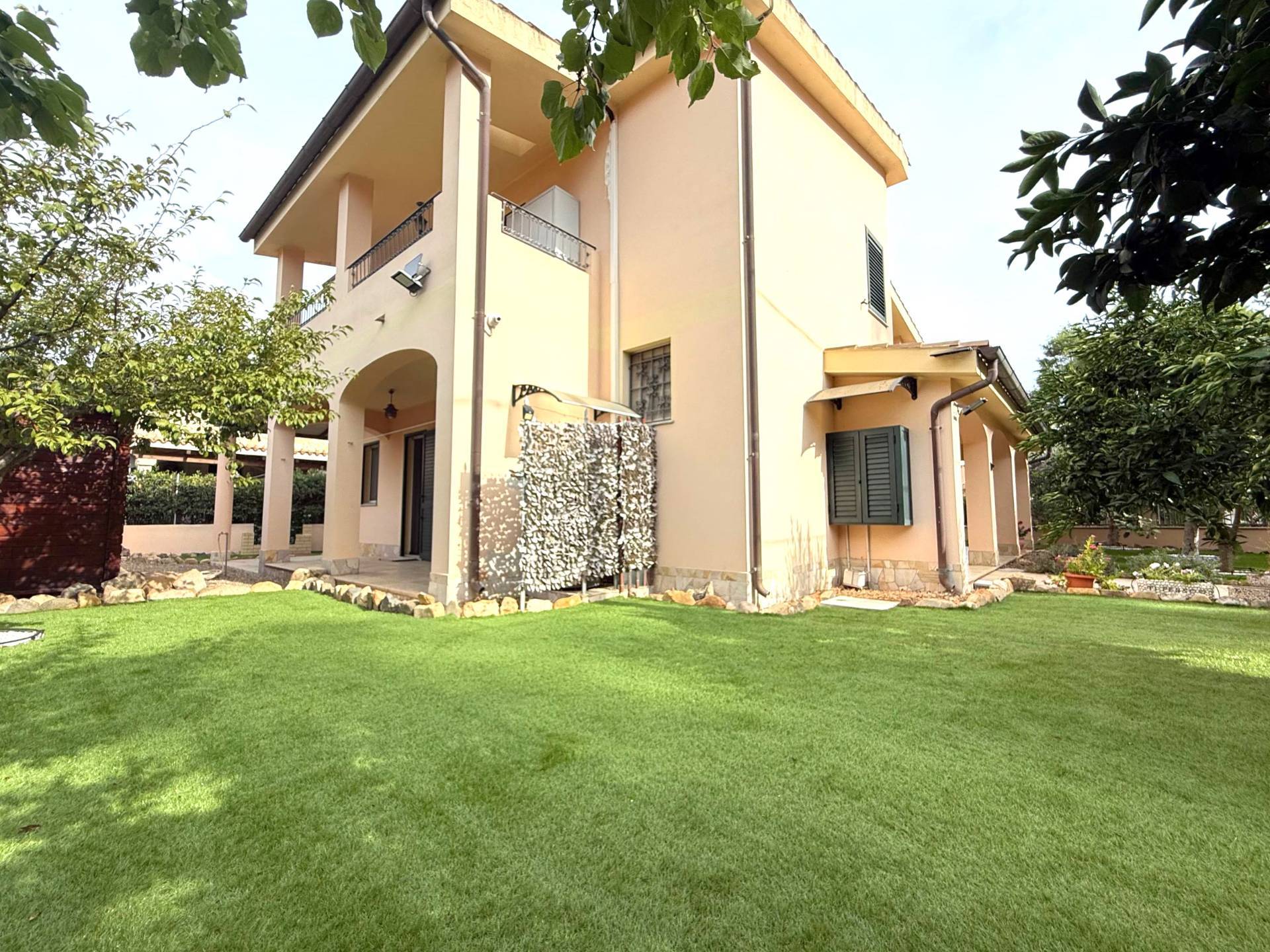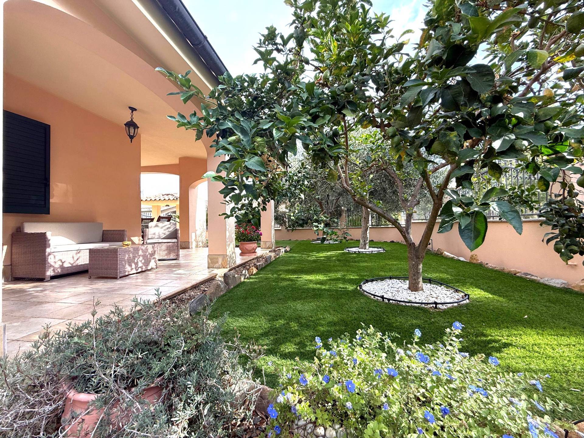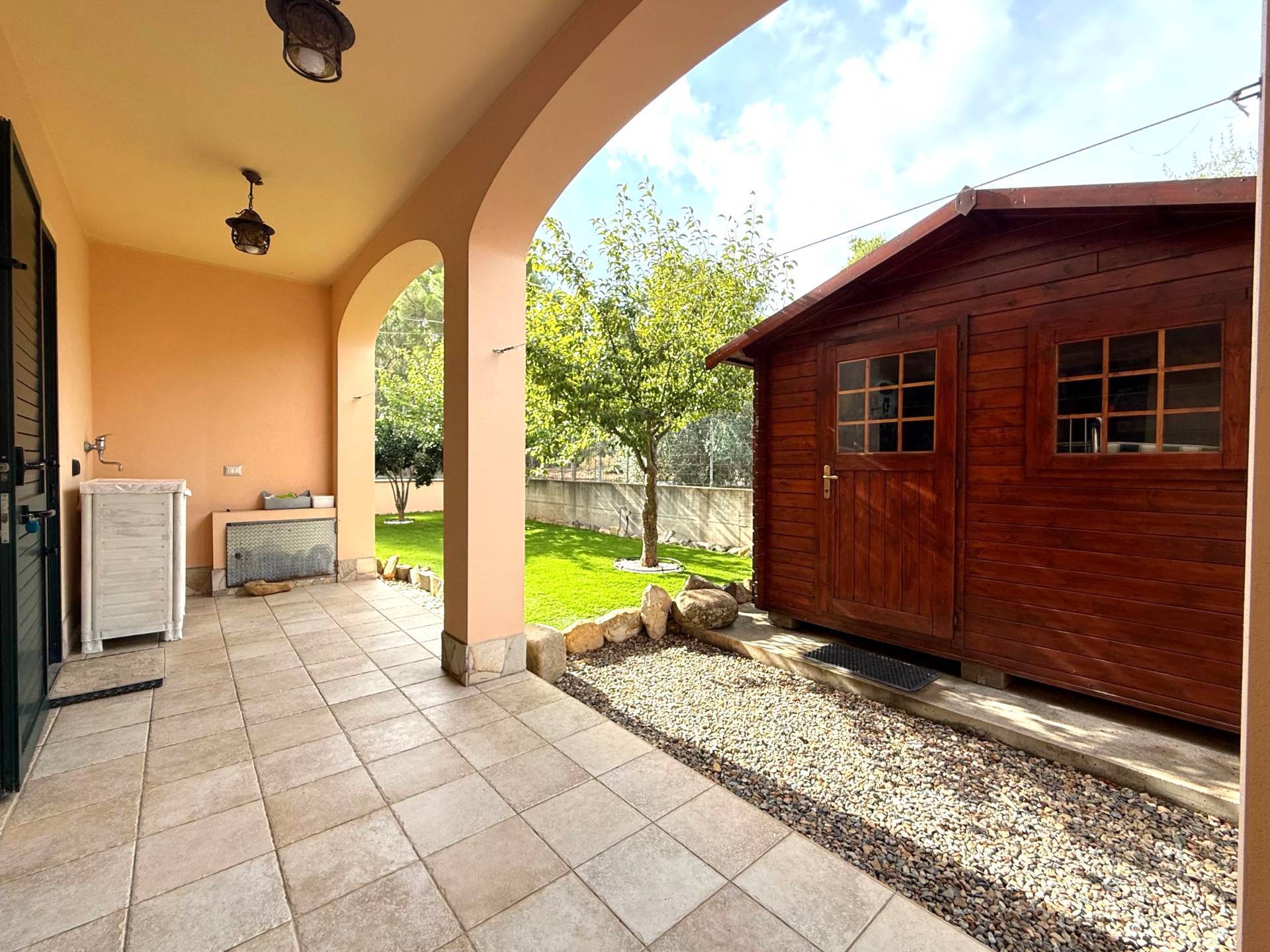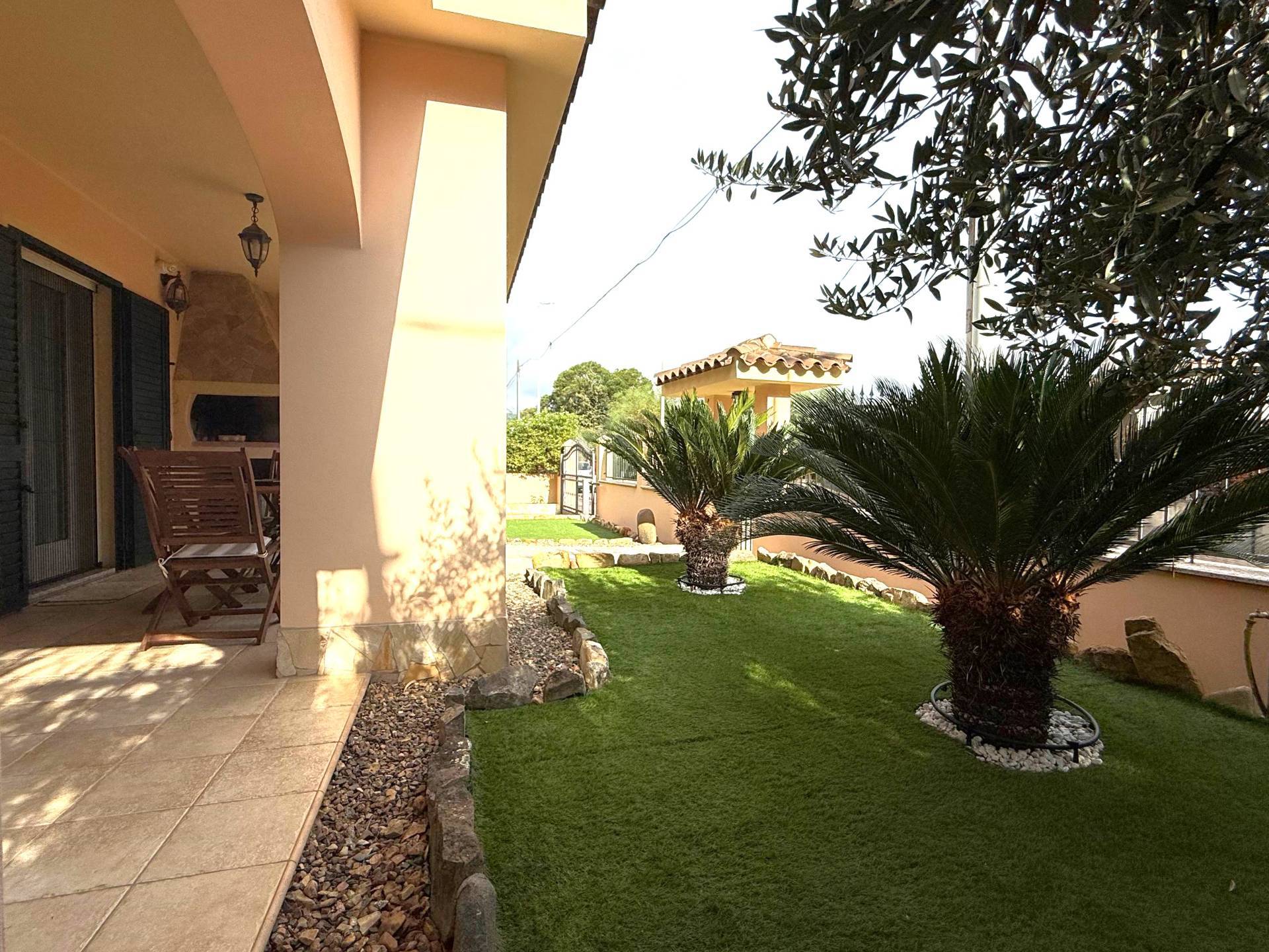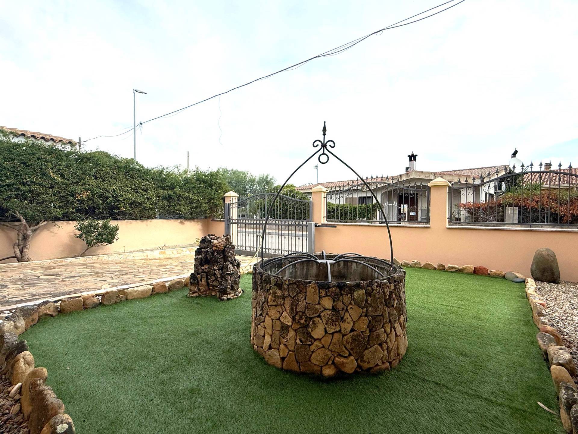 La proprietà è completamente recintata con muro perimetrale e ringhiera in ferro battuto, dotata di due ingressi pedonali e un accesso carrabile con cancello scorrevole. Il giardino, impreziosito da piante autoctone e alberi da frutto, offre una serie di comfort ideali per la vita all'aperto: