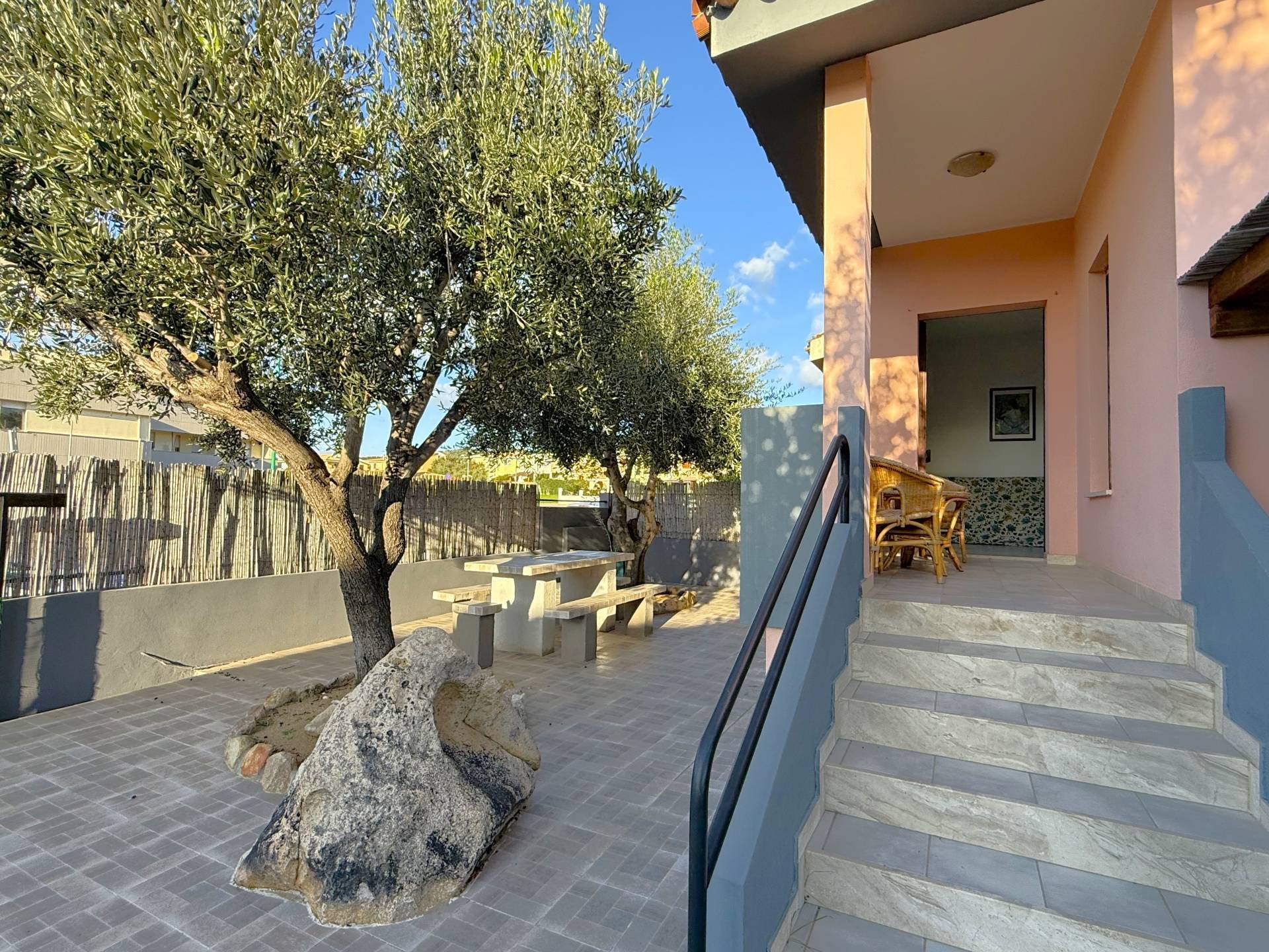 L'accesso è garantito dal cancello carrabile, seguito dal cortile lastricato privato, adornato con tavolo e panche in muratura, piante di ulivo, lavabo e doccia esterna.