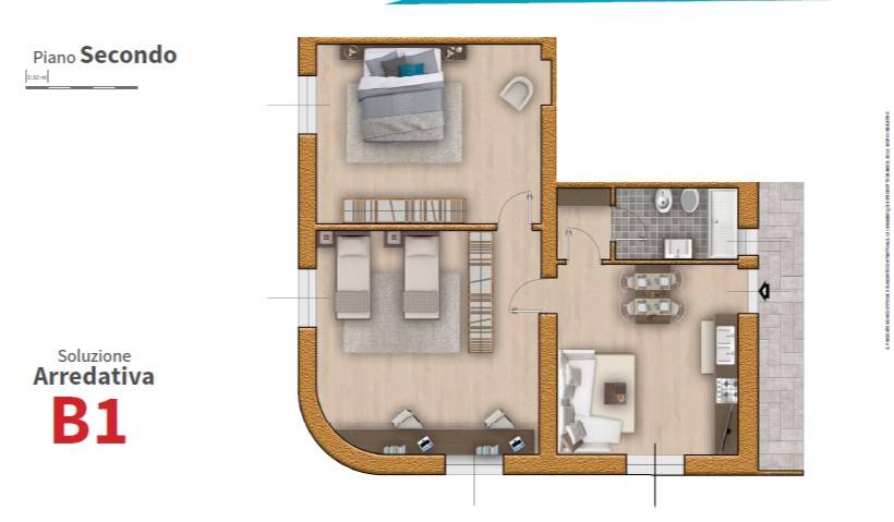 L'immobile è composto da ingresso su cucina/soggiorno, disimpegno e bagno con doccia, un ampio soggiorno e due camere da letto matrimoniali di ampie dimensioni;