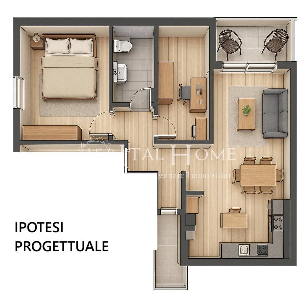 La proprietà è cosi composta: Ingresso, Soggiorno-Cucina, 2 camere da letto, bagno finestrato, ripostiglio/lavanderia e grande balconata con vista aperta sulla città