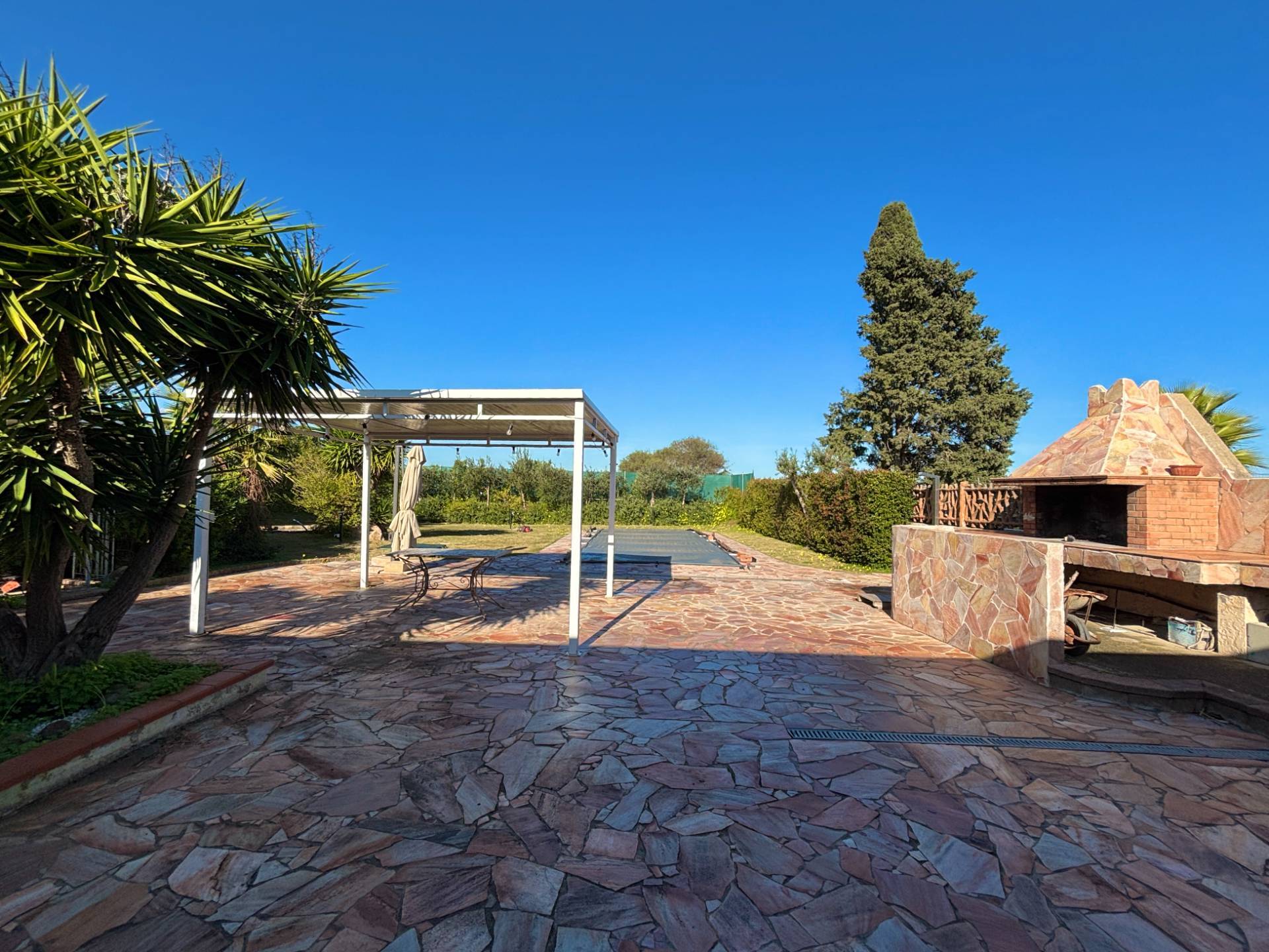 All'ingresso ti accoglie un ampio giardino curato, arricchito da palme, spazi verdi e un grande barbecue in muratura, perfetto per pranzi e cene all'aperto. A completare l'esterno, una grande piscina ideale per rilassarsi o trascorrere piacevoli momenti in compagnia. Gli spazi esterni, ampi e ben organizzati, sono l'ideale per chi ama vivere all'aria aperta.