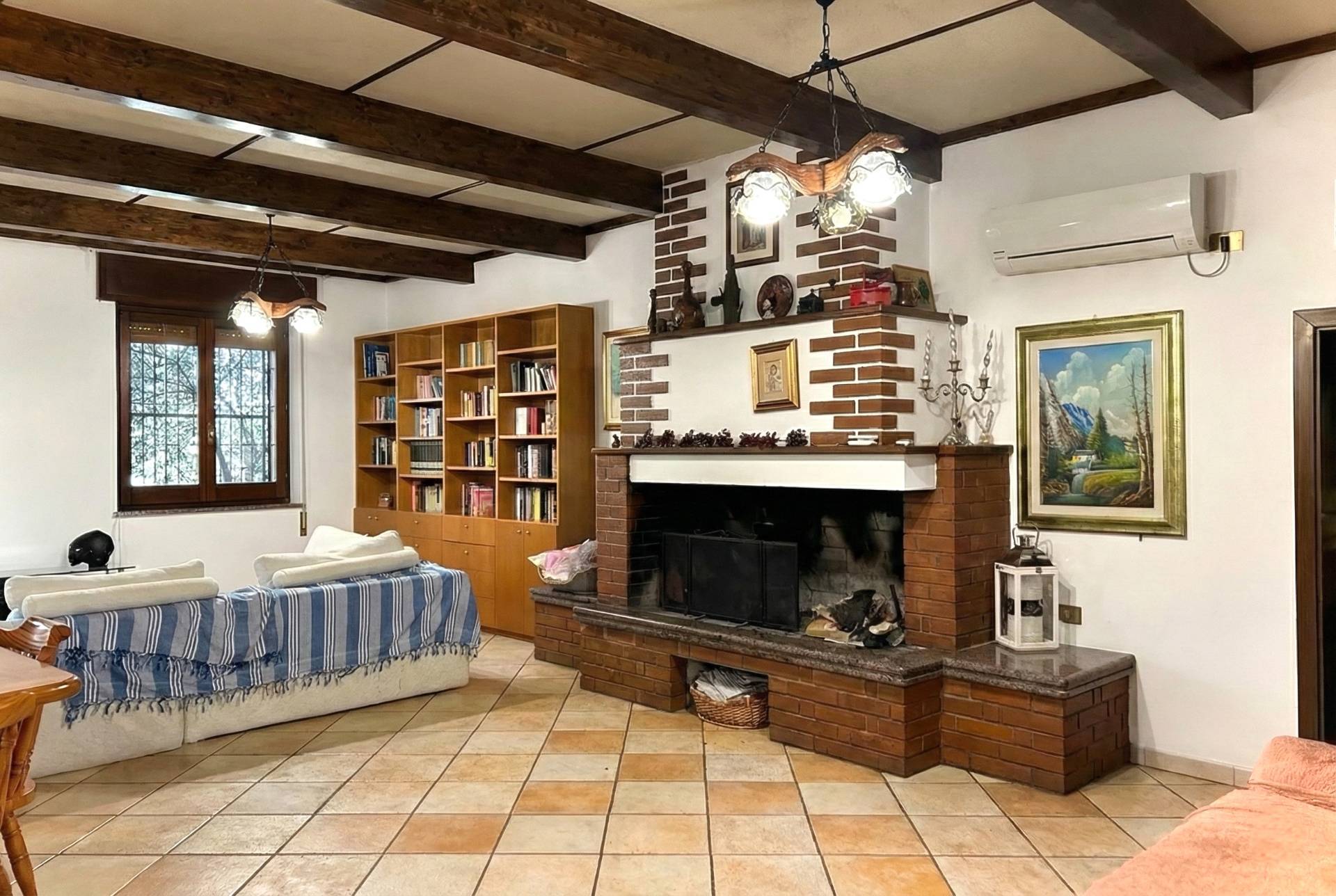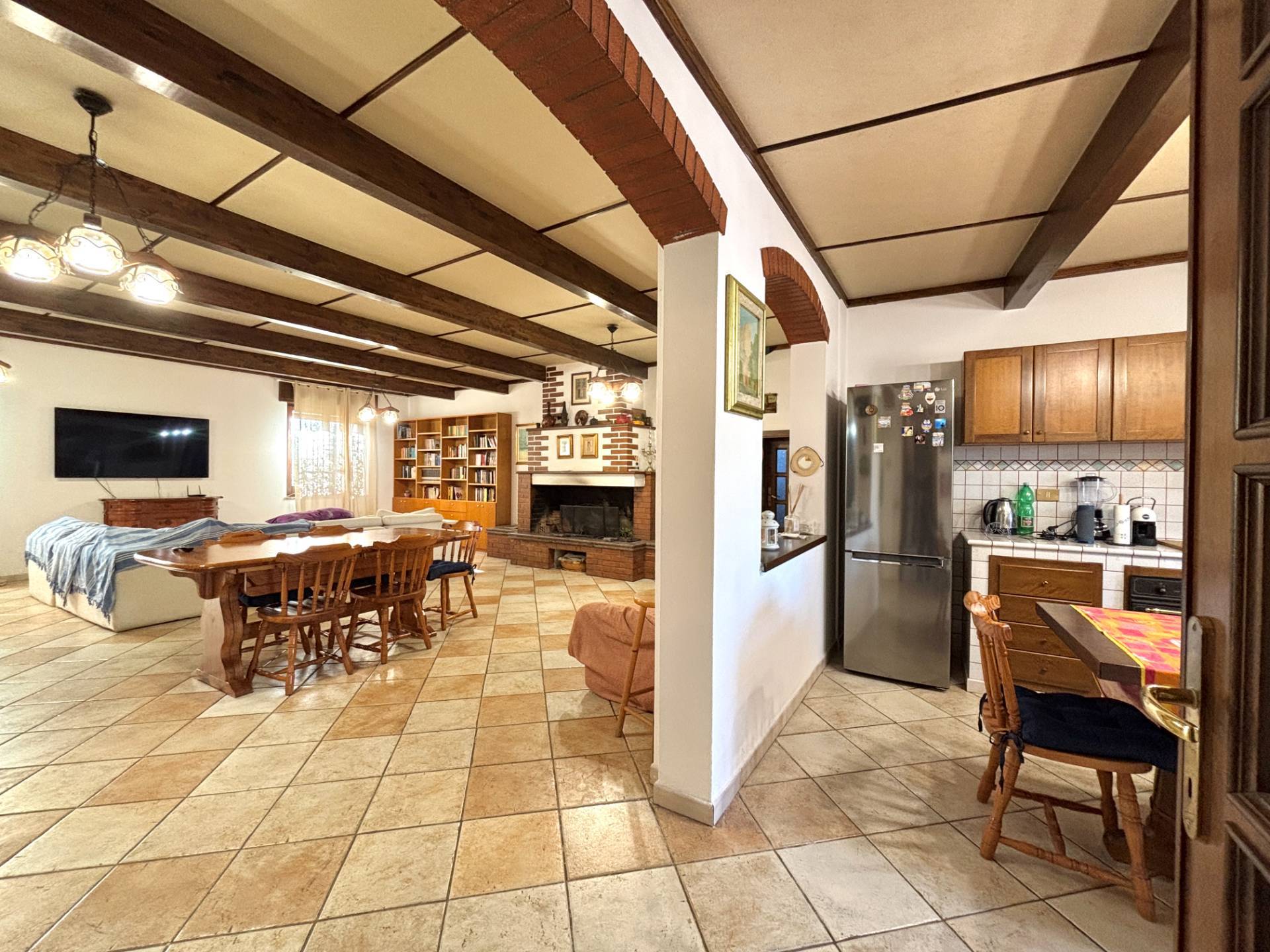 La casa si sviluppa interamente al piano terra: l'ingresso conduce alla zona giorno, ampia e luminosa, caratterizzata da travi a vista che conferiscono calore e personalità agli ambienti. Il grande caminetto e la stufa a pellet arricchiscono ulteriormente lo spazio, garantendo un'atmosfera accogliente e funzionale anche durante la stagione invernale.