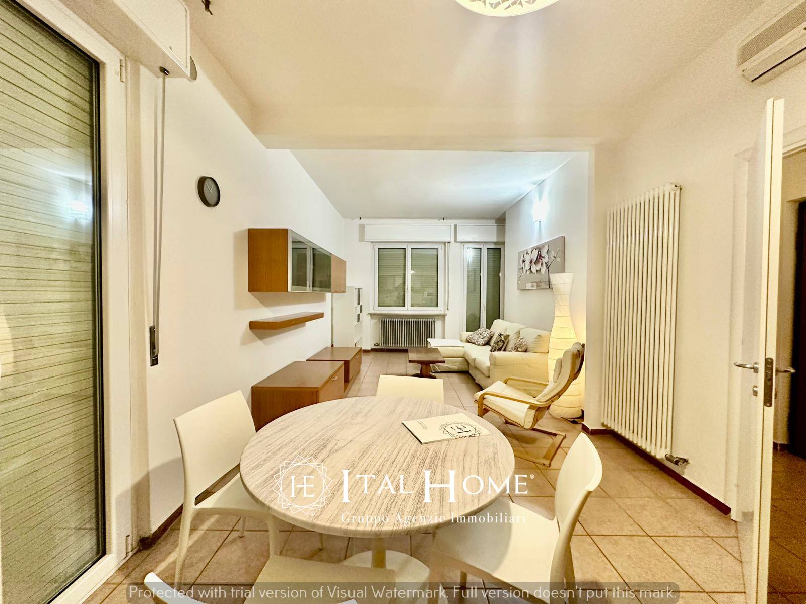 L'immobile è composto da: ingresso, zona living con cucina a vista, un ampio studio, 2 camere matrimoniali, un bagno finestrato con doccia, un ripostiglio e 2 balconi.