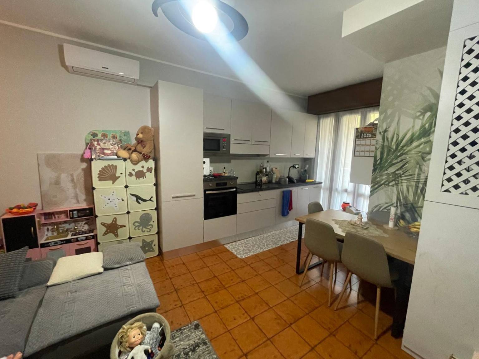L'ingresso si apre su un luminoso soggiorno con angolo cottura, arricchito da un gradevole terrazzino ideale per momenti di relax.