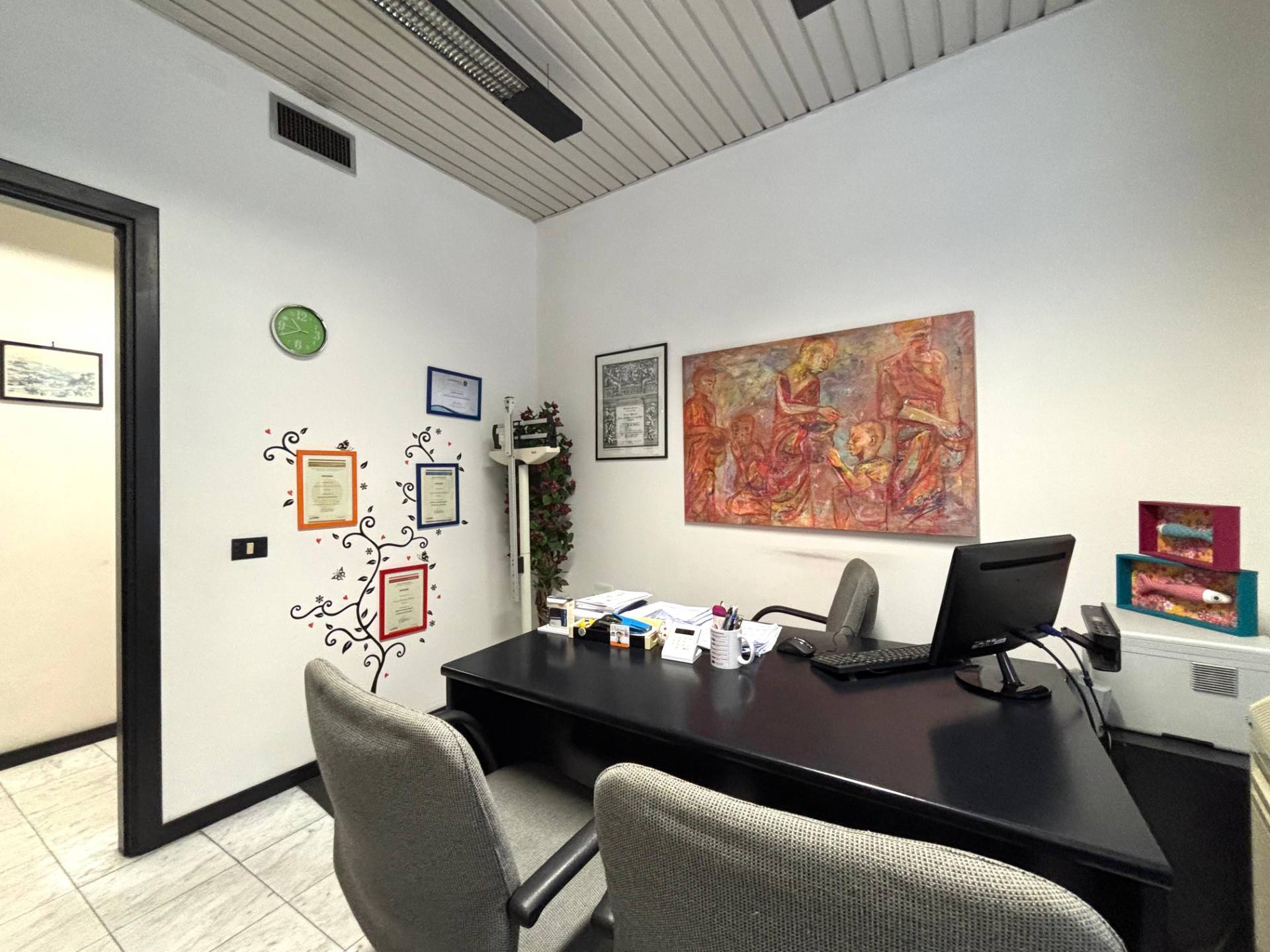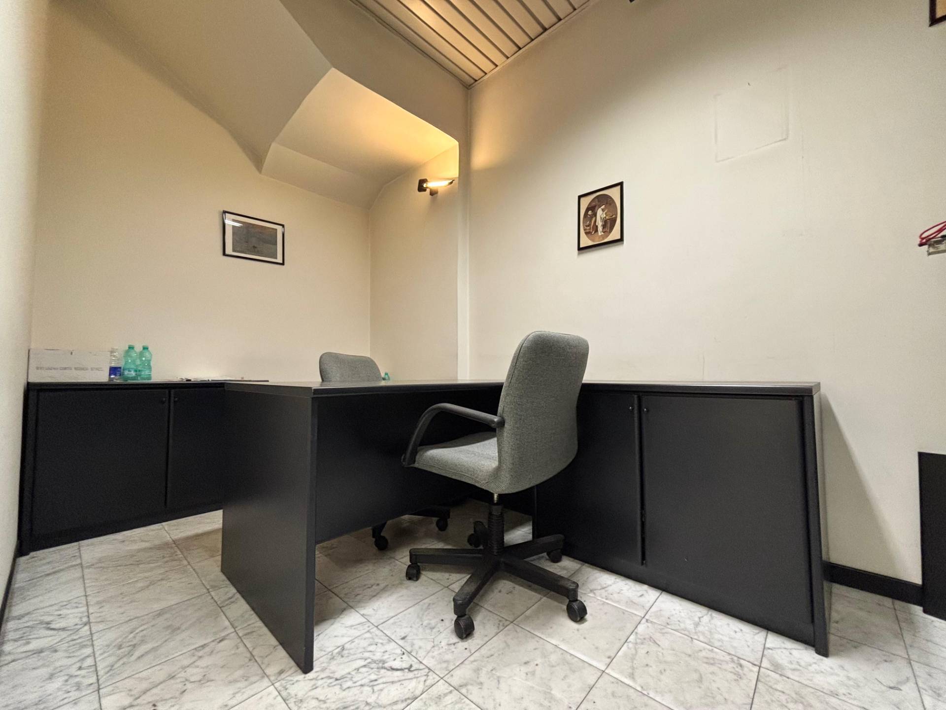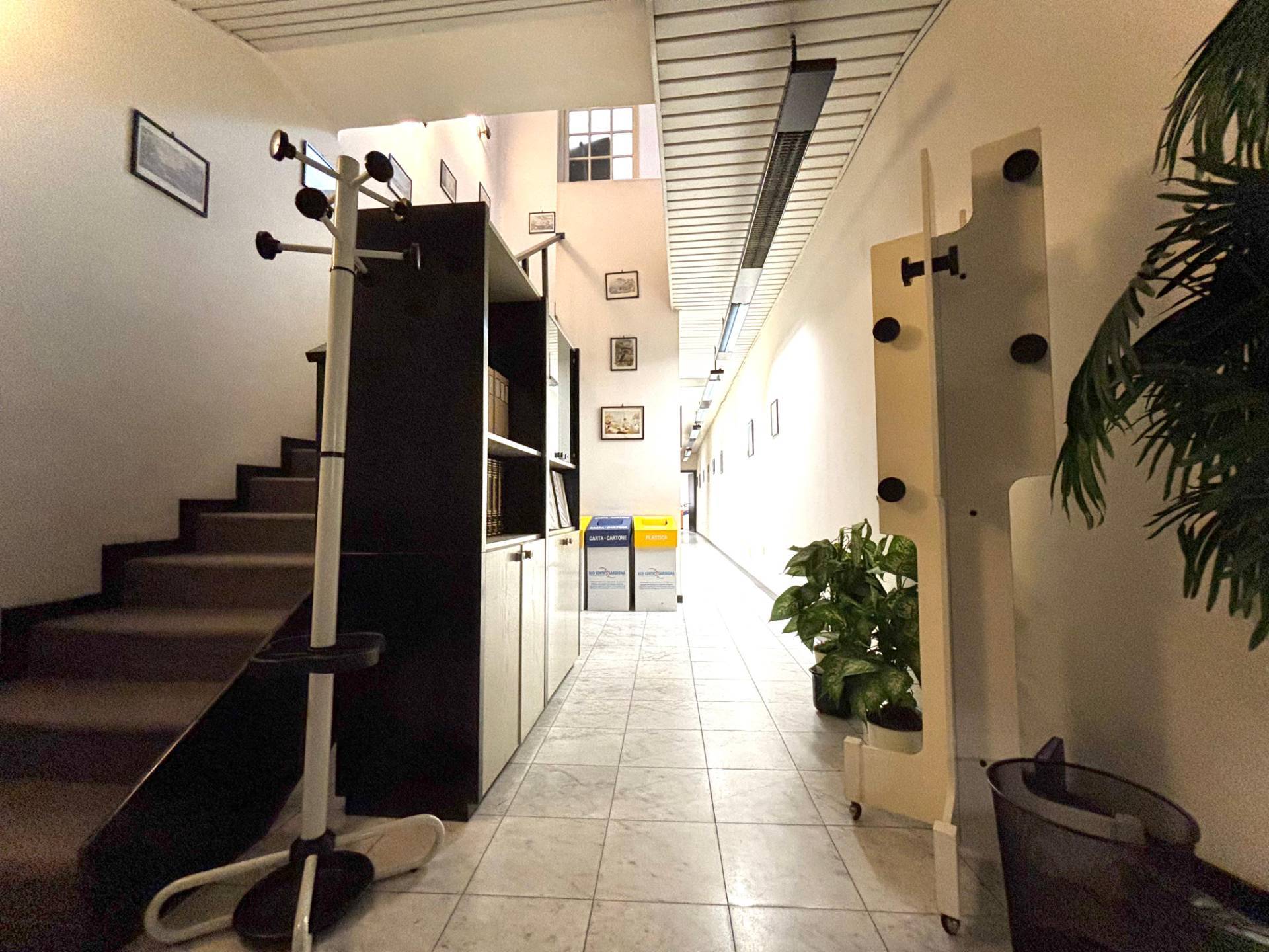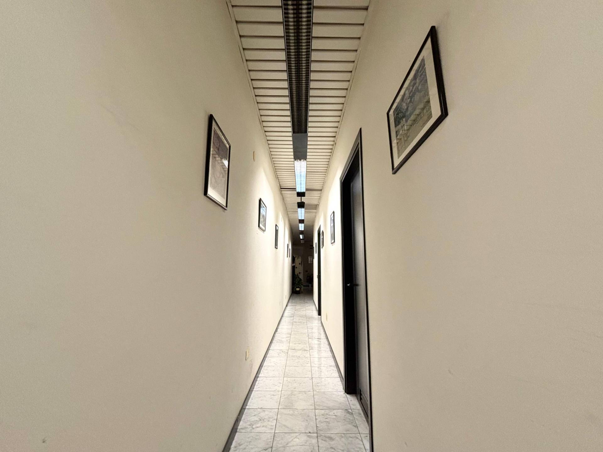 Al primo piano l'ingresso si apre su una spaziosa zona accoglienza ideale come reception o area di rappresentanza che introduce a tre camere finestrate sul lato sinistro particolarmente luminose, un lungo corridoio conduce a tre ambienti adibiti a zona deposito, un ulteriore vano spazioso e un wc.