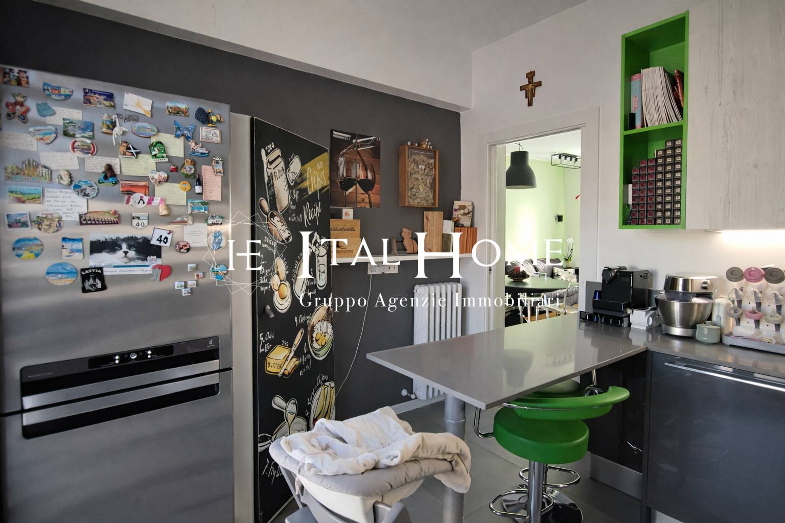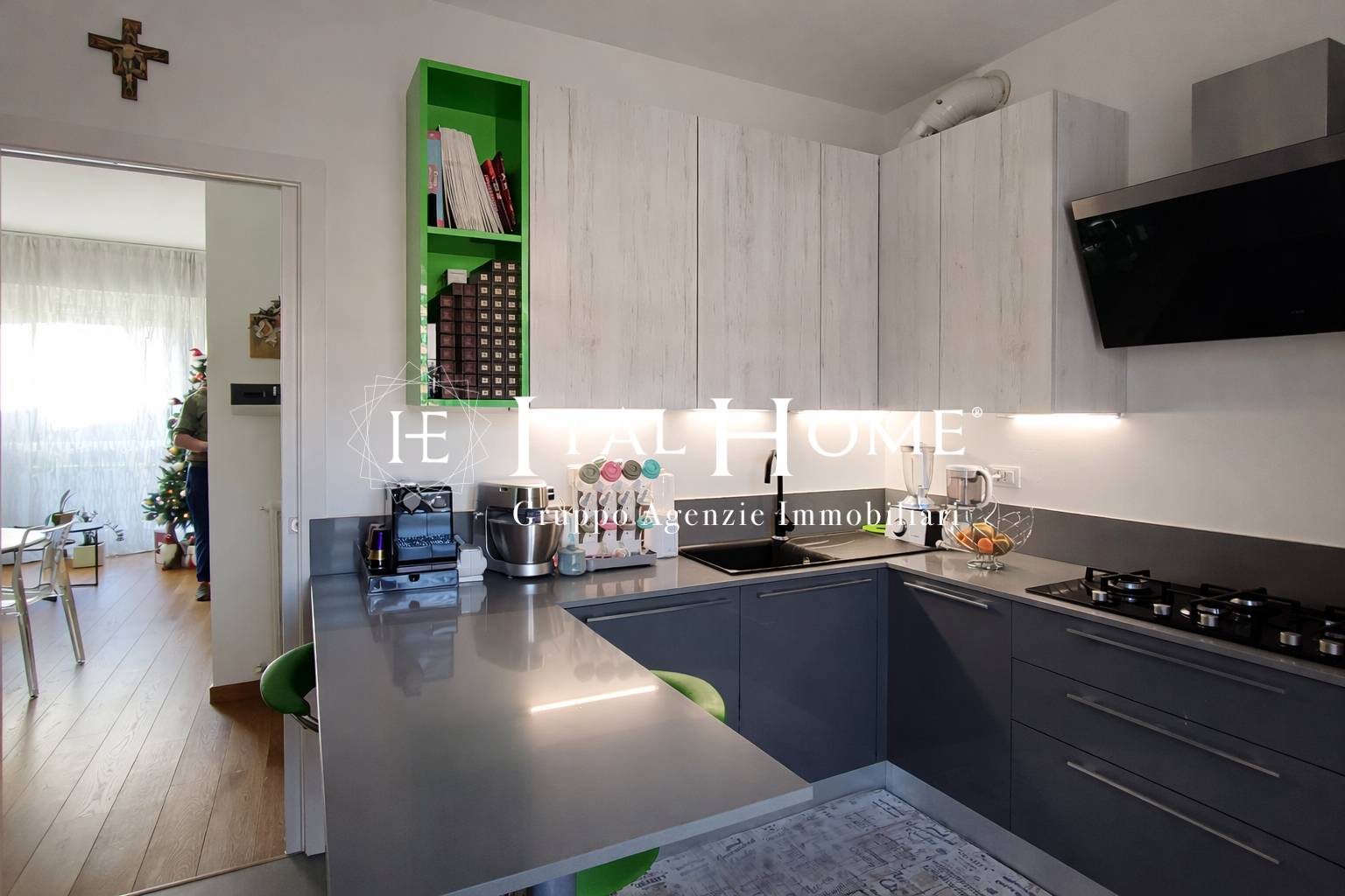 L'ingresso si apre su una splendida zona giorno, impreziosita da un'ampia portafinestra che garantisce luce naturale per tutta la giornata e permette di godere della vista aperta e panoramica sul paese. Il soggiorno si integra perfettamente con la cucina separata ideale per la convivialità e la vita quotidiana.