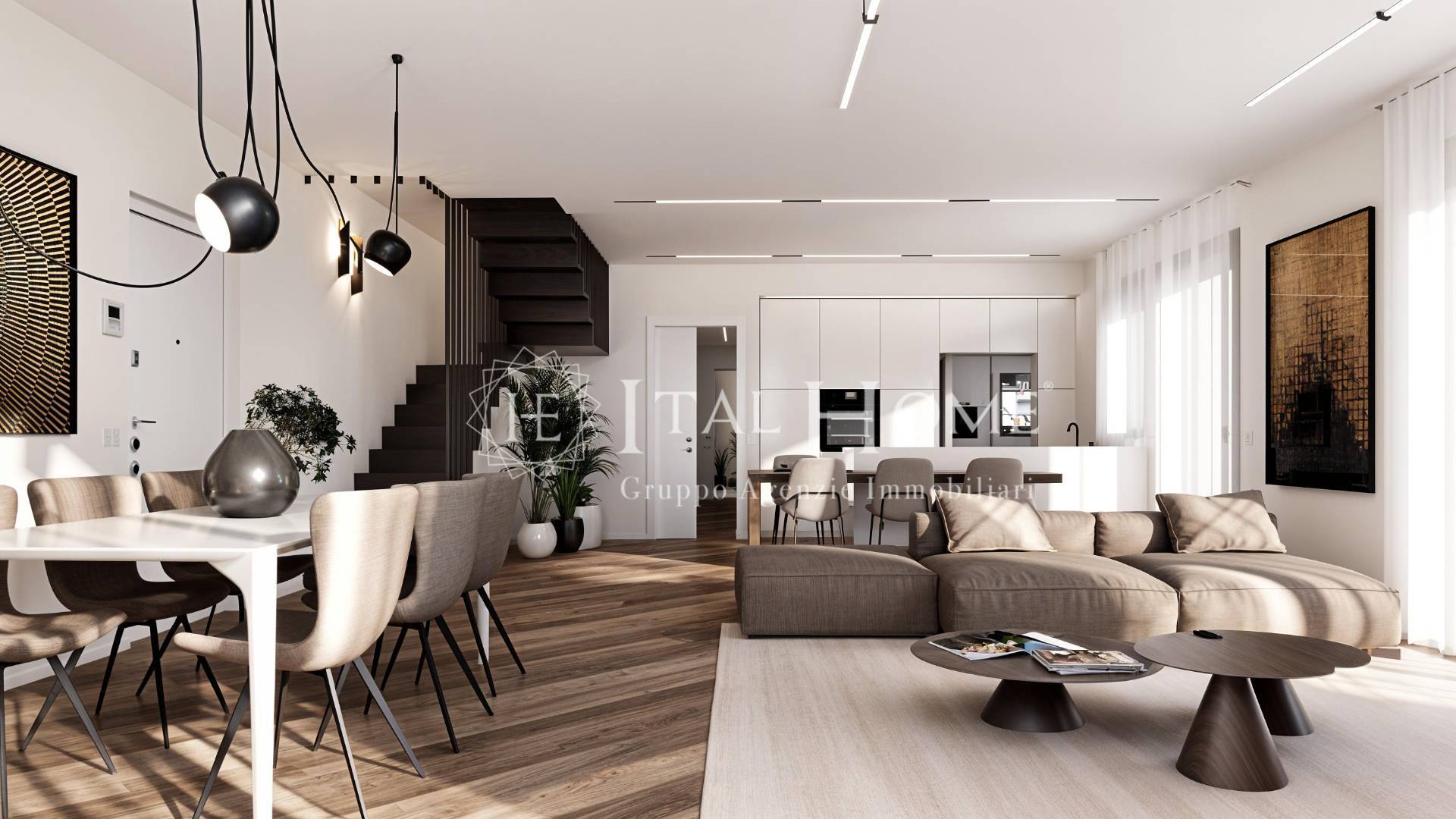 L'attico si dispone nel seguente modo: 170 mq, cosi suddivisi: Ingresso, Grandissimo Soggiorno con meravigliosa vetrata che da accesso alla terrazza stellare, che abbraccia su 2 lati l'immobile, Sala Pranzo, Cucina con isola molto spaziosa e luminosa ( tutta la zona giorno, ovvero cucina-sala pranzo-soggiorno hanno vista, da cartolina, sulla storica e magnifica Città Alta), Camera da letto matrimoniale, con proprio bagno finestrato, seconda camera da letto matrimoniale, con bagno privato finestrato e terrazza privata, (possibilità vasca jacuzzi/idromassaggio), studio finestrato, due cabine armadio Men/Woman, dalla zona giorno, con una maestosa scala di design, a vista, si accede allo "Skyline Suite", dove si contraddistingue per la sua incantevole vista su tutta la città e città alta, travi a vista in legno e terrazza con possibilità di zona solarium.