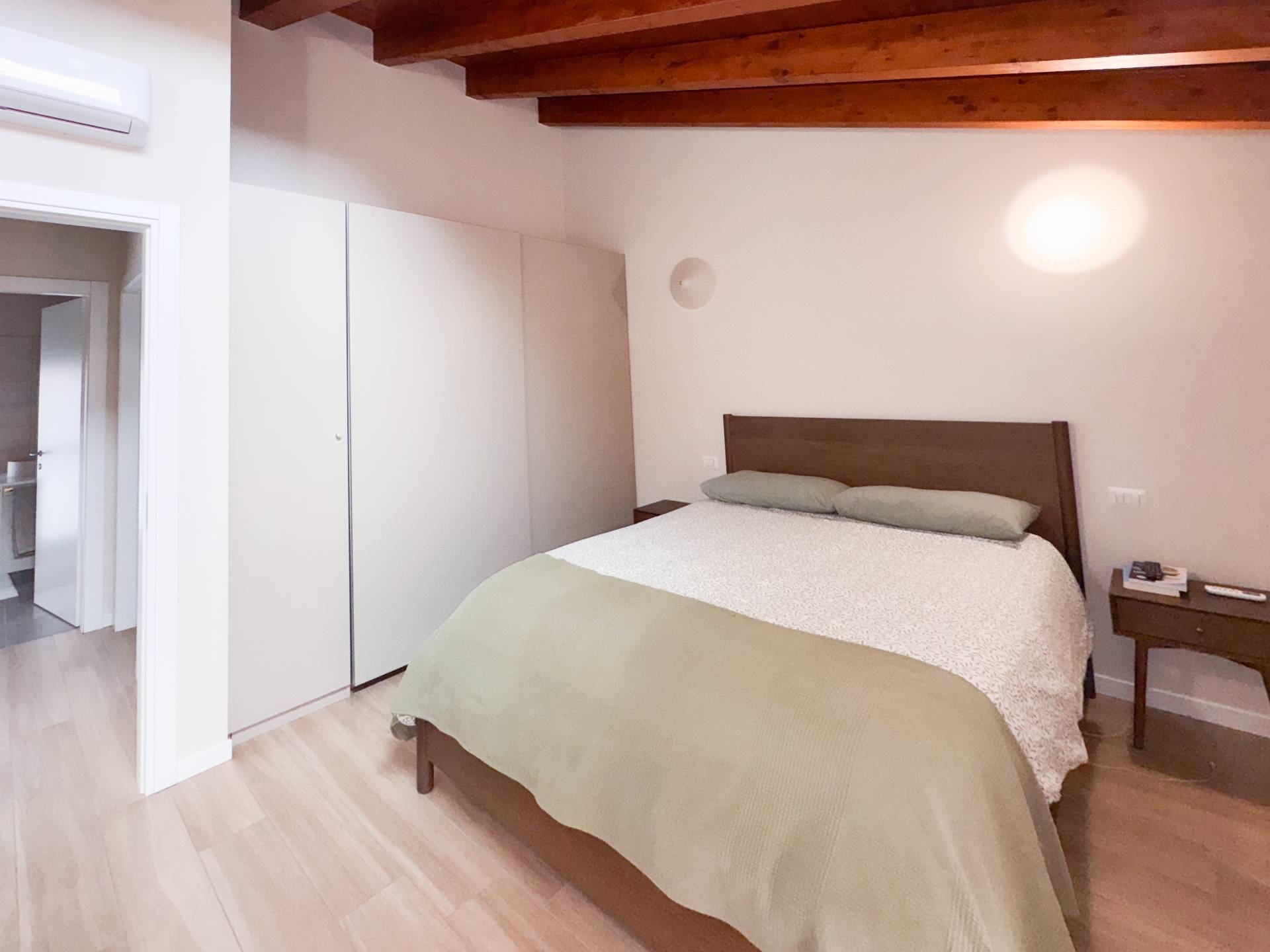 Dal soggiorno, attraverso una scala in marmo, si accede al piano superiore, caratterizzato da travi a vista e da una notevole luminosità garantita da grandi vetrate. La zona notte ospita una camera matrimoniale con accesso a una loggetta, una seconda camera singola attualmente adibita a cabina armadio e un secondo bagno, arredato con cura e dotato di ampia doccia. In tutti gli ambienti sono presenti pavimenti in ceramica di prima scelta effetto parquet in rovere chiaro.