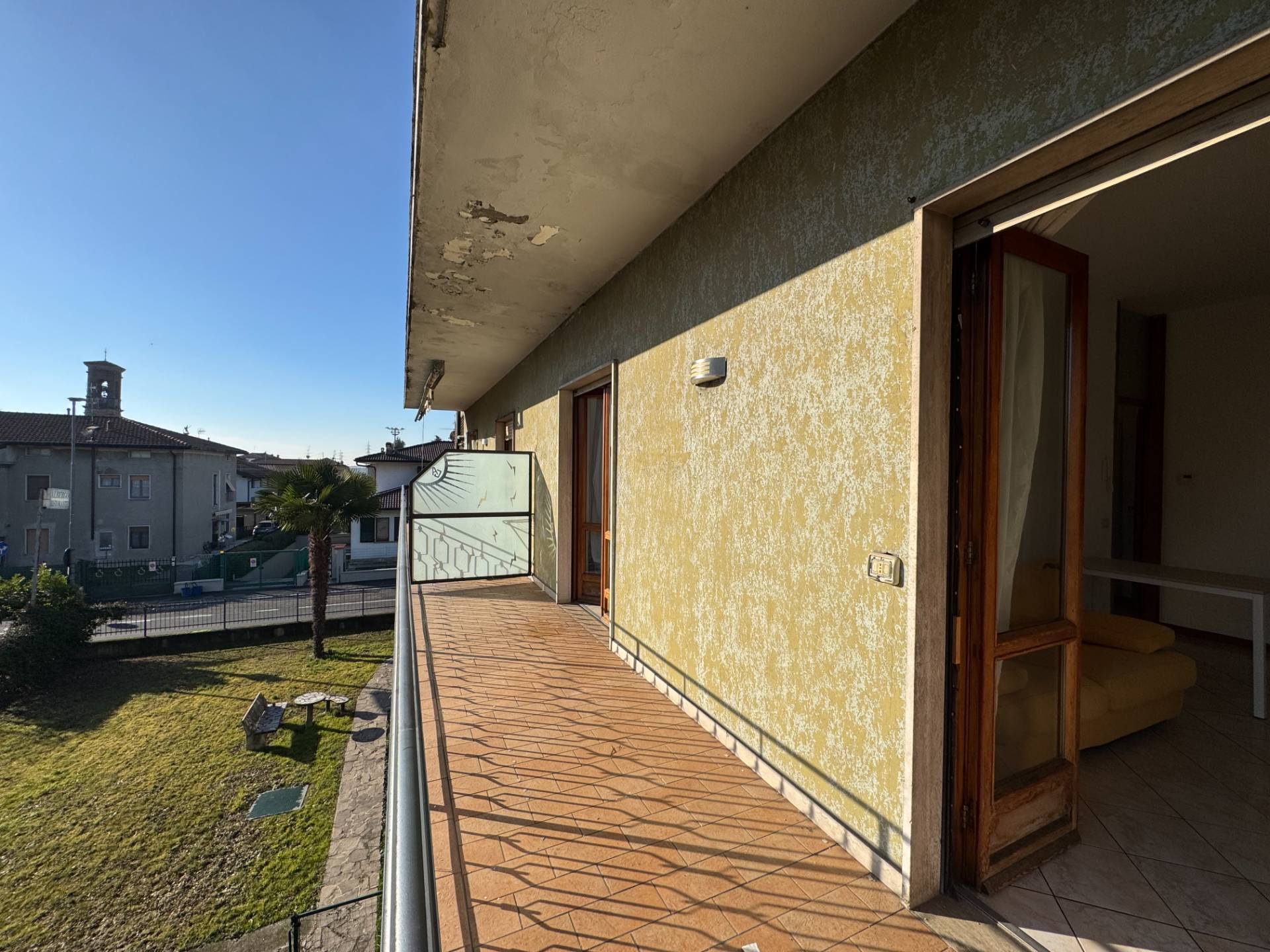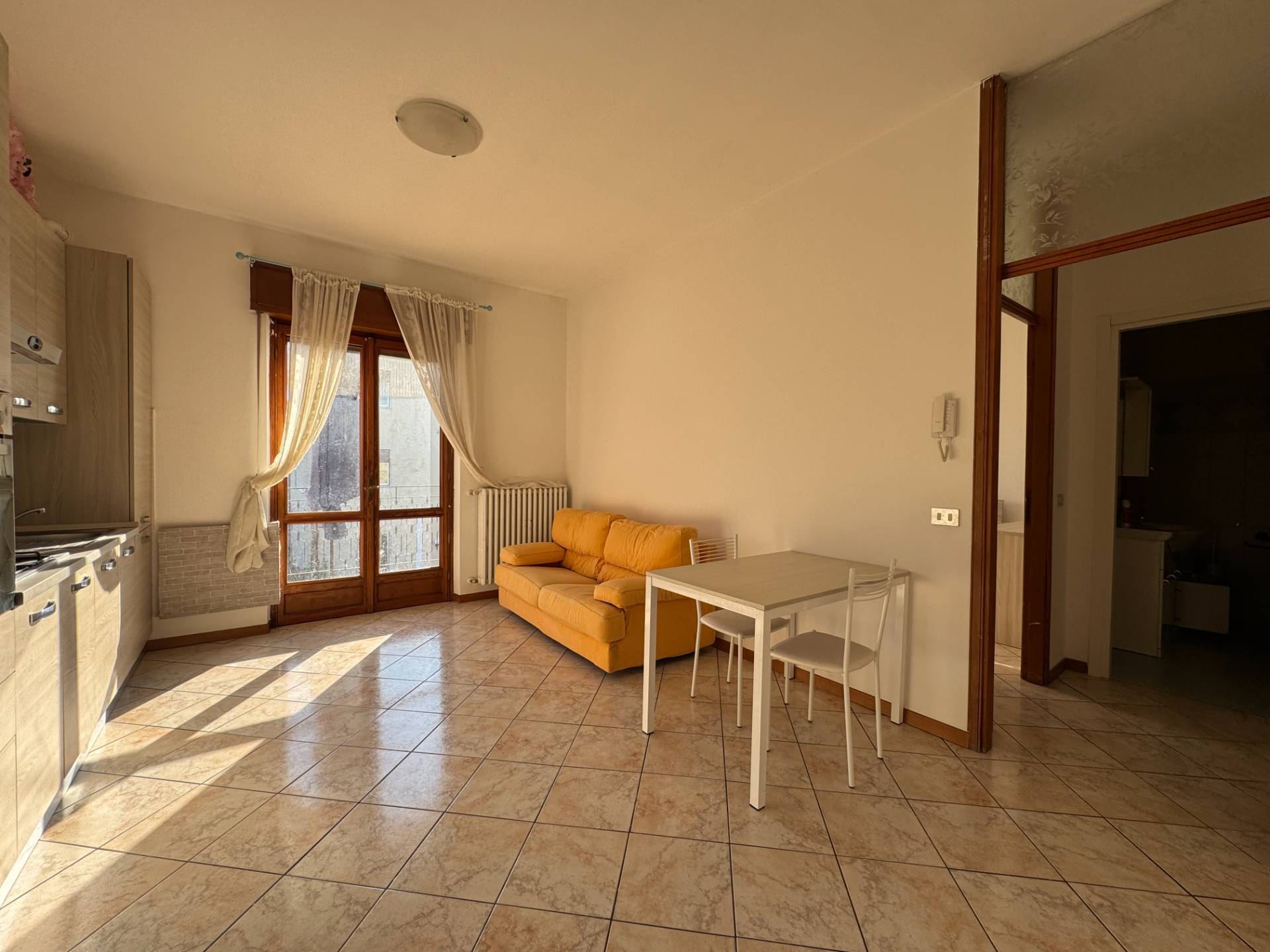 L'appartamento è composto dalla sala con cucina open-space dal quale abbiamo un comodo accesso al terrazzo, abbastanza profondo per mangiare fuori d'estate e prendere il sole.