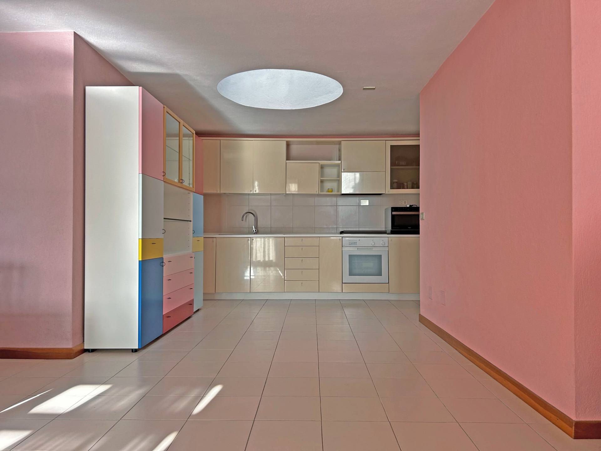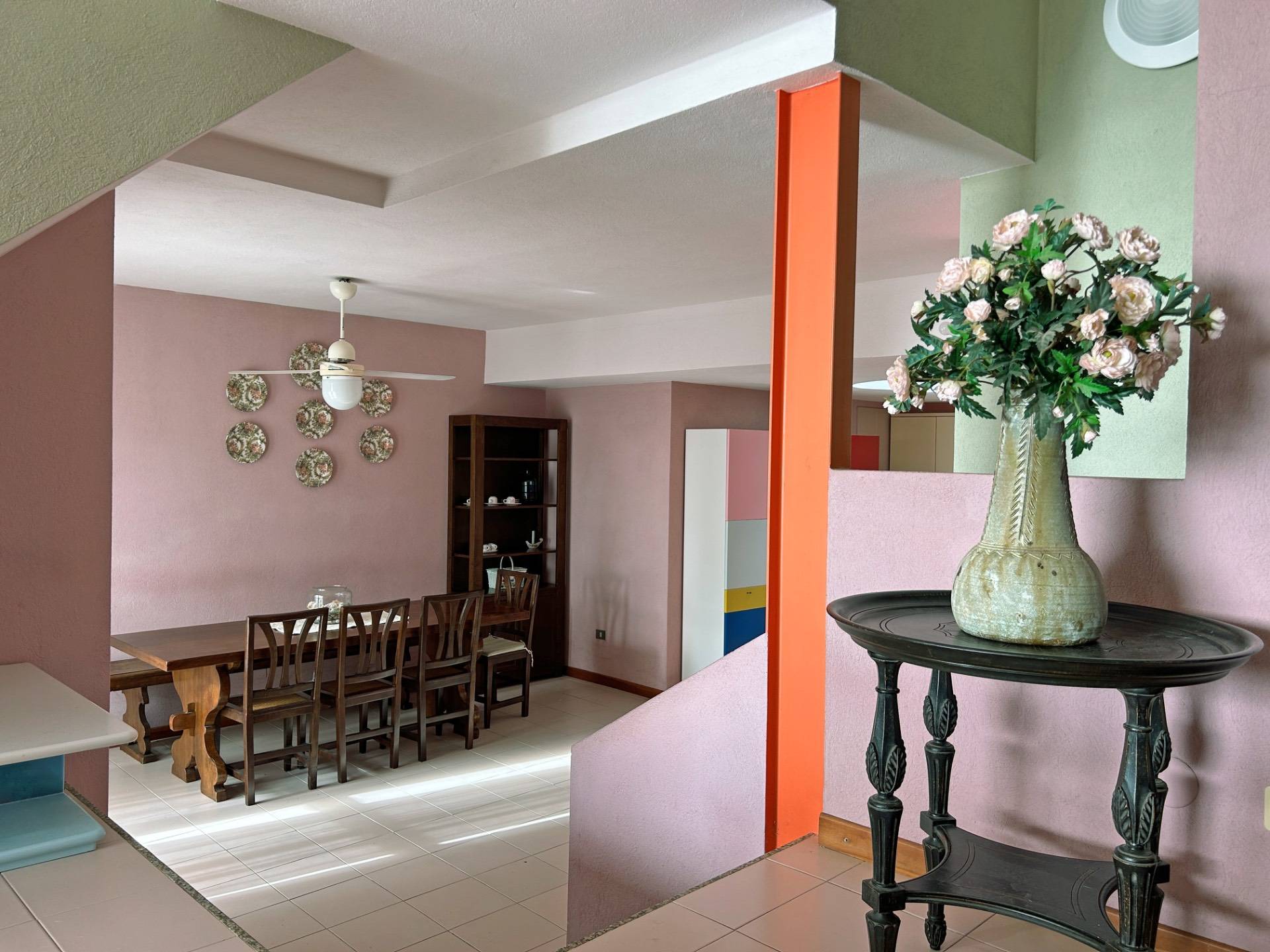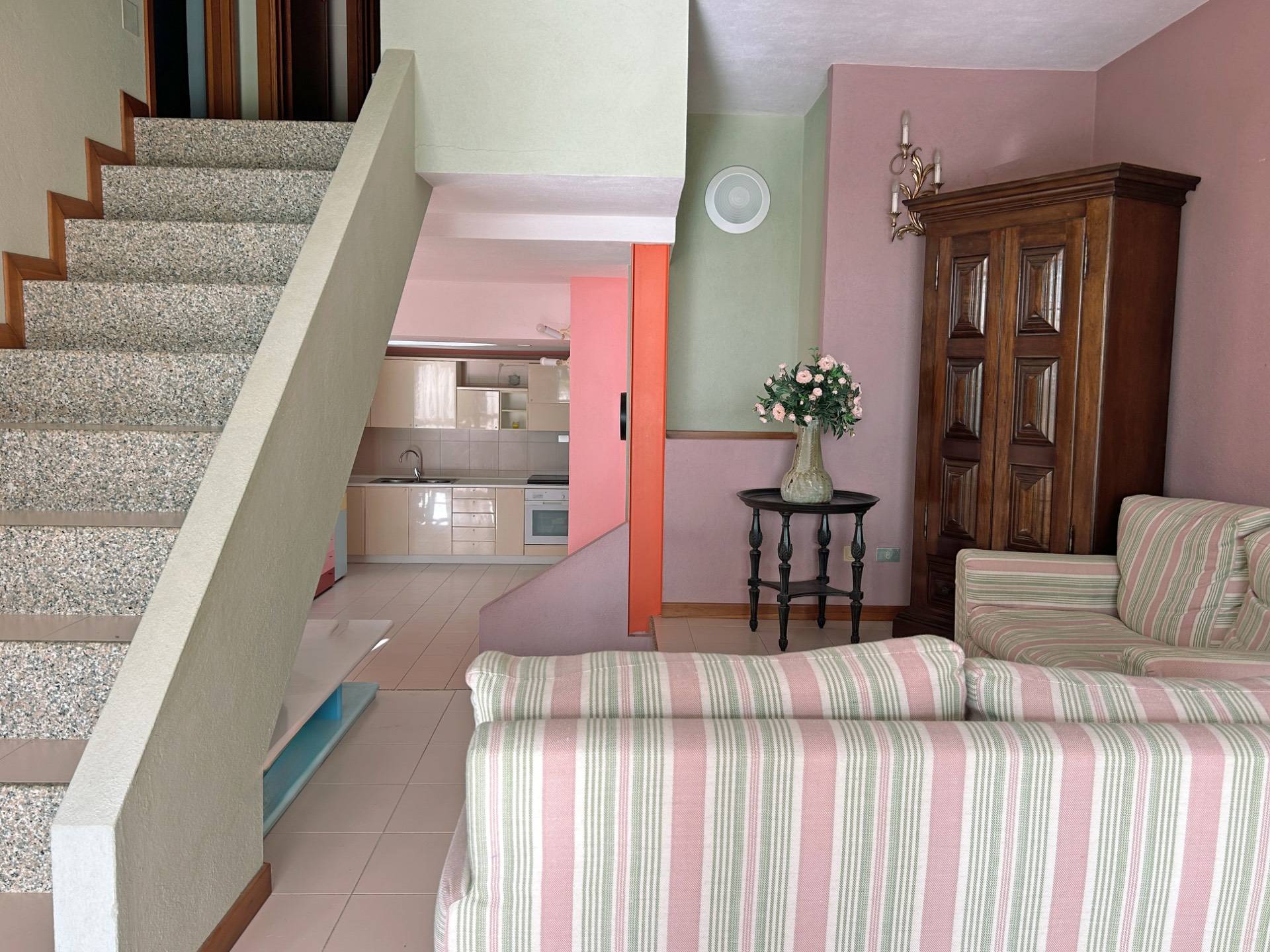 La zona giorno open space su due livelli rappresenta il cuore della casa: un ambiente elegante e fluido che unisce cucina, area pranzo e soggiorno in un'unica esperienza abitativa.