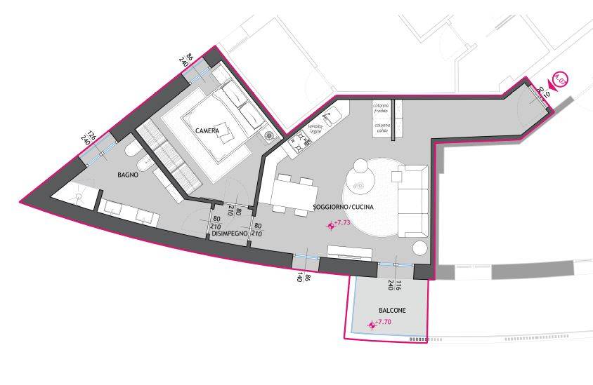 Appartamento A07 - 2: ampio appartamento Bilocale con 5 mq di terrazza privata. Composto da: ingresso, spazioso soggiorno con cucina a vista, disimpegno notte, bagno e una camera da letto matrimoniale.
