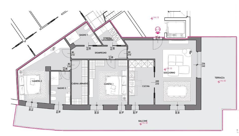 -Appartamento A15-4: grande attico trilocale di 160 mq con 70 mq di terrazza, composto da: ingresso, ampio salone, cucina abitabile, disimpegno notte, doppi servizi, una lavanderia, 2 camere matrimoniali, una spaziosa cabina armadio e la meravigliosa, panoramica terrazza di 70mq.
