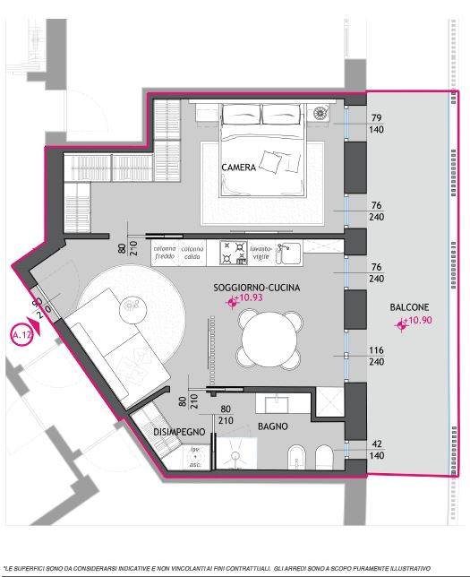 Appartamento A12 - 3: ampio appartamento Bilocale con 17 mq di terrazza privata. Composto da: ingresso, spazioso soggiorno con cucina a vista, disimpegno notte, bagno e una camera da letto matrimoniale con cabina armadio.