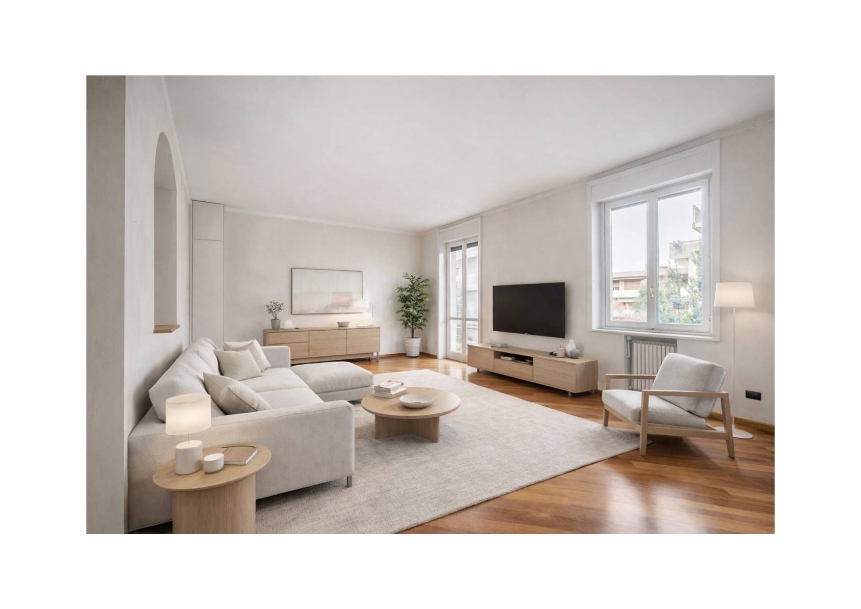 Completano la proprietà le pertinenze esterne, costituite da un terrazzo e due balconi, per un totale di 30mq, oltre alla cantina, al solaio e ad un'autorimessa, molto ampia, quasi doppia.